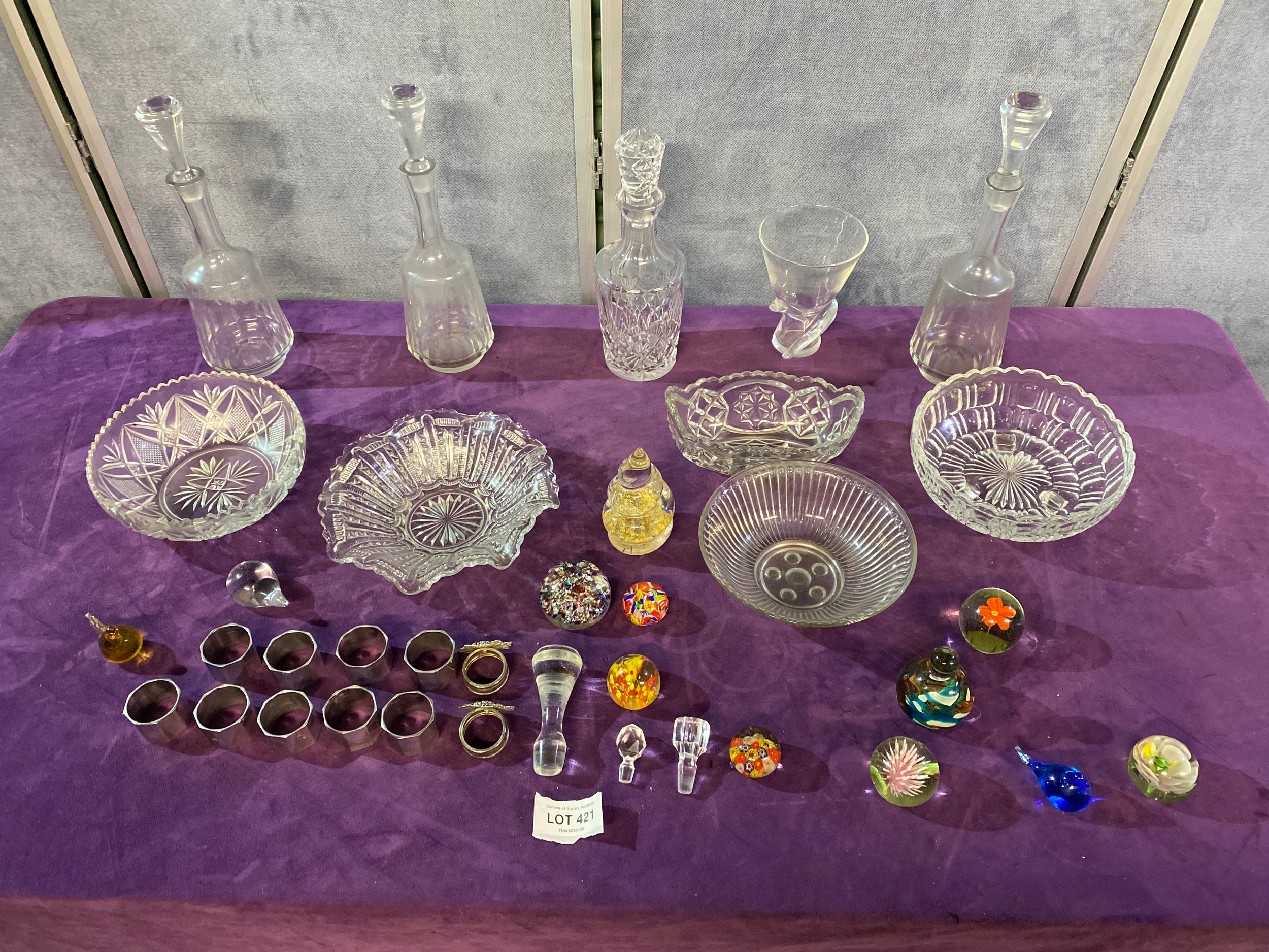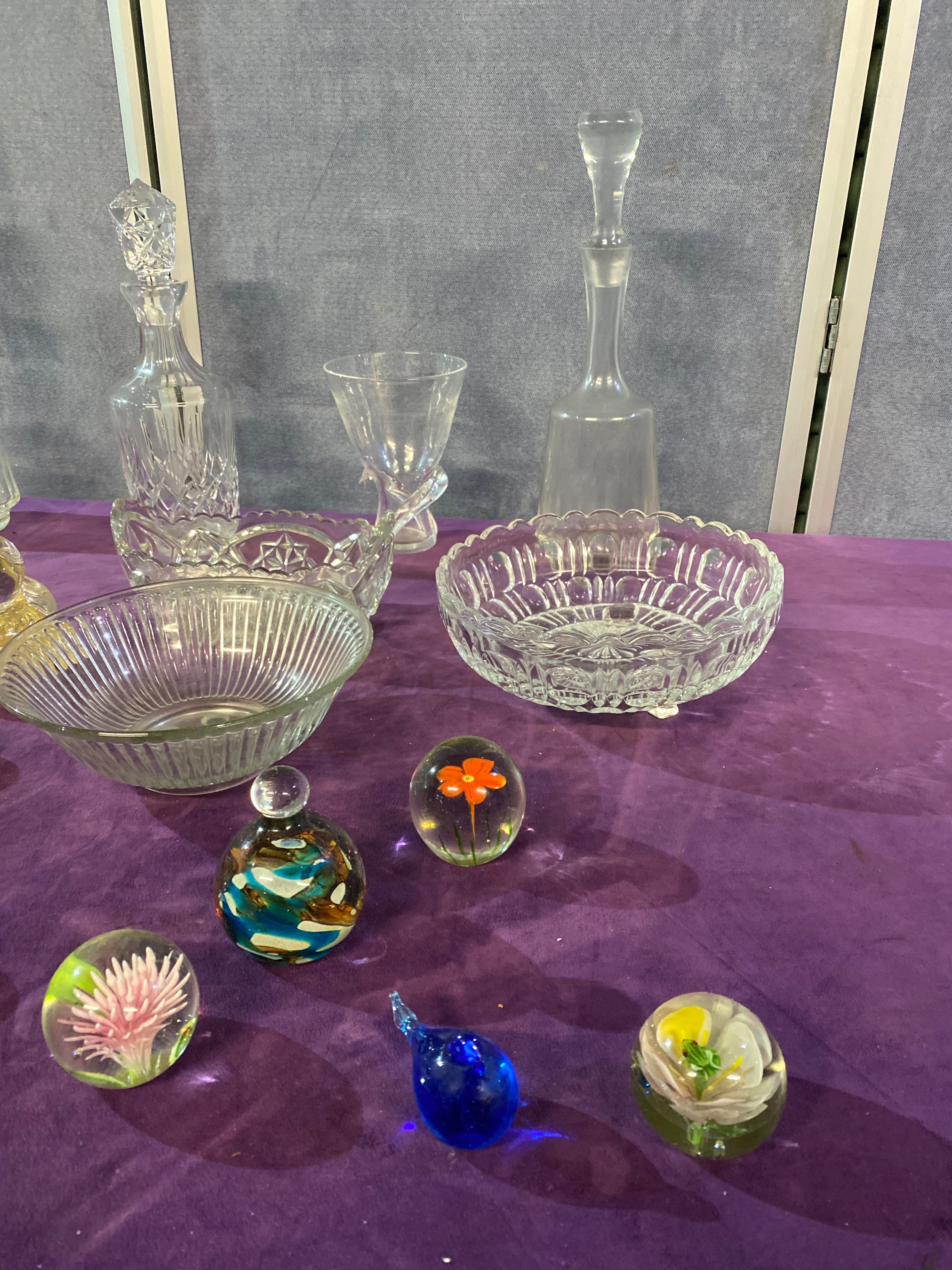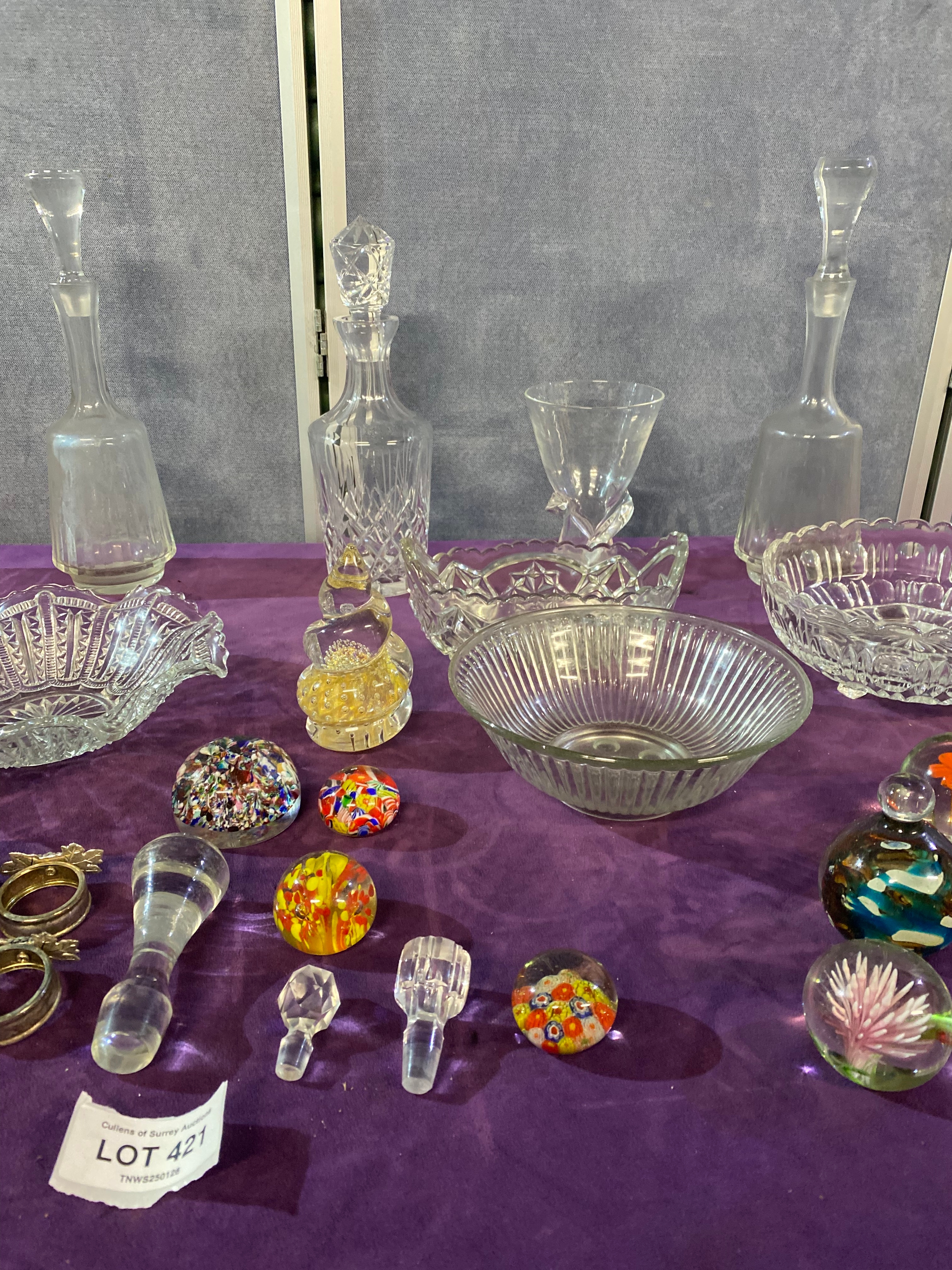 A quantity of Collectable glasswares including, Bowls, Decanters, Paper weights and some Napkin rings