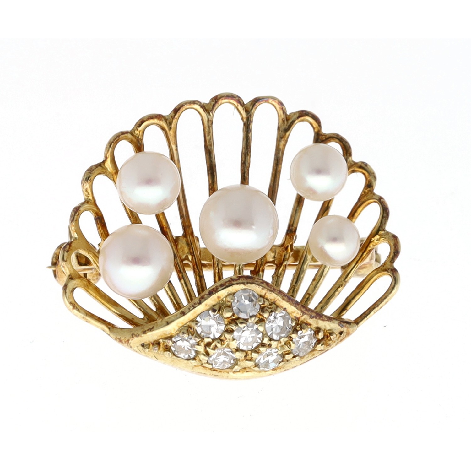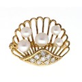 14ct yellow gold cultured pearl and pavé diamond set clam shell design brooch, round brilliant-cuts, 0.16ct approx, 3.5gm, 22mm