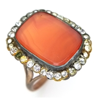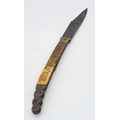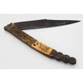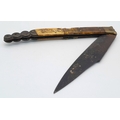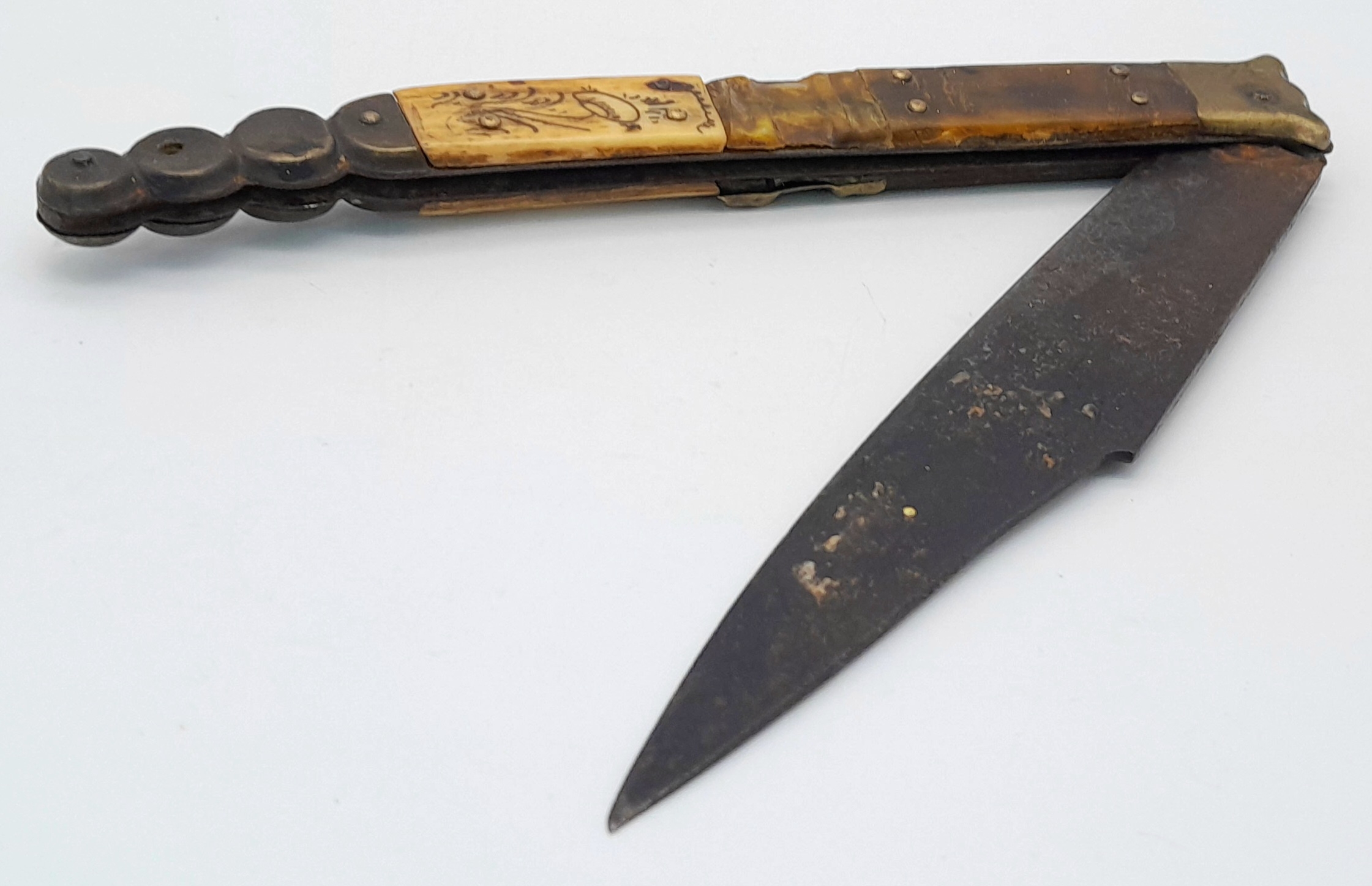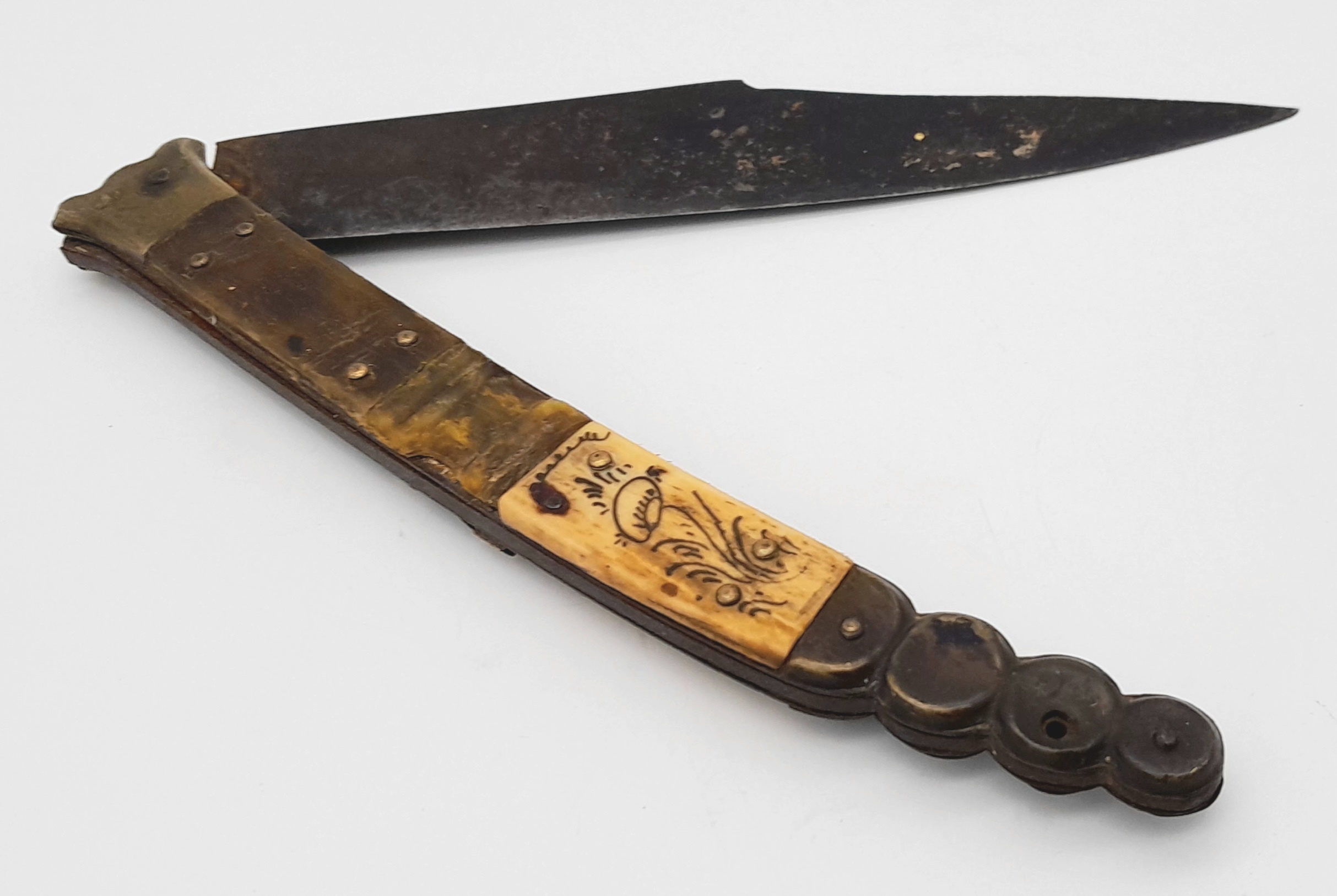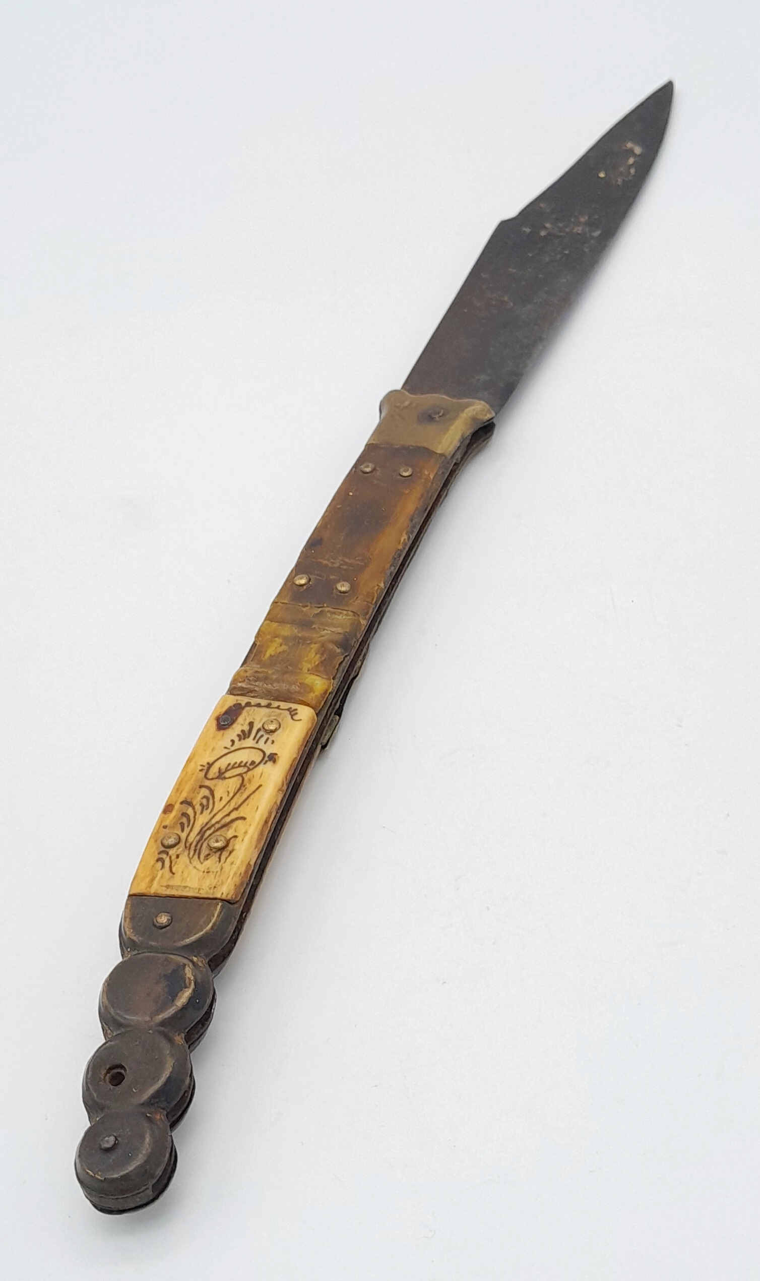 An Antique Spanish Folding Knife. Wood and brass handle with decorative inlaid horn. 35cm total length. Folds well but rusting on blade.