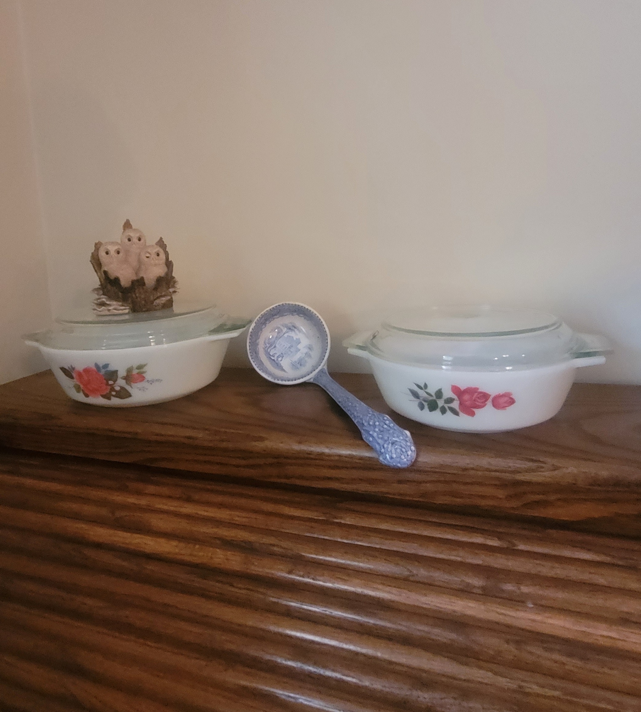 vintage A&J Pyrex, china ladle, border fine arts owls