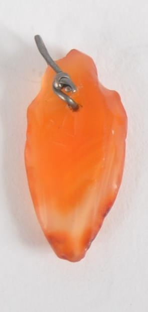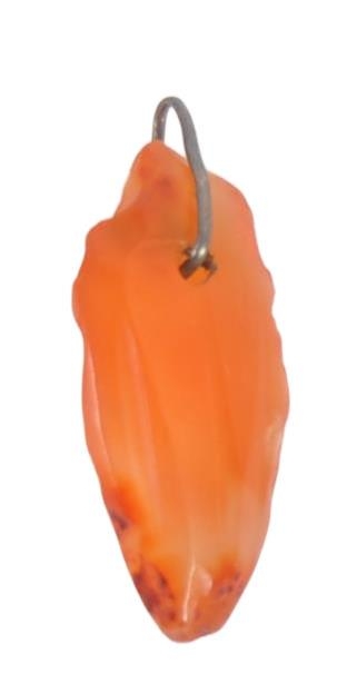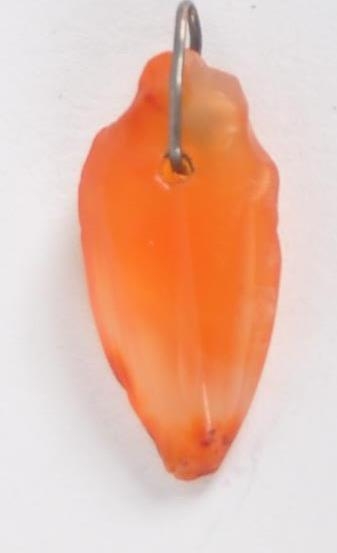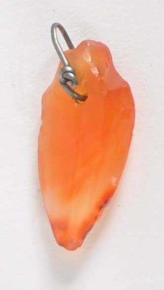 An ancient Egyptian heart pendant. Made from carnelian, in the form of a heart, hand carved with wire hanging loop. Approximately 2cm long.