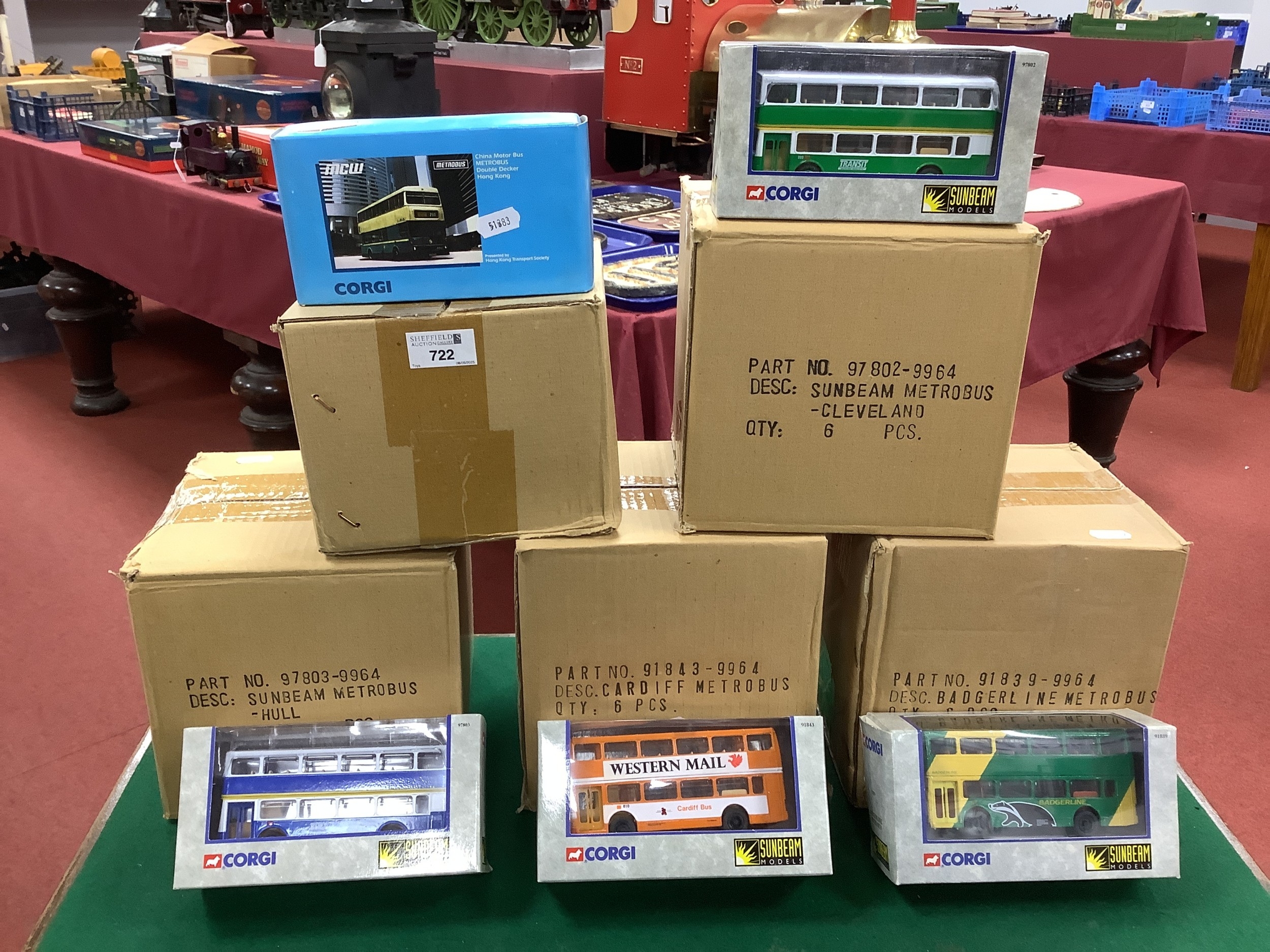 Thirty Diecast Model Buses by Sunbeam Models - Corgi. Comprising of #91843 Cardiff Metrobus (6), #91839 Badgerline Metrobus (6), #97802 Cleveland Metrobus (6), , #97803 Hull Metrobus (6), #91707 China Metrobus Double Decker Hong Kong (6), mostly in original unopened packaging and presented within factory issue outer carton. *Individual models as pictured represent each of the box contents - not included as part of this lot.