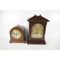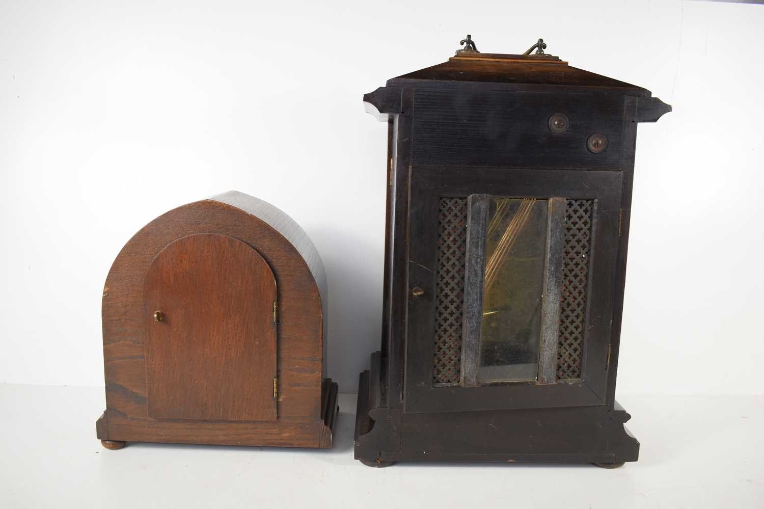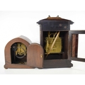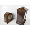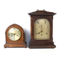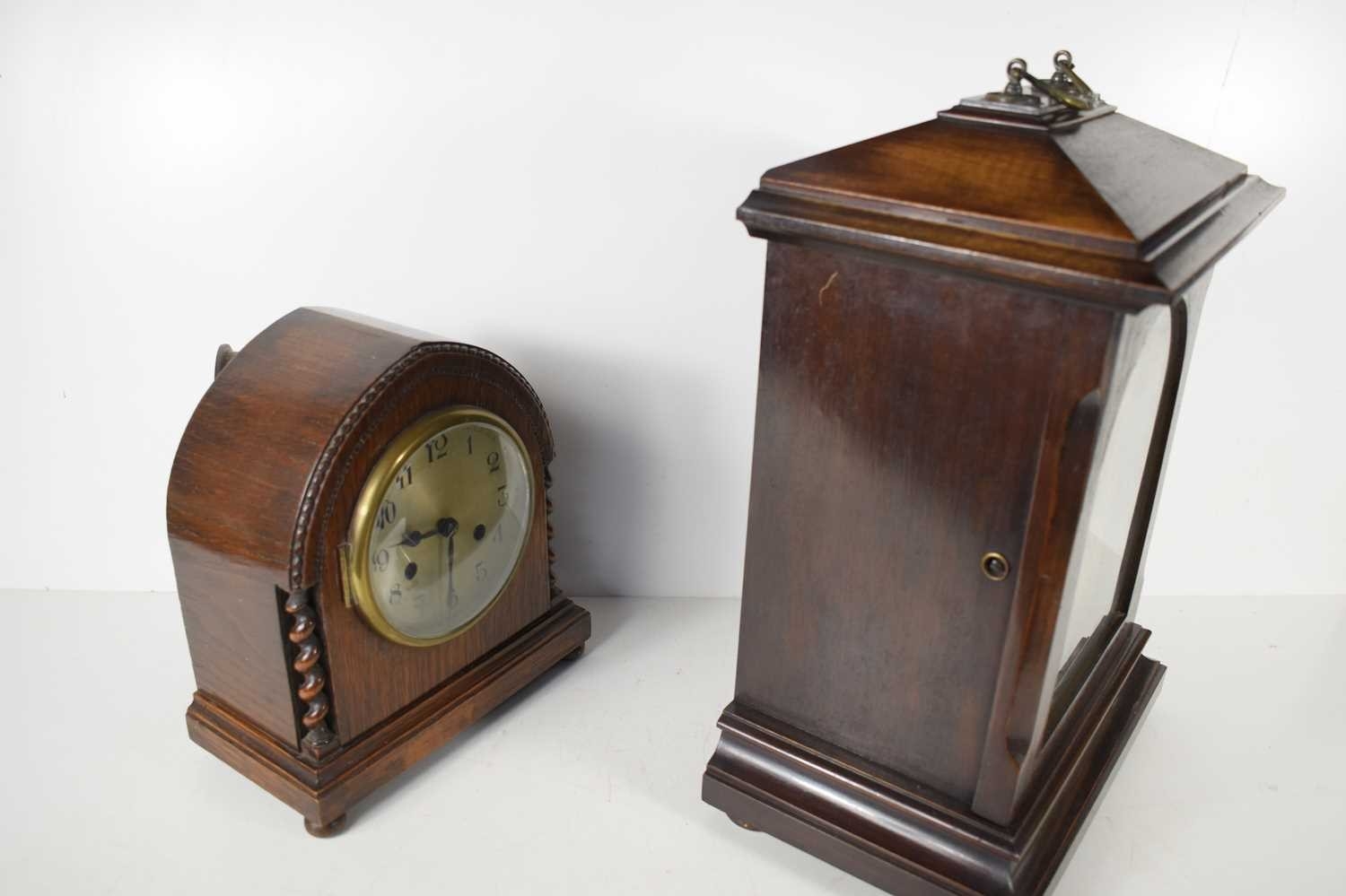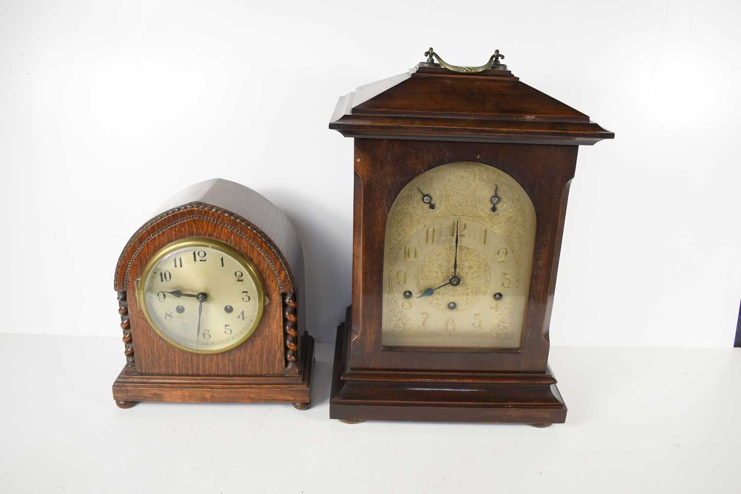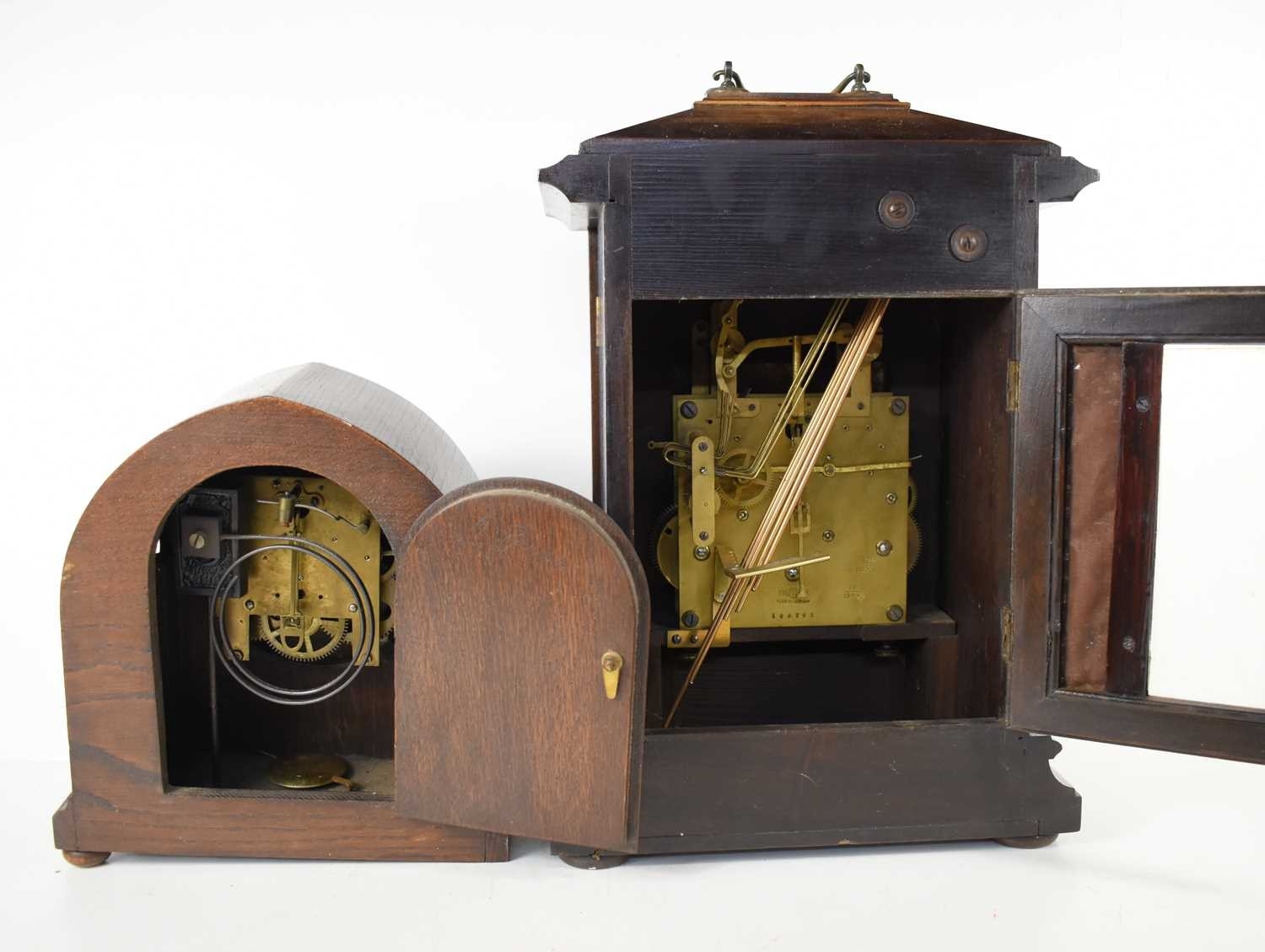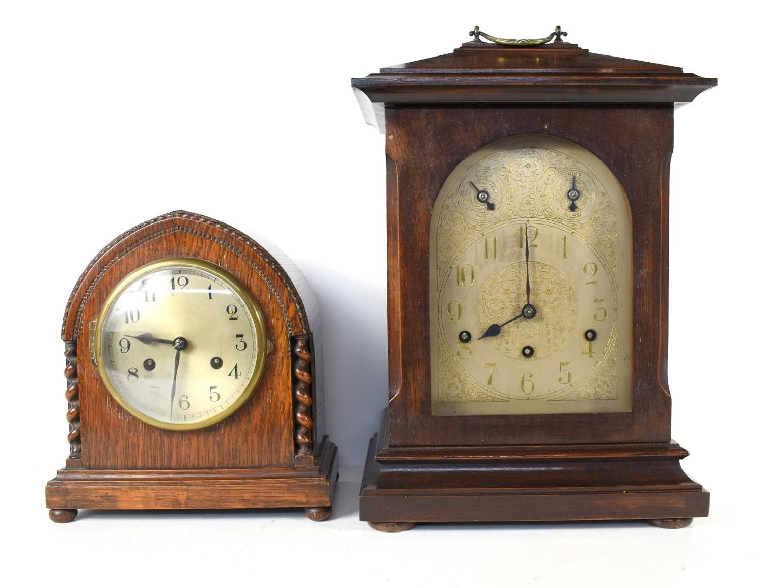 An early 20th century oak cased Westminster chime bracket clock by Kienzle with pendulum and key, 42cm high, together with a 1940s oak cased mantle clock.