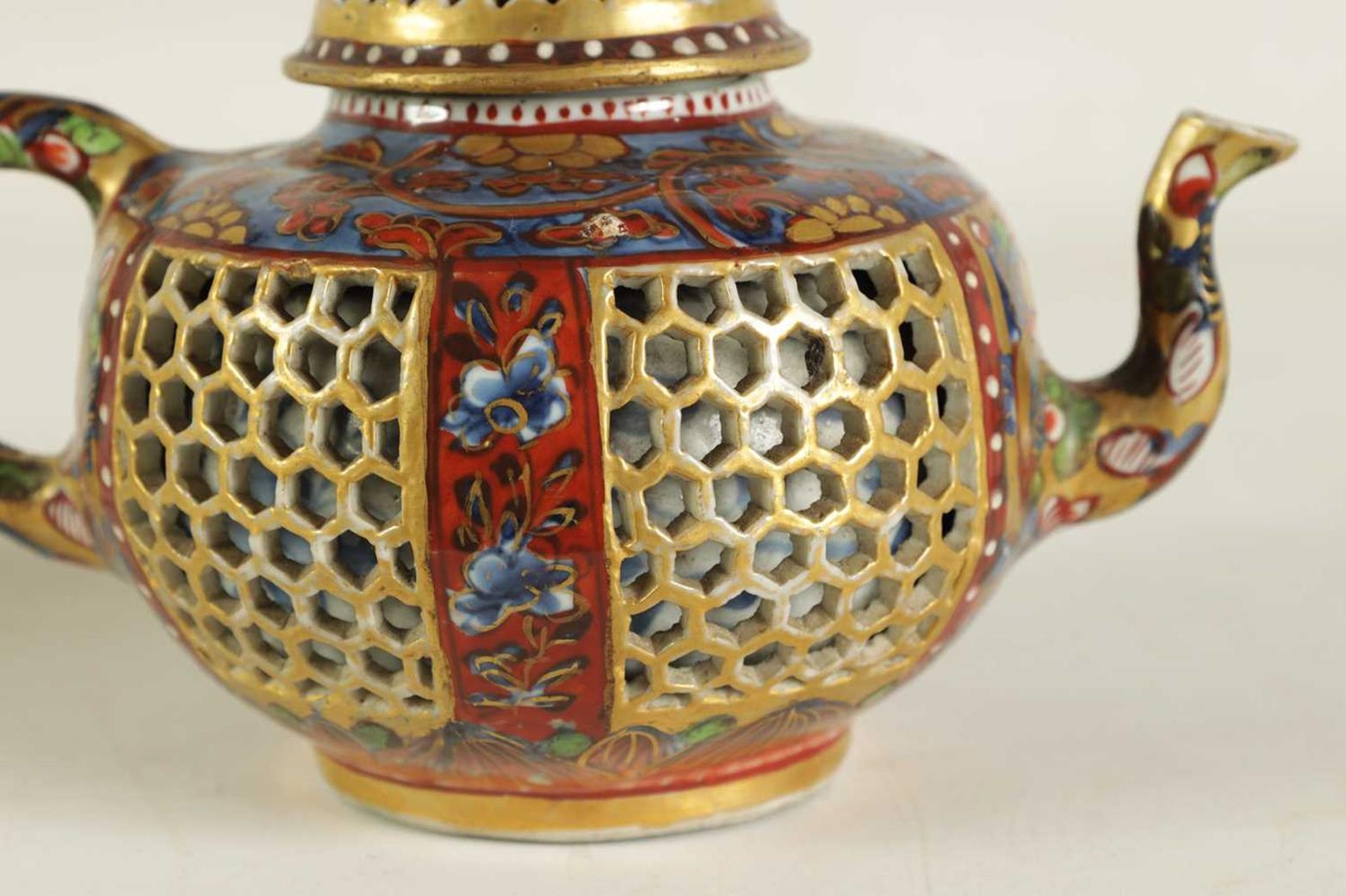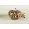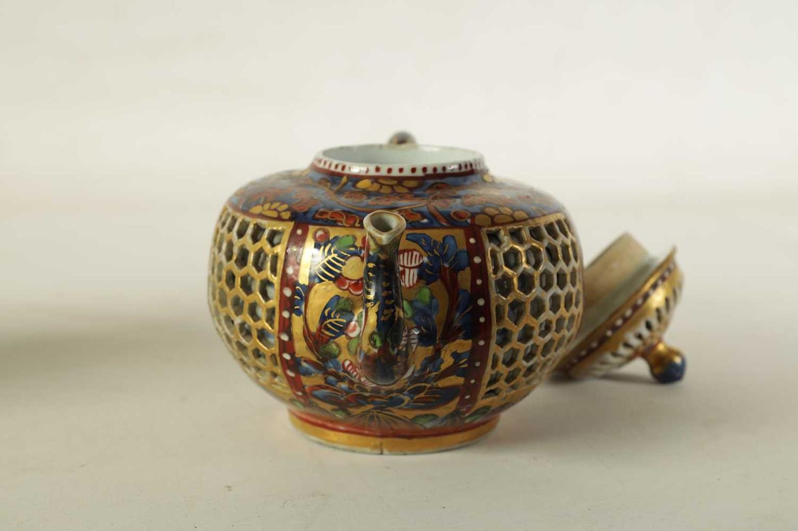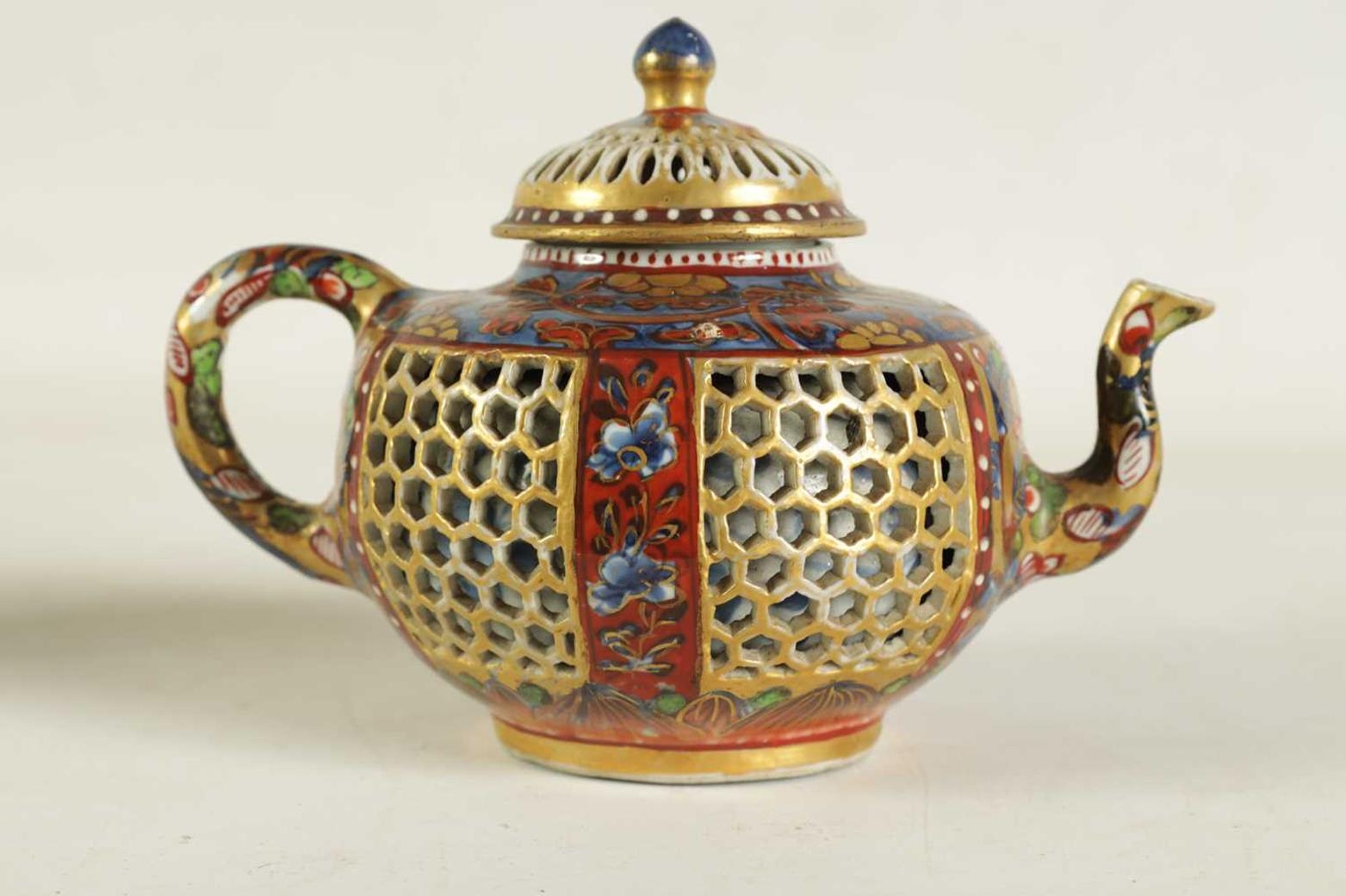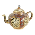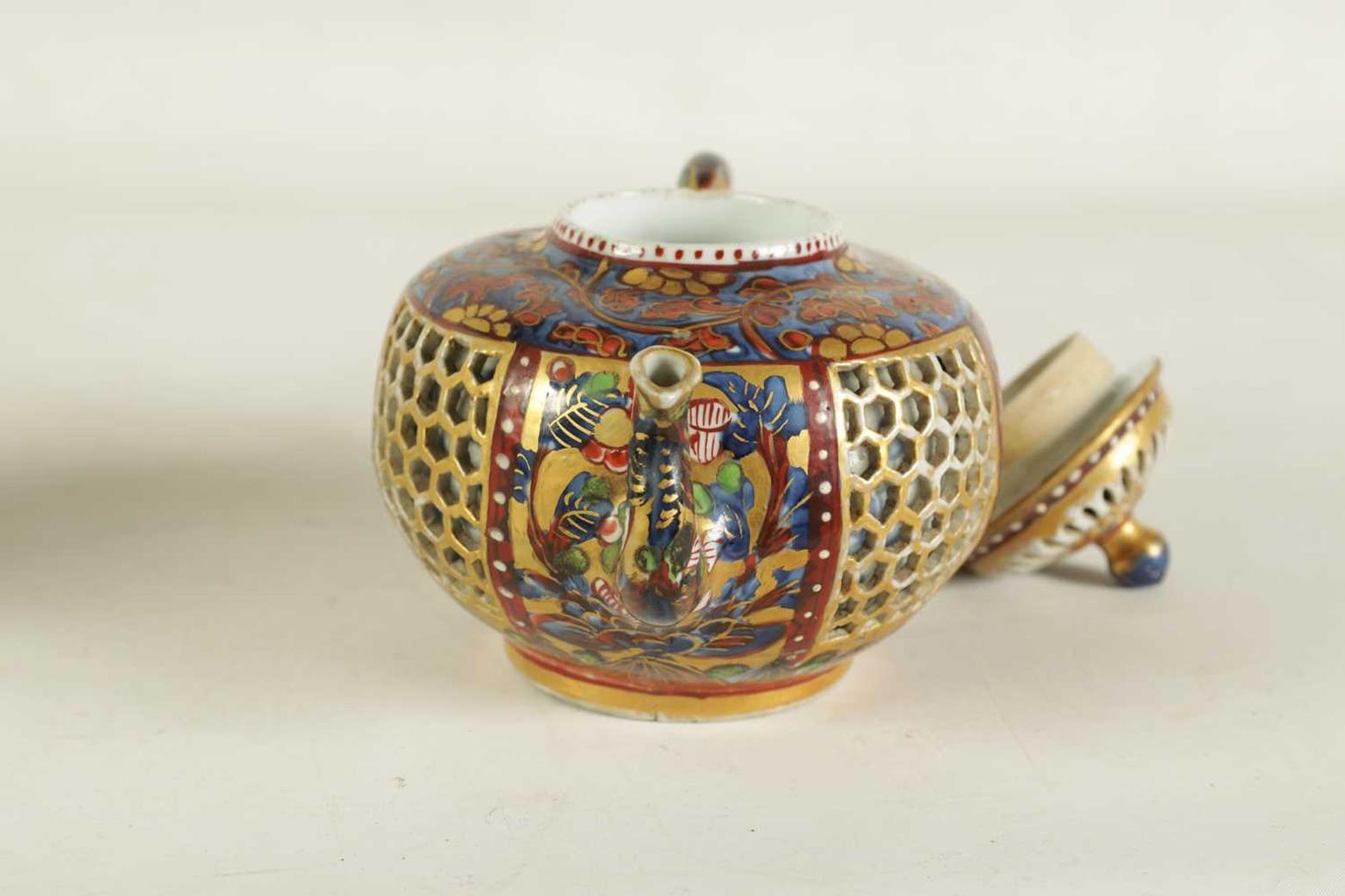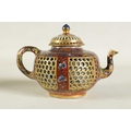 AN 18TH CENTURY CHINESE DOUBLE WALLED RETICULATED TEAPOT the original blue and white porcelain body overpainted in the 19TH Century (12.5cm high)