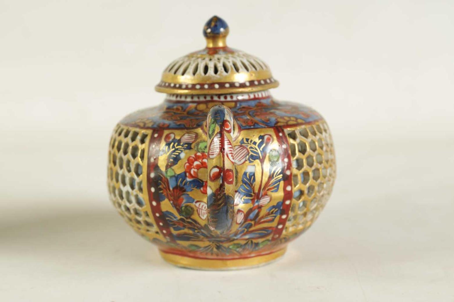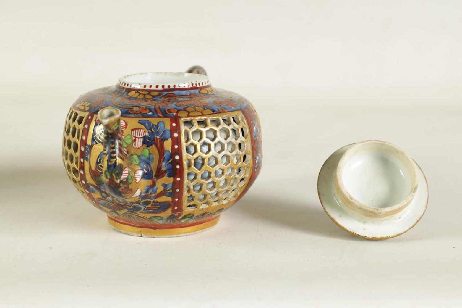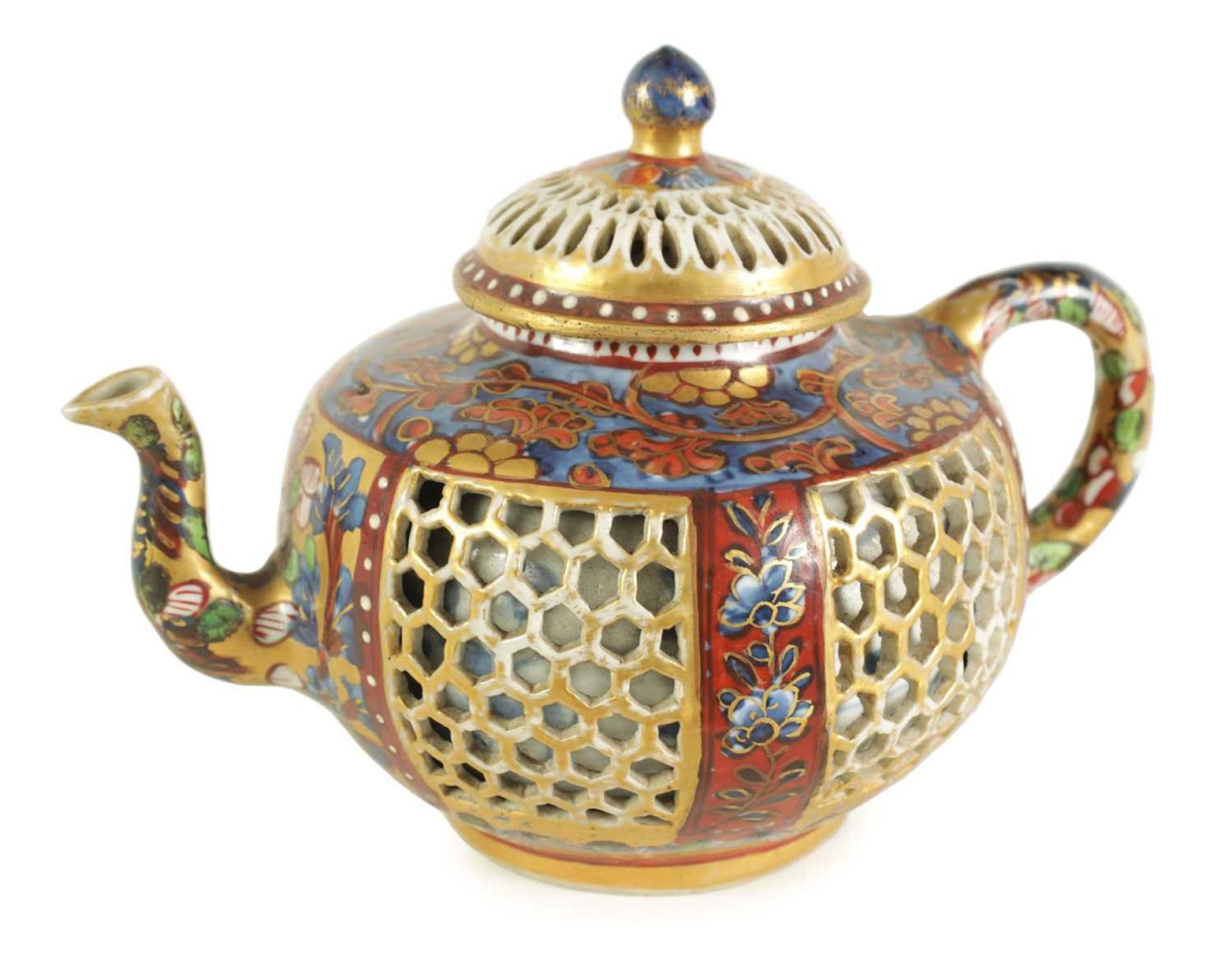 AN 18TH CENTURY CHINESE DOUBLE WALLED RETICULATED TEAPOT the original blue and white porcelain body overpainted in the 19TH Century (12.5cm high)