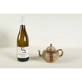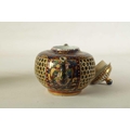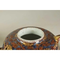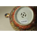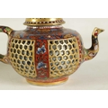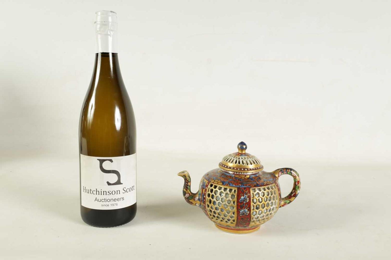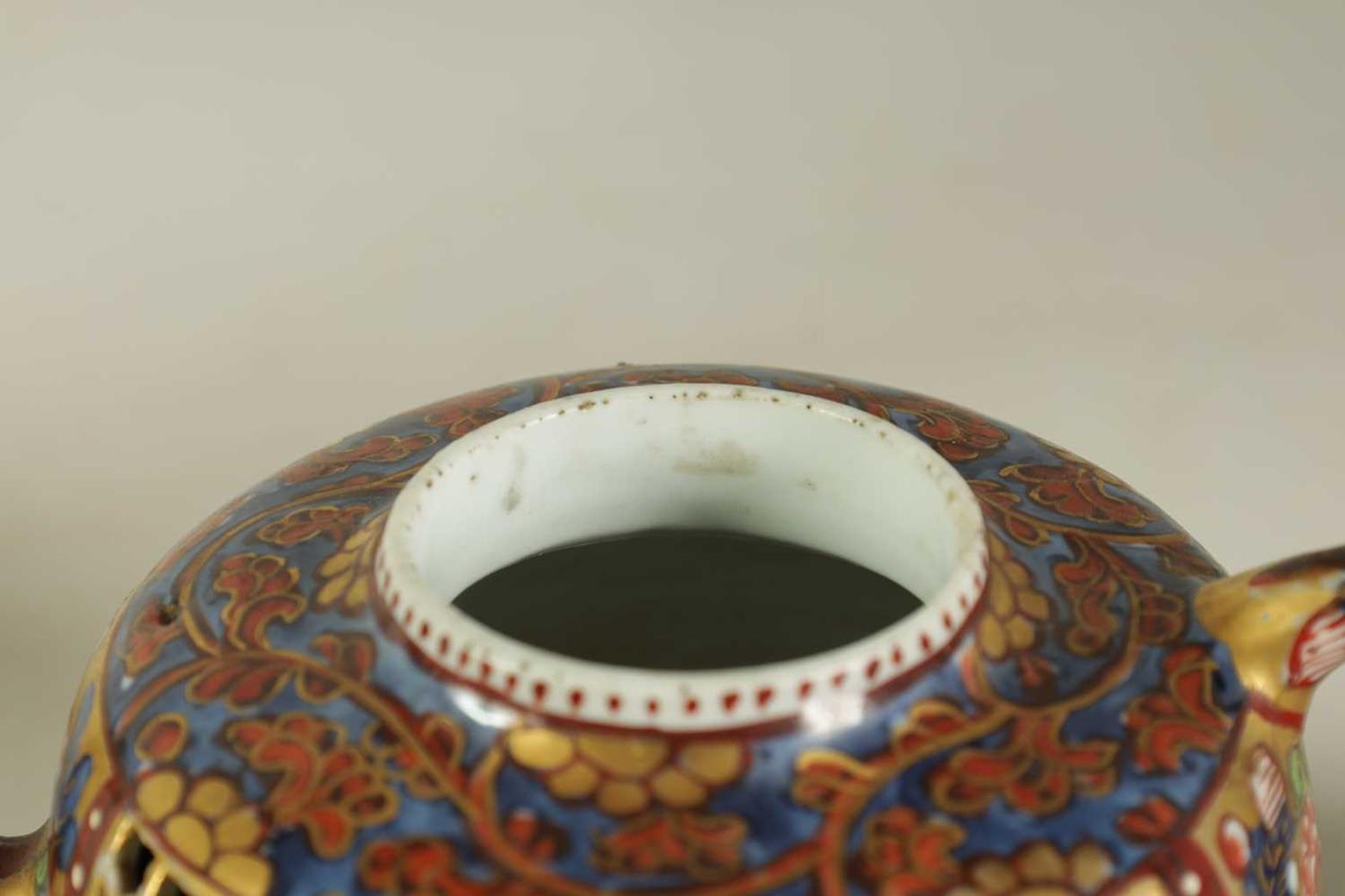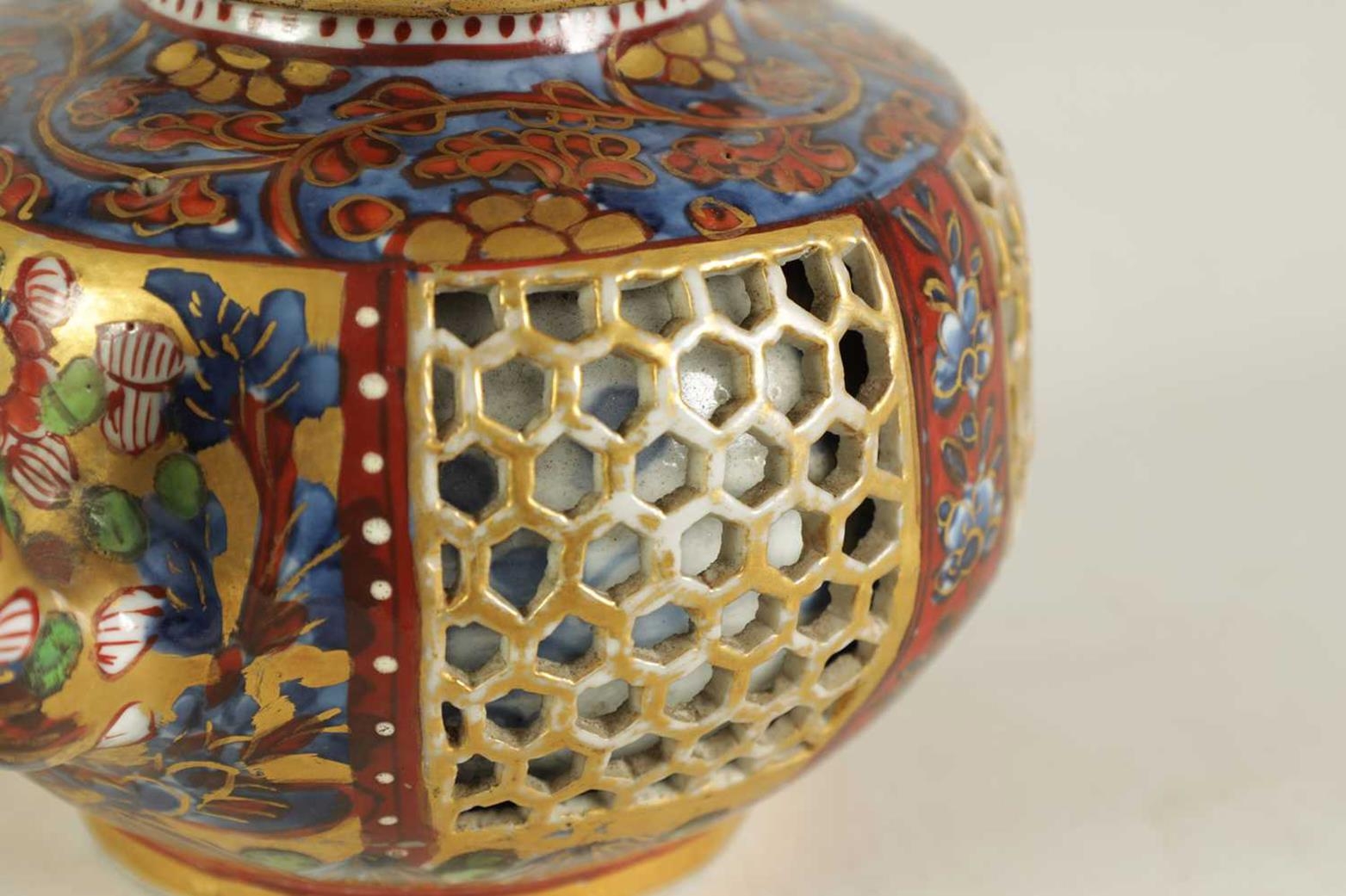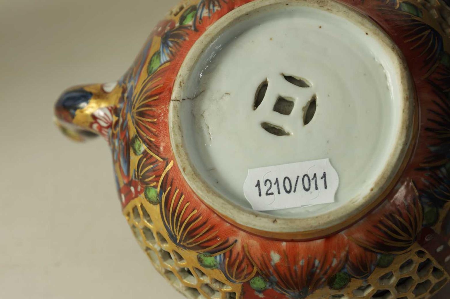 AN 18TH CENTURY CHINESE DOUBLE WALLED RETICULATED TEAPOT the original blue and white porcelain body overpainted in the 19TH Century (12.5cm high)