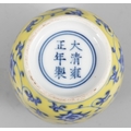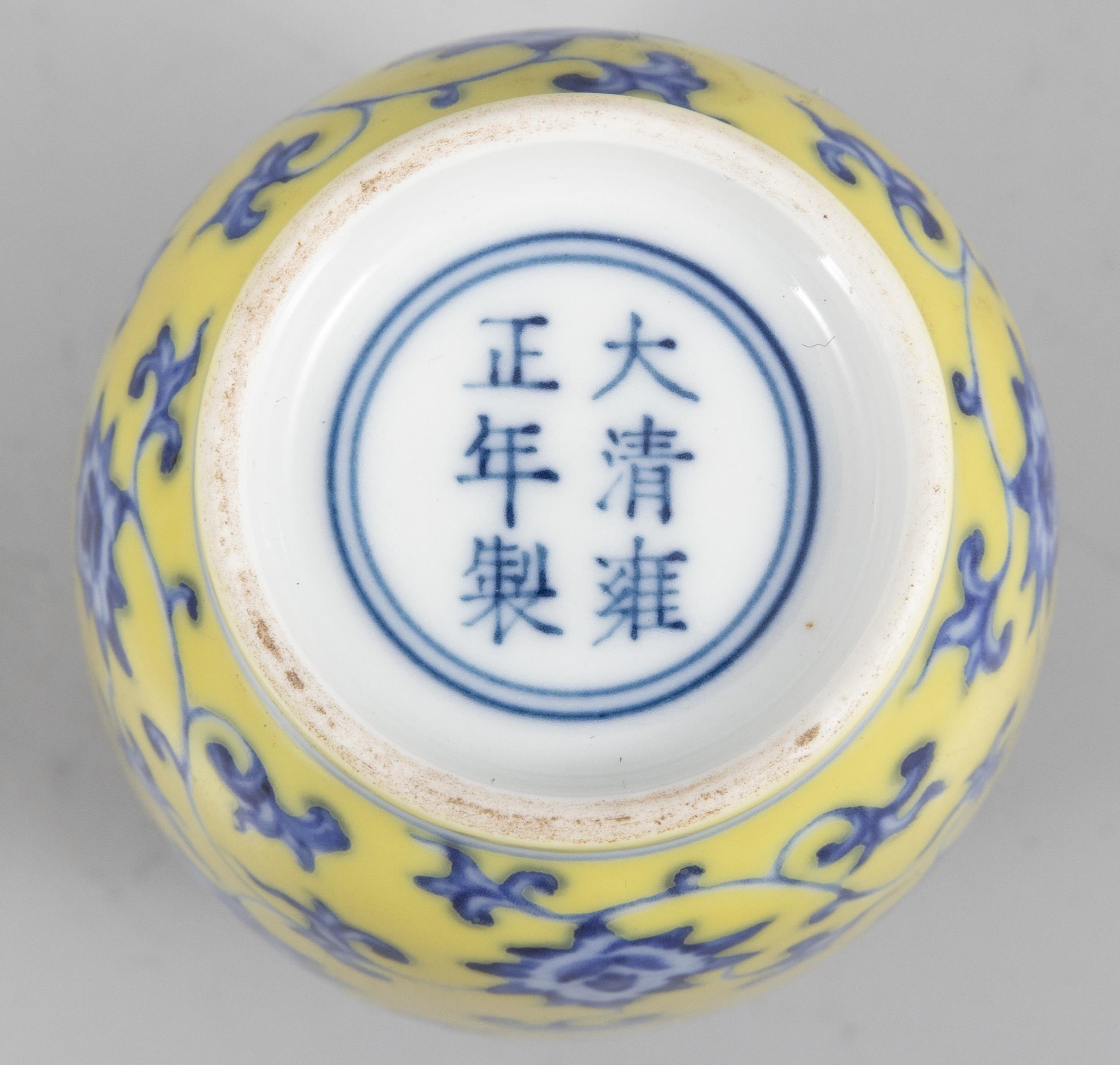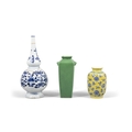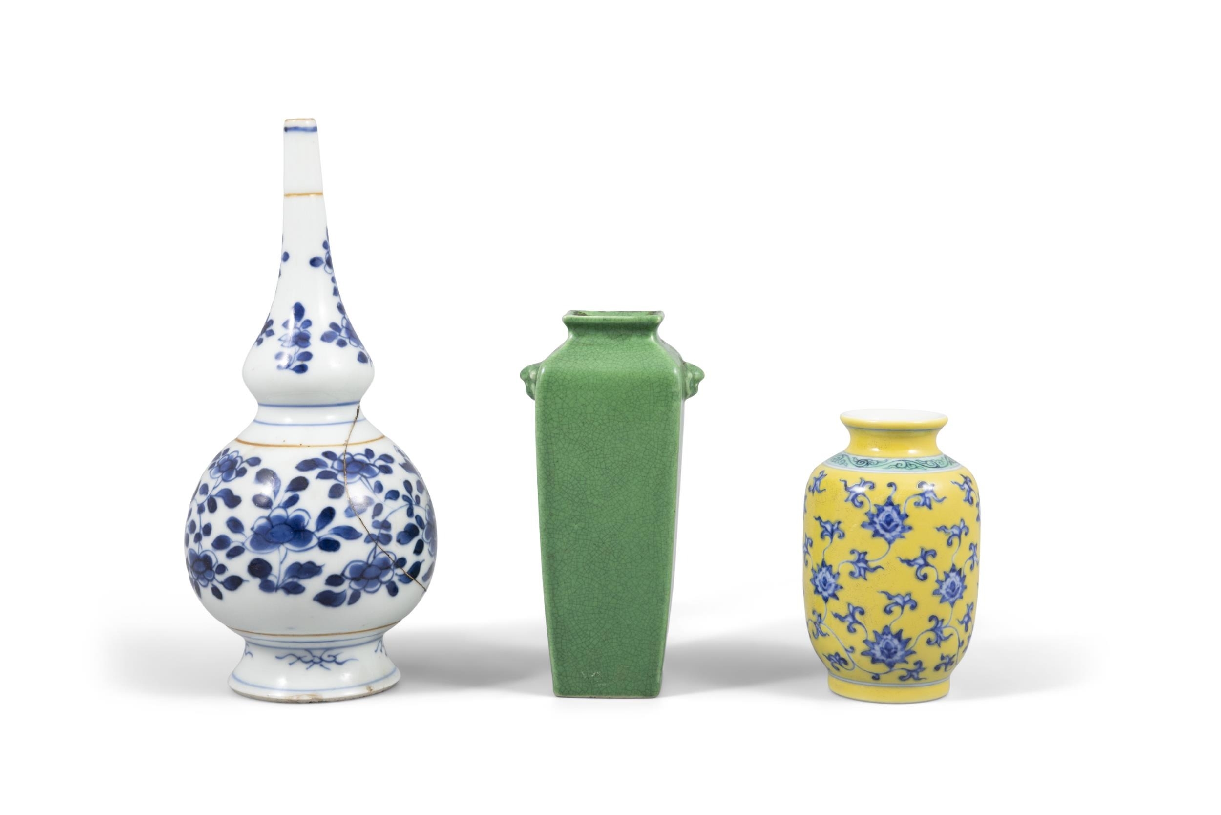 A SET OF THREE PORCELAINS, CONSISTING OF A BLUE AND WHITE GOURD VASE; A YELLOW GROUND BLUE AND WHITE SMALL VASE, MARKED YONGZHENG, AND A GREEN GLAZED SQUARE VASE ?18-19?? ??????? China, 18-19th century H: 9-19cm (3)