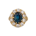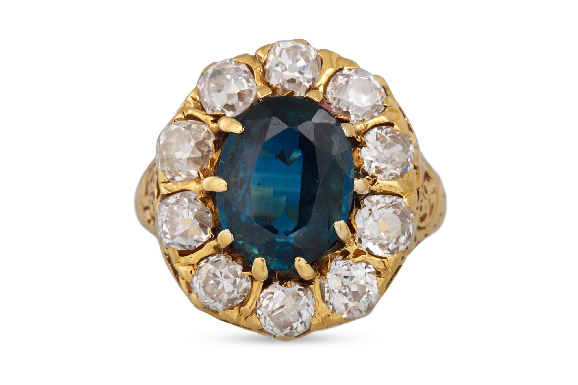 A VINTAGE DIAMOND AND SAPPHIRE CLUSTER RING, the oval sapphire to an old cut diamond surround, mounted in 18ct white gold. Estimated: weight of diamonds: 2.00 ct. sapphire: 3.00 ct., size N - O