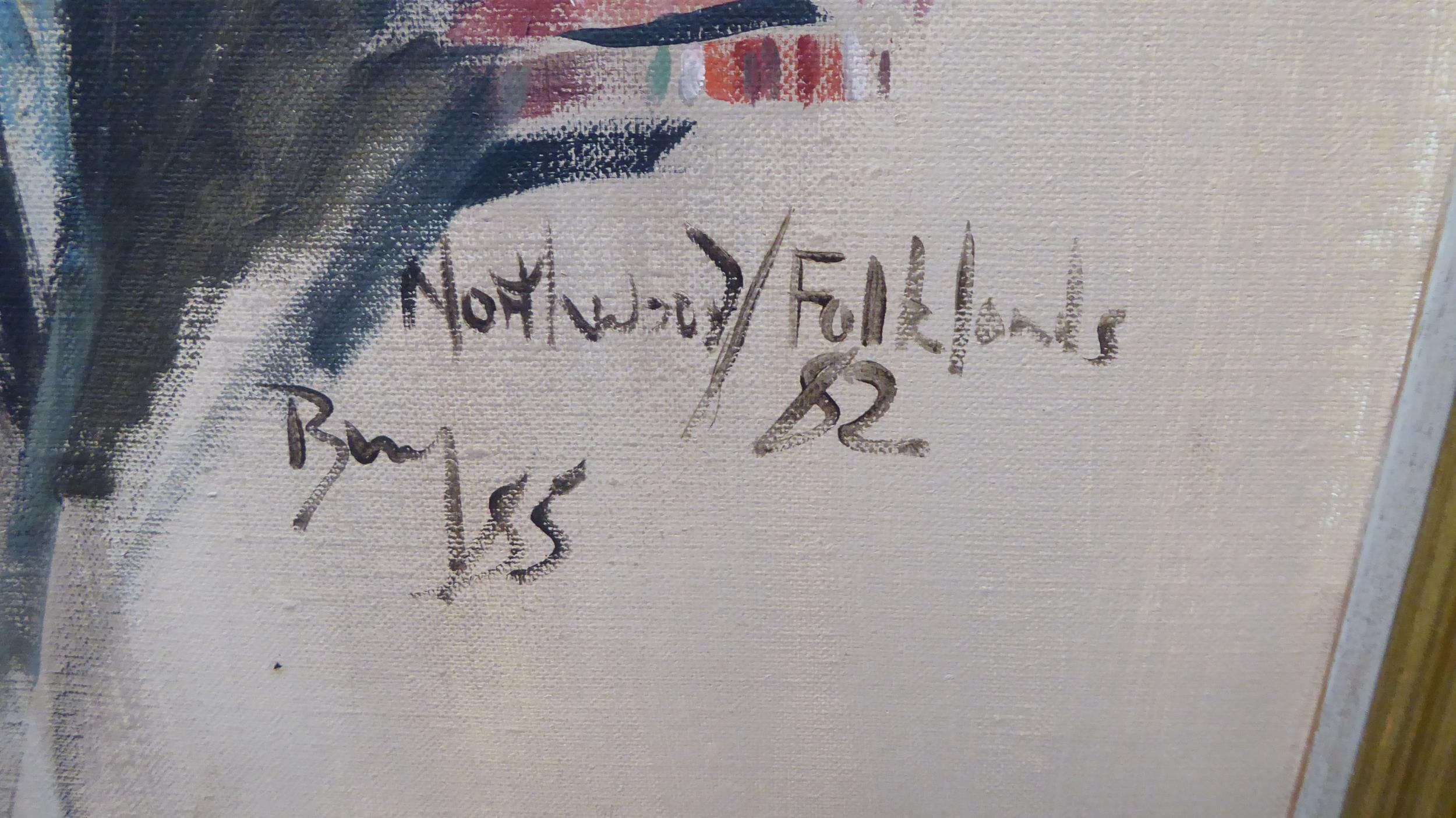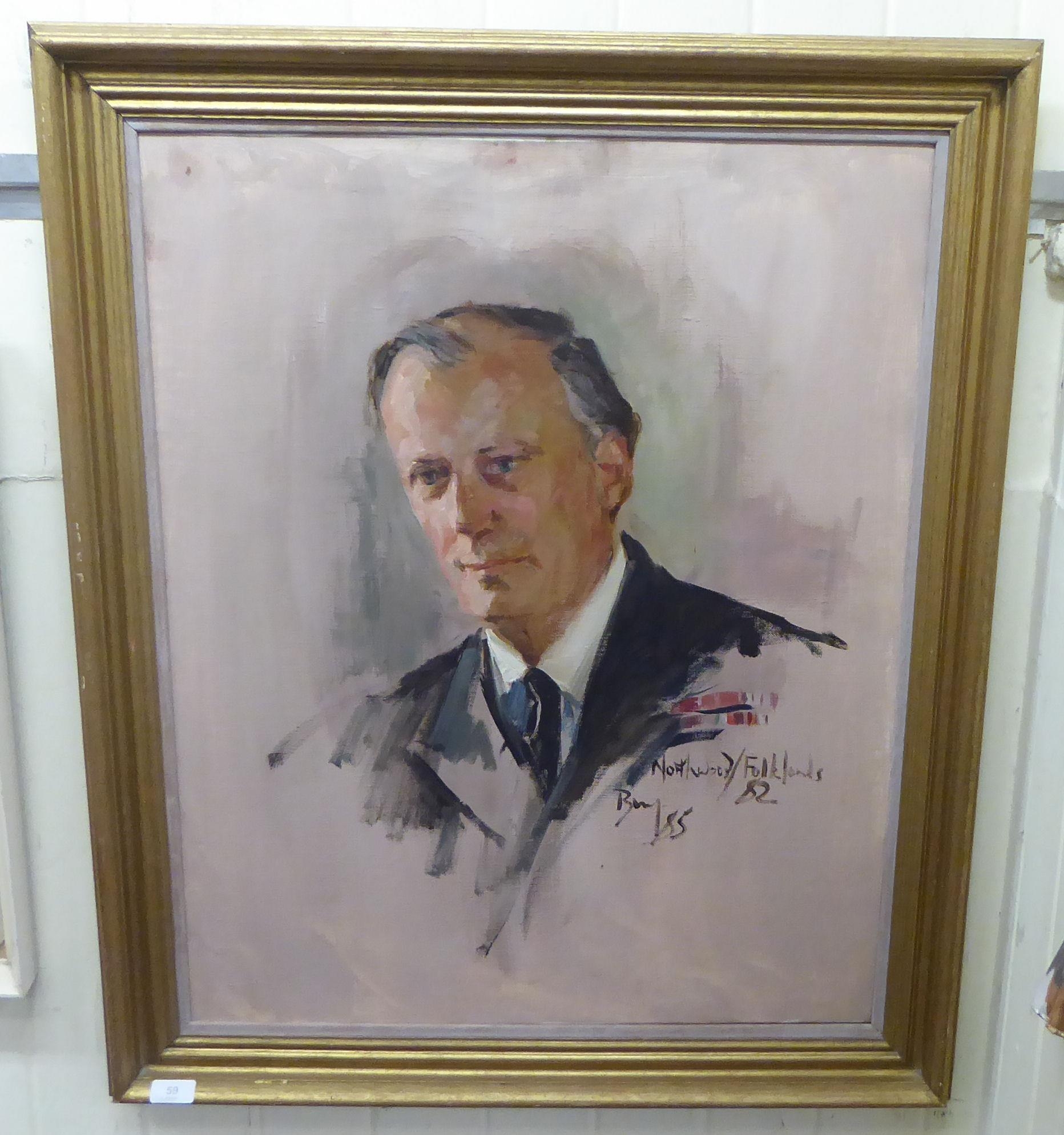 A 1982 portrait, a middle aged man, possibly by Brenda Bury (1932-present) painted in the Fulklands, oil on canvas bearing text 24" x 30" framed