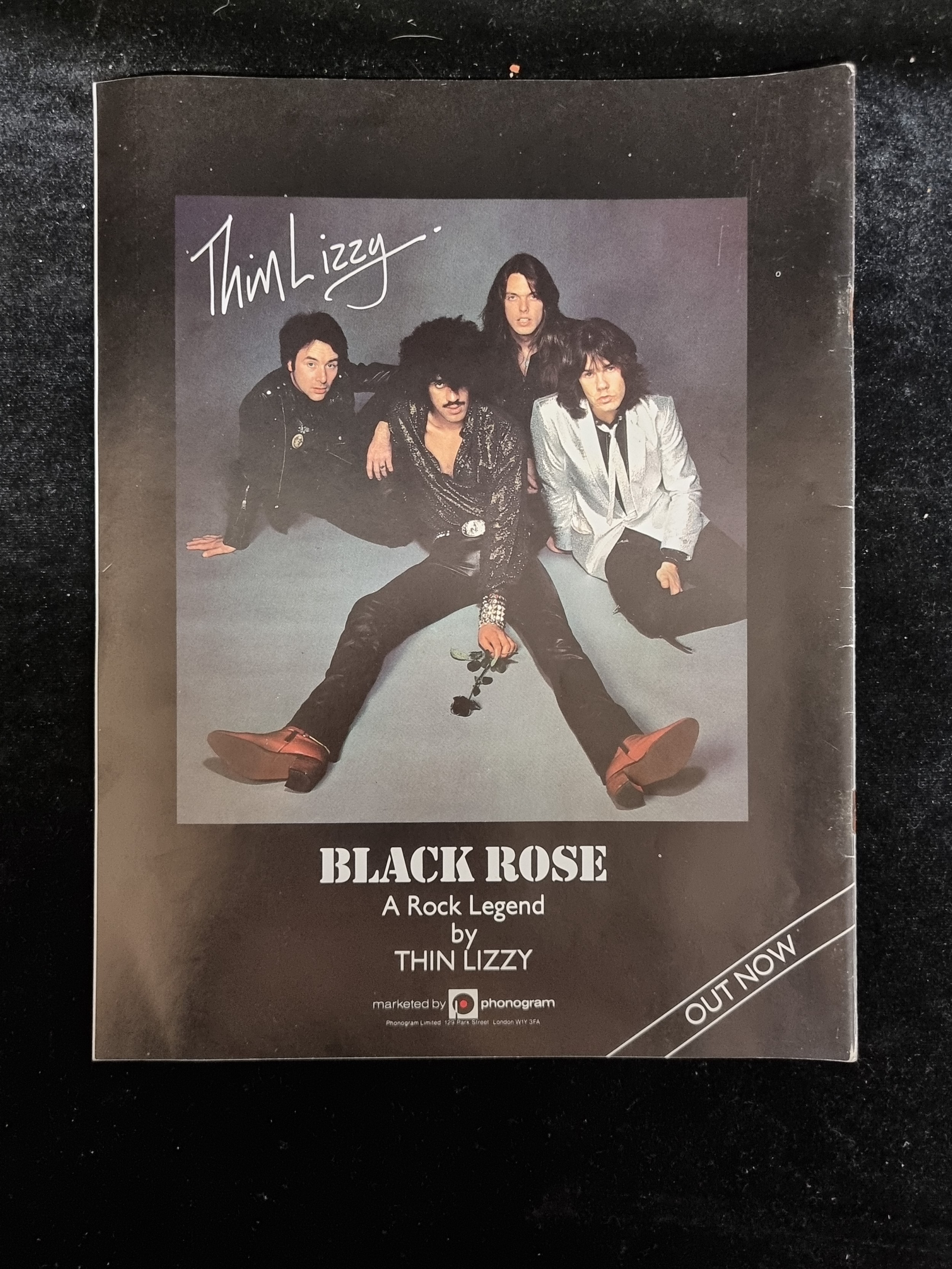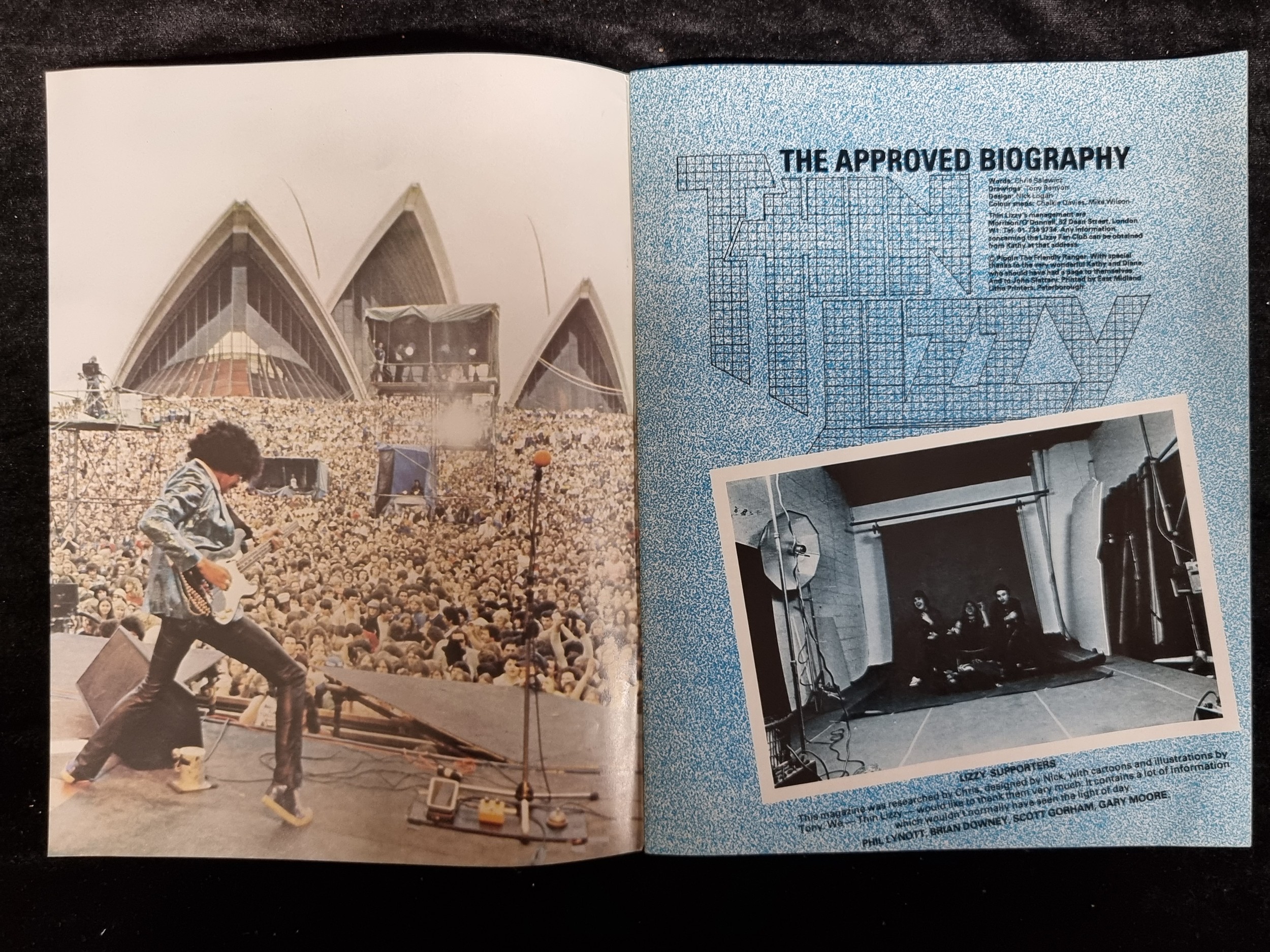 A copy of Thin Lizzy The Approved Biography from 1979 with interviews from the band members, photos from their international tours, and illustrations by Tony We. A really cool piece of memorabilia in excellent condition.