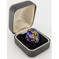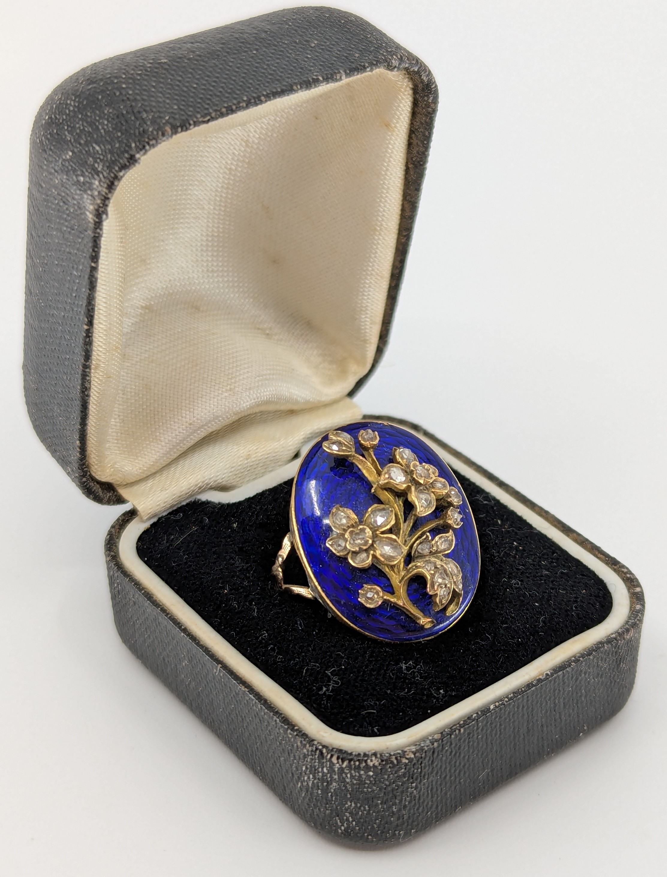 set with melee rose cut diamonds in a forget me not flower design on a blue enamelled background, indistinctly stamped for 9ct gold, size Q, approx. 6.5g gross, boxed, a/f