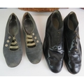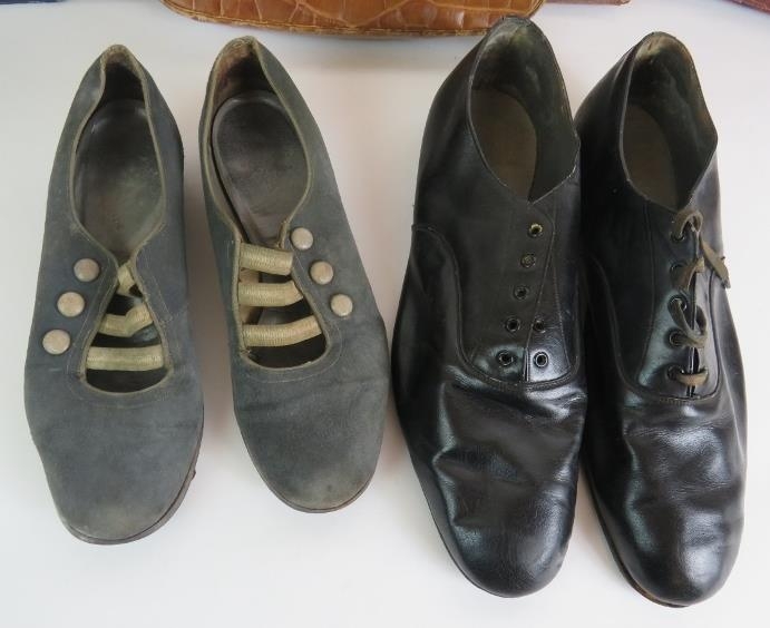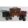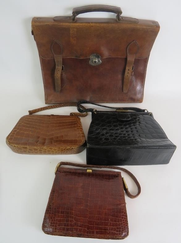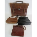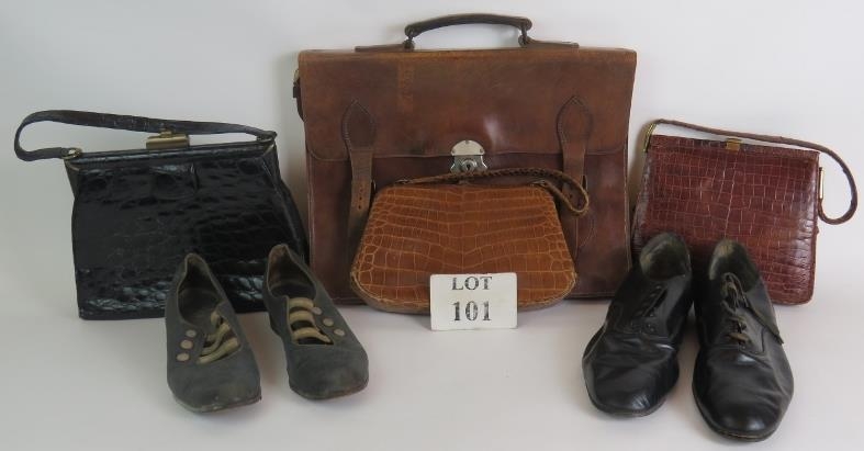 Three vintage leather Mock croc hand bags, a vintage leather briefcase and two pairs of vintage leather shoes. (8).