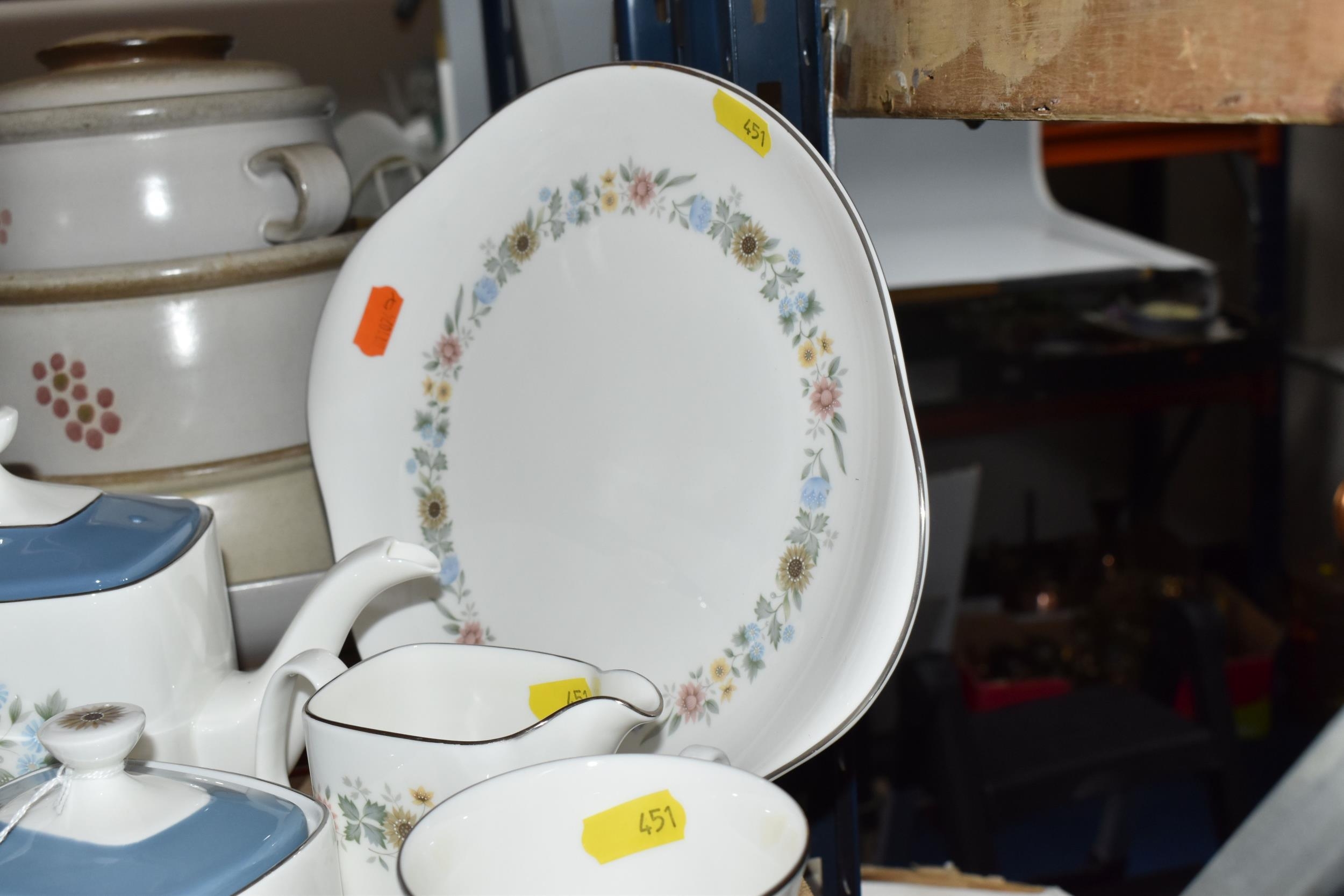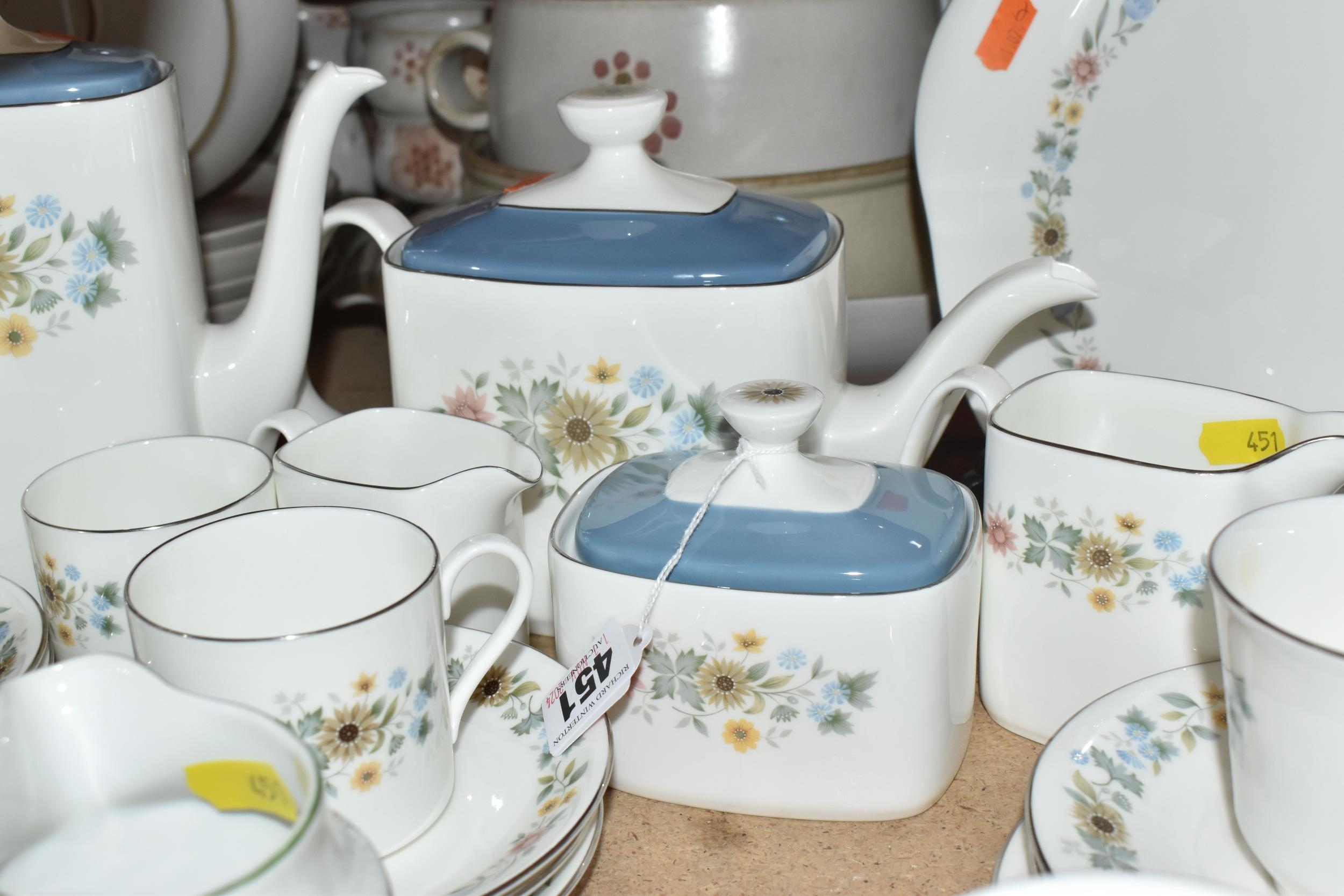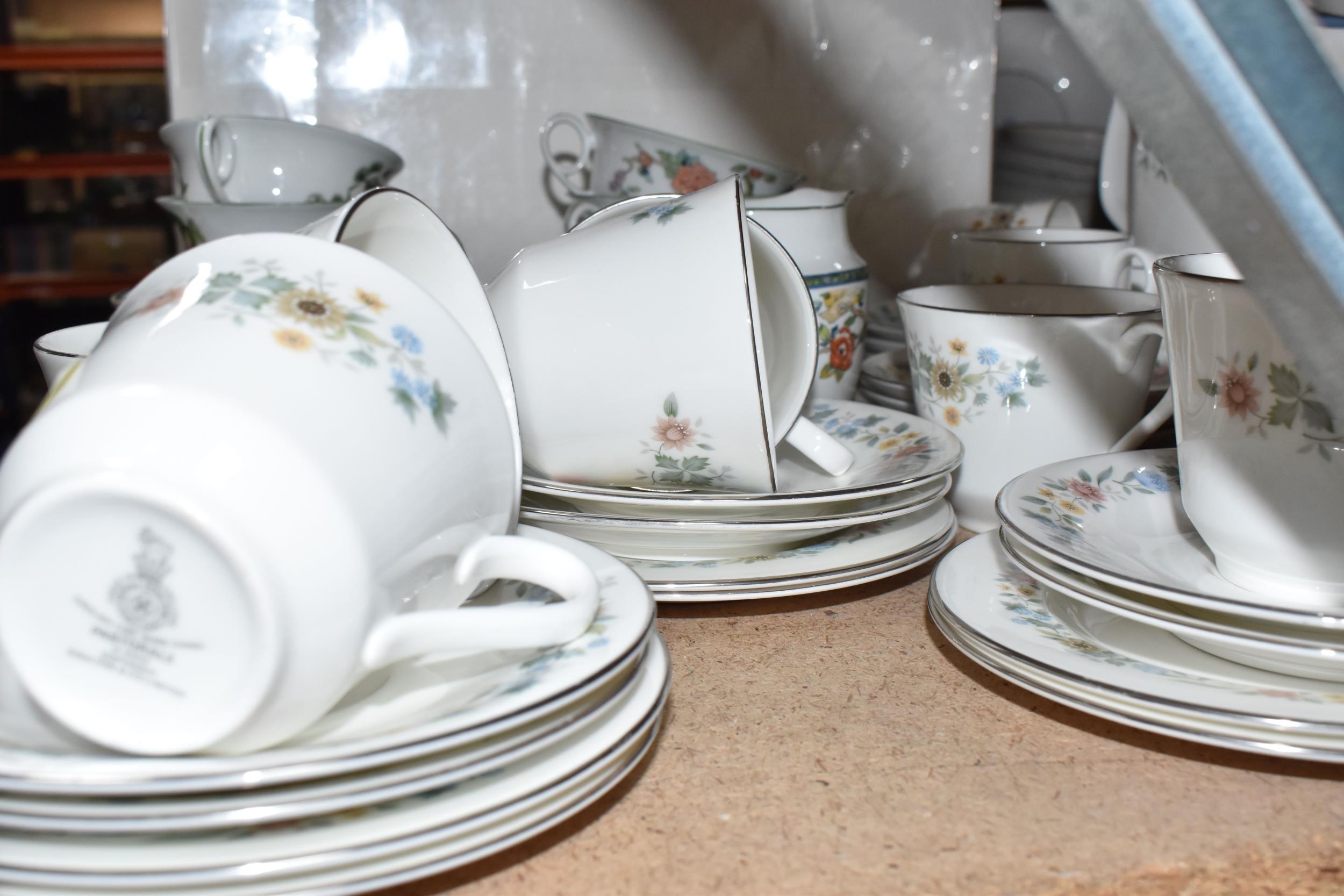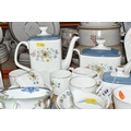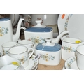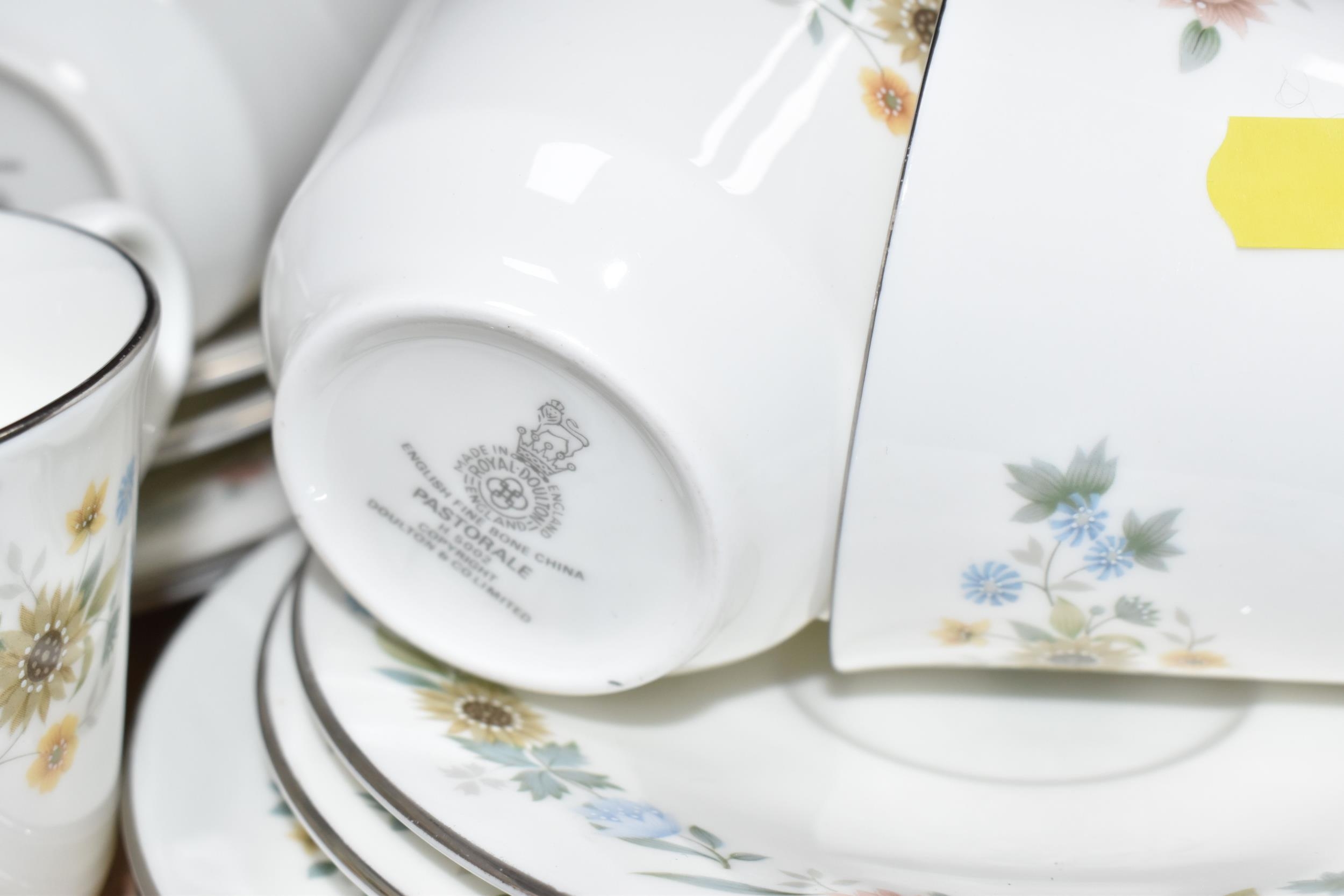 A LARGE GROUP OF ROYAL DOULTON TEA AND COFFEE WARES AND CONTINENTAL TEA WARES comprising a group of Royal Doulton 'Pastorale' tea and coffee wares comprising a teapot, seven tea cups, six tea saucers, and six side plates, a milk jug, a coffee pot, five coffee cups, six saucers, a cream jug, a sugar bowl, a lidded sugar jar, and a double handled cake plate, and a group of Czech Altrohlau tea wares comprising six teacups, six saucers, six side plates, milk jug, and a slop bowl (qty) (Condition Report: items appear in fair condition)