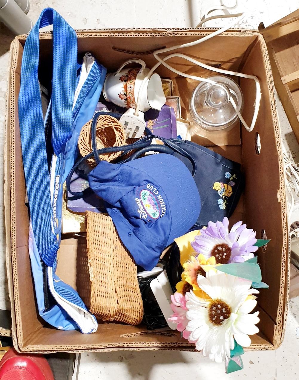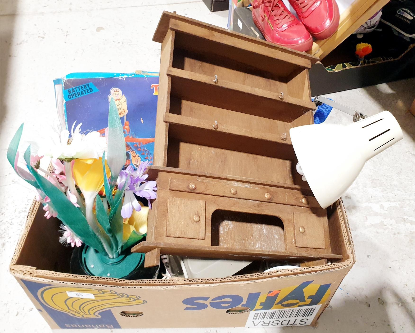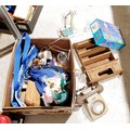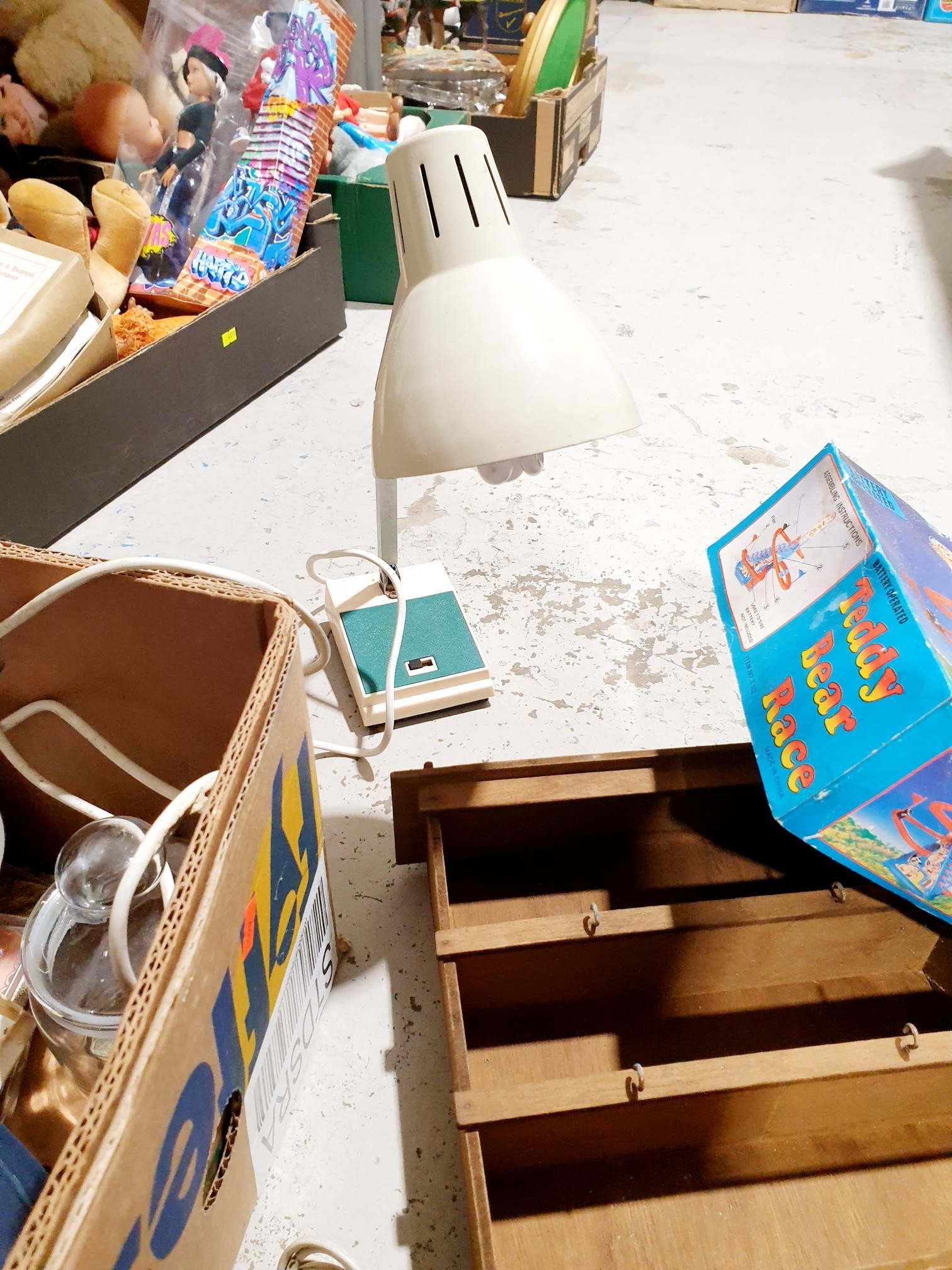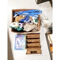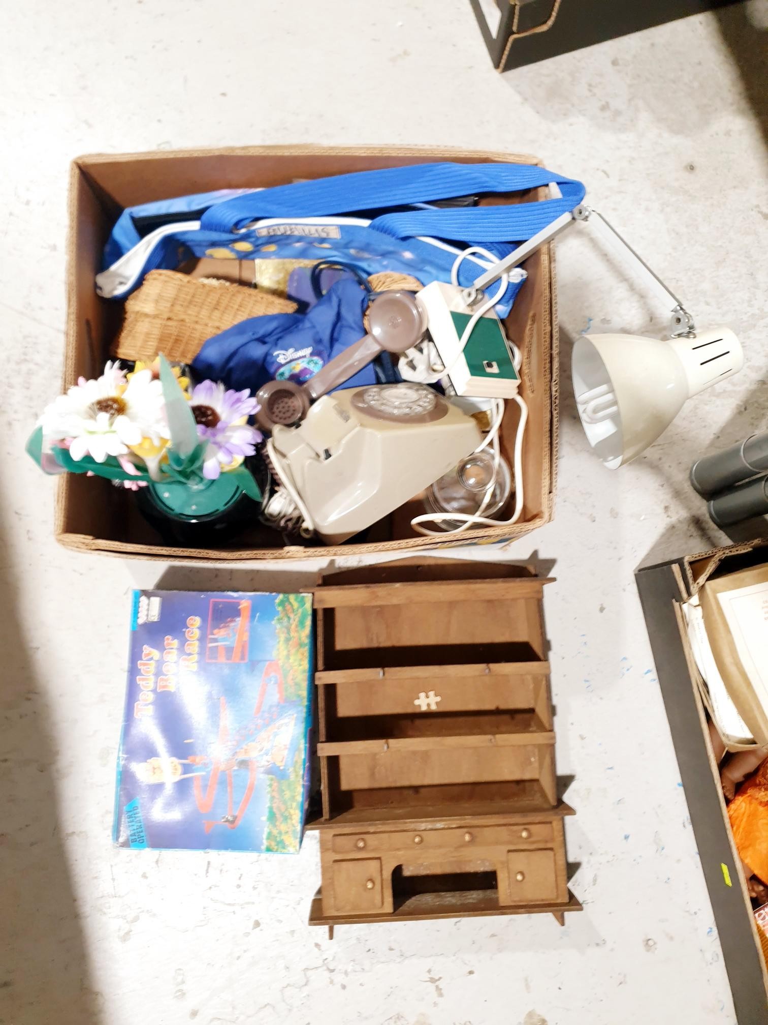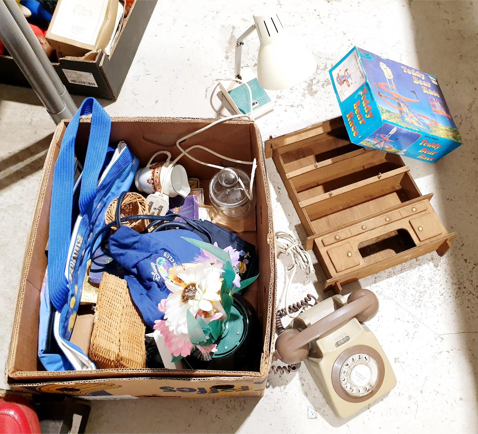 A box of assorted including a vintage telephone and desk lamp. No Shipping. Arrange collection or your own packer and shipper, please. Electricals are sold as scrap.