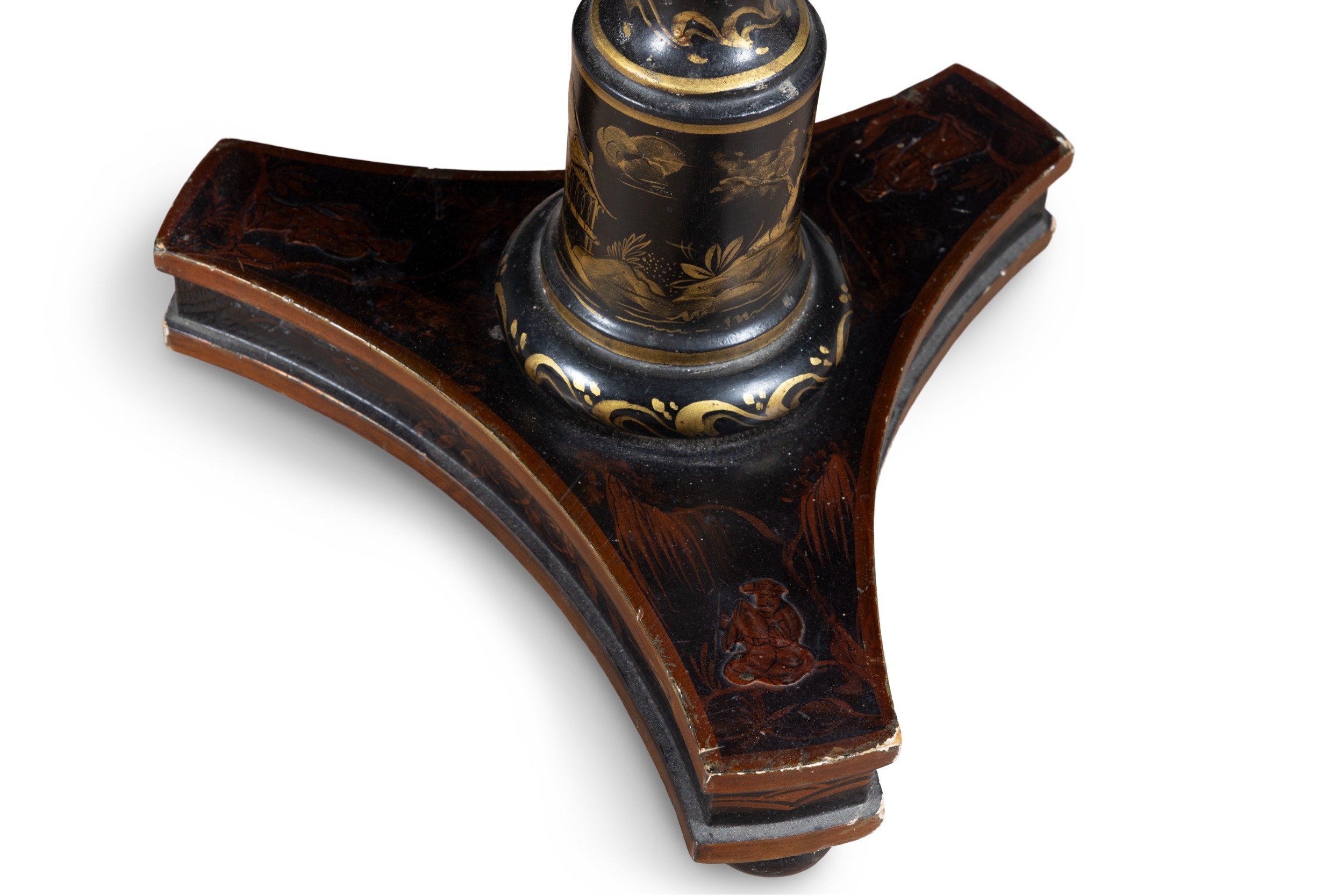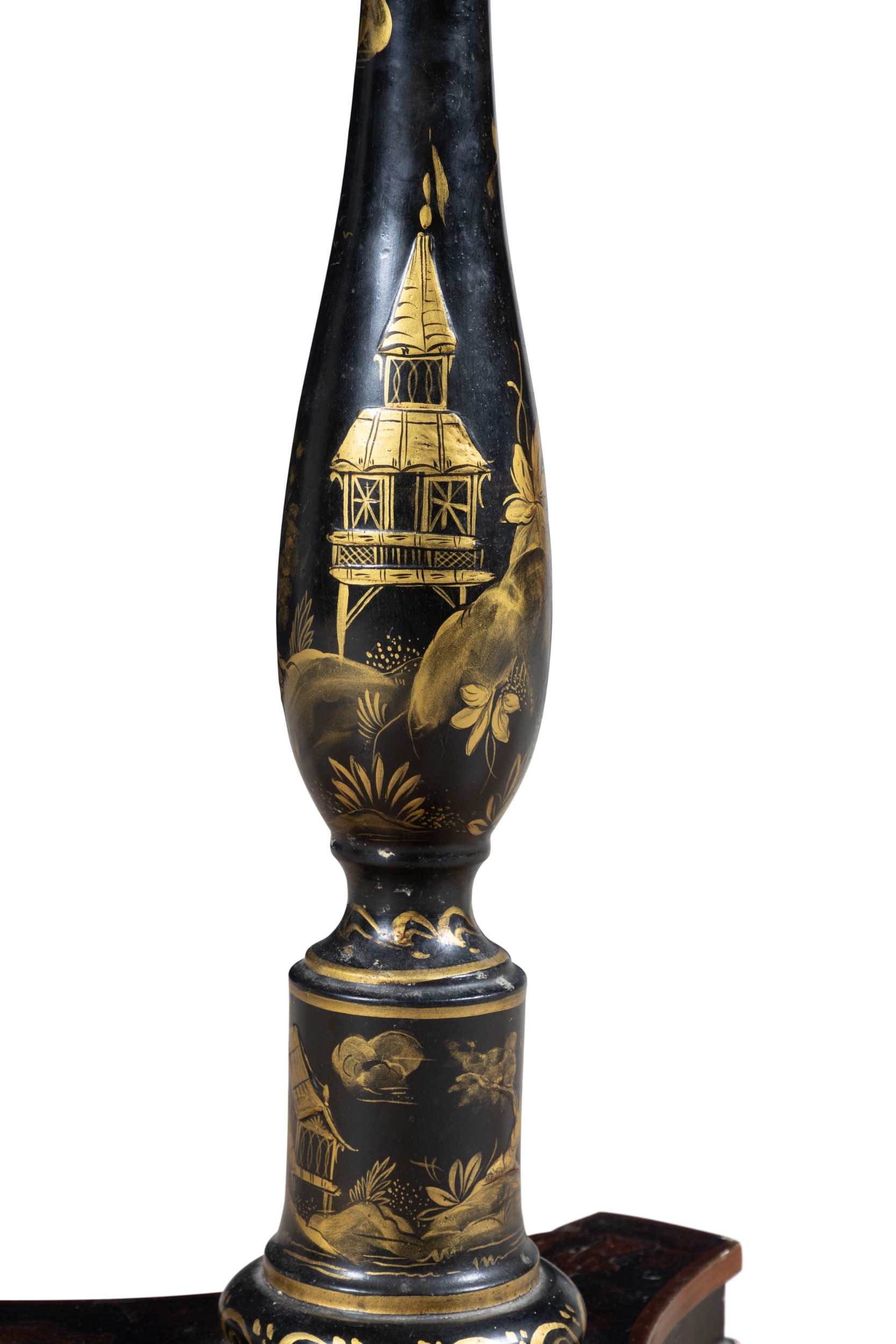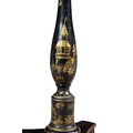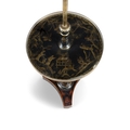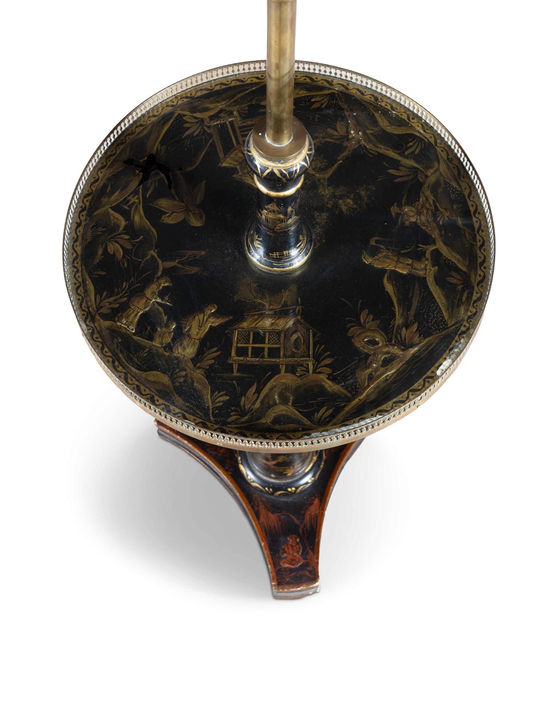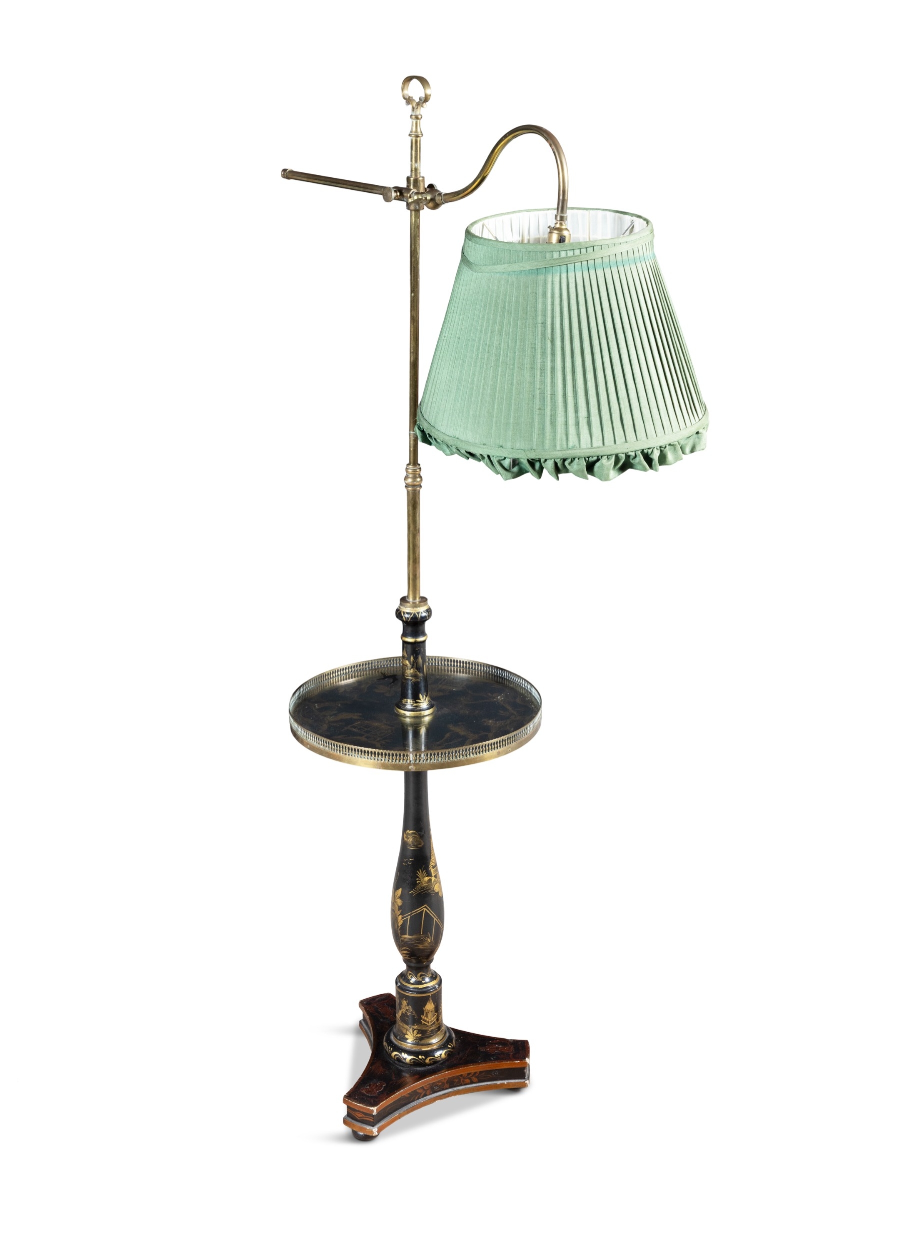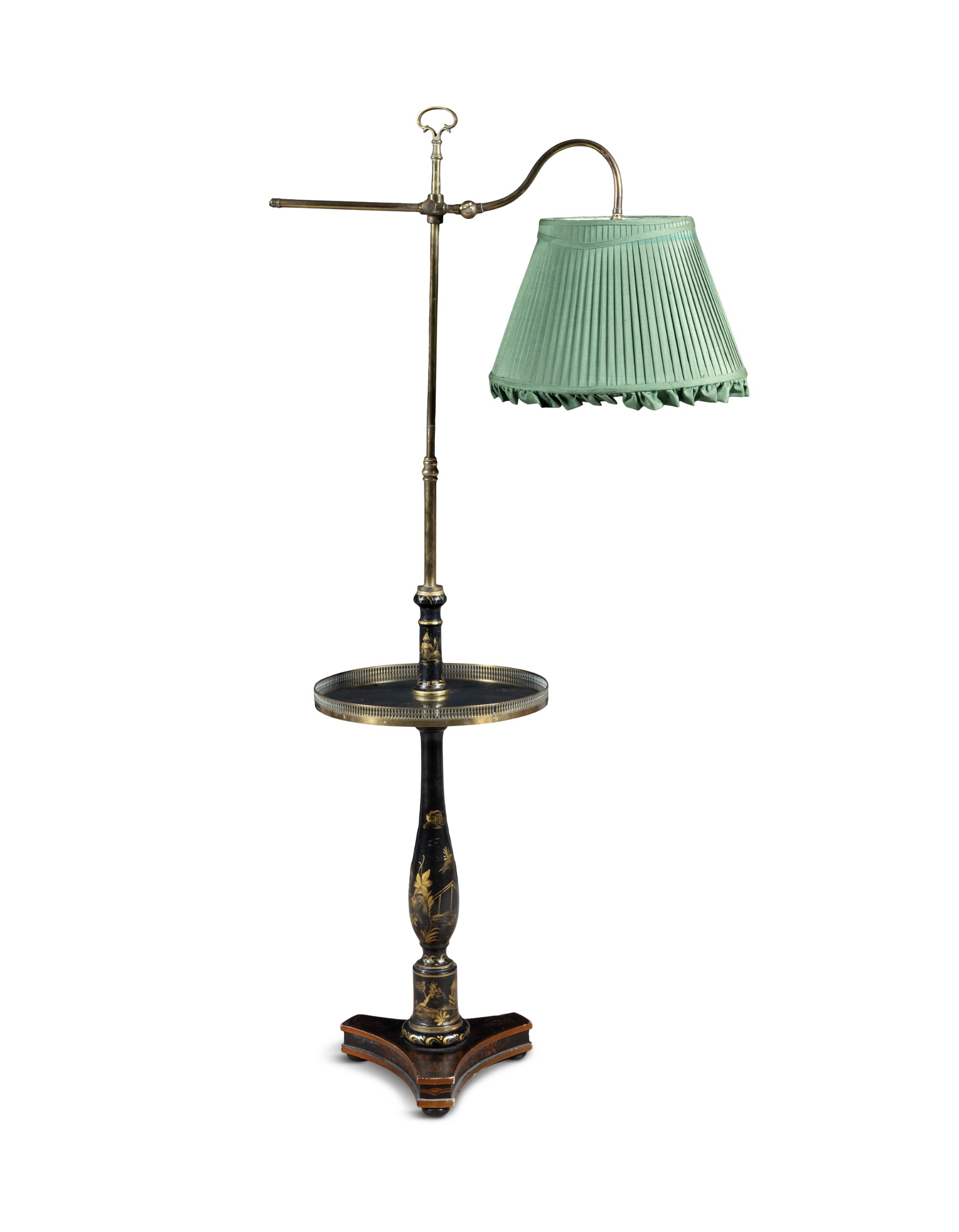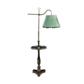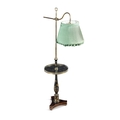 A BLACK AND GOLD JAPANNED STANDARD LAMP AND READING TABLE, (E) c. 157cm high ELECTRICAL GOOD IN NEED OF REWIRING ARE INDICATED BY THE SYMBOL **'(E)'** These are sold as 'antiques' only and if bought for use, buyers must have them checked over for compliance with safety regulations by a qualified electrician before you use them. Adam's does not take responsibility for non-functioning electrical goods as most second-hand electrical items sold at auction require re-wiring even if functioning at the time of the auction viewing.