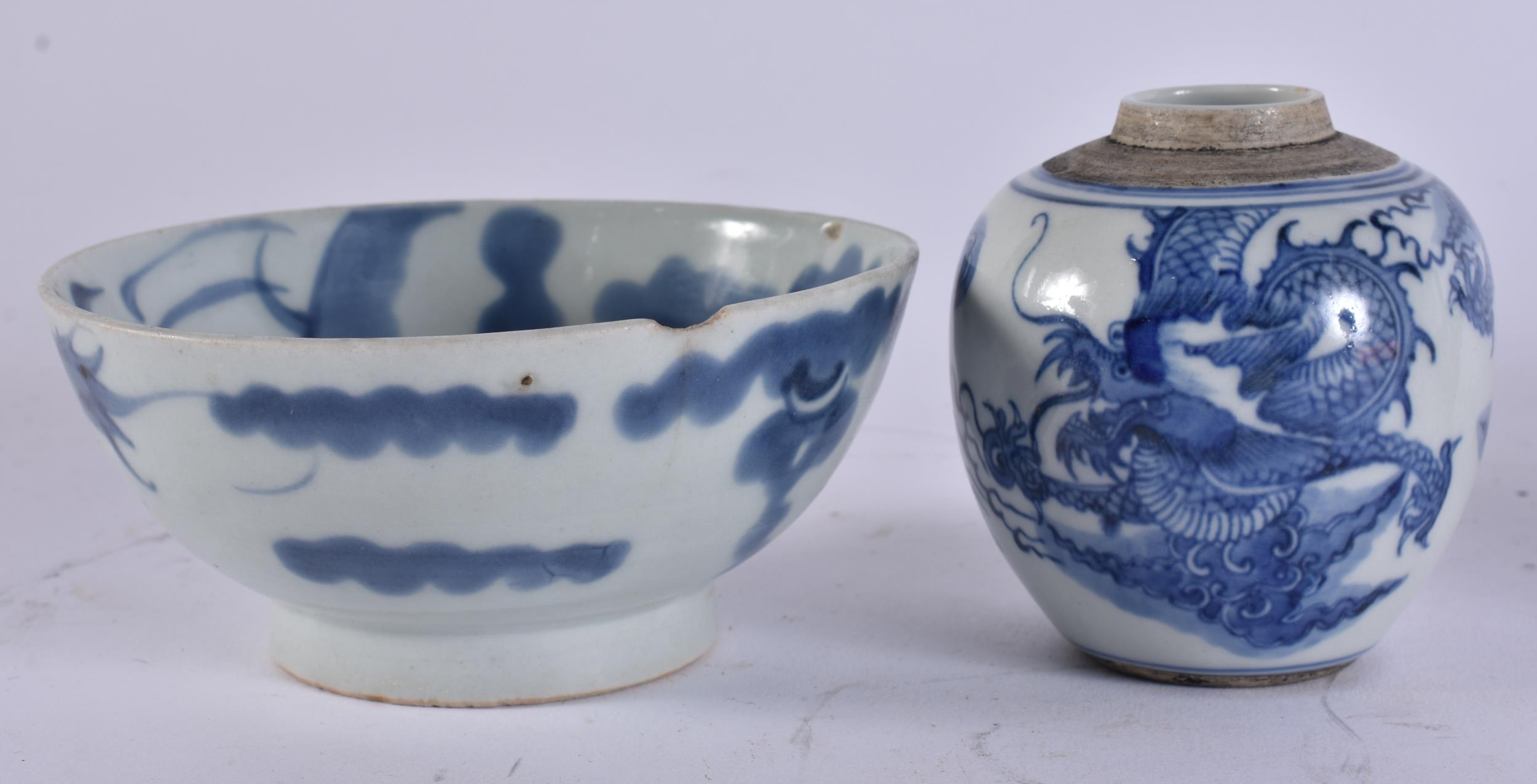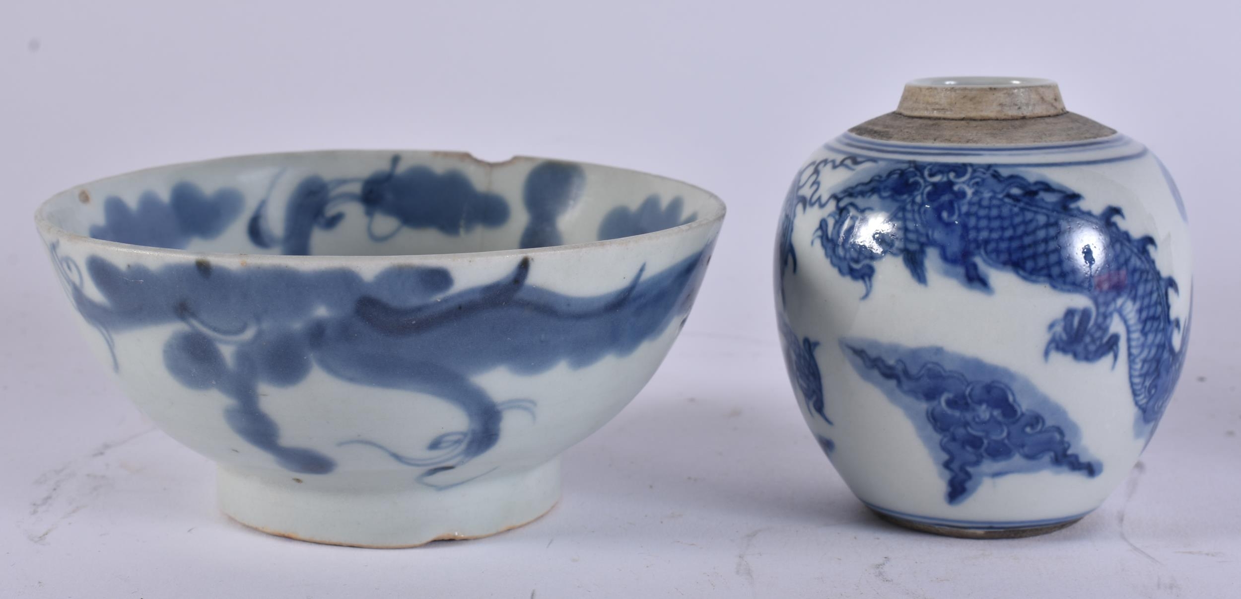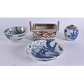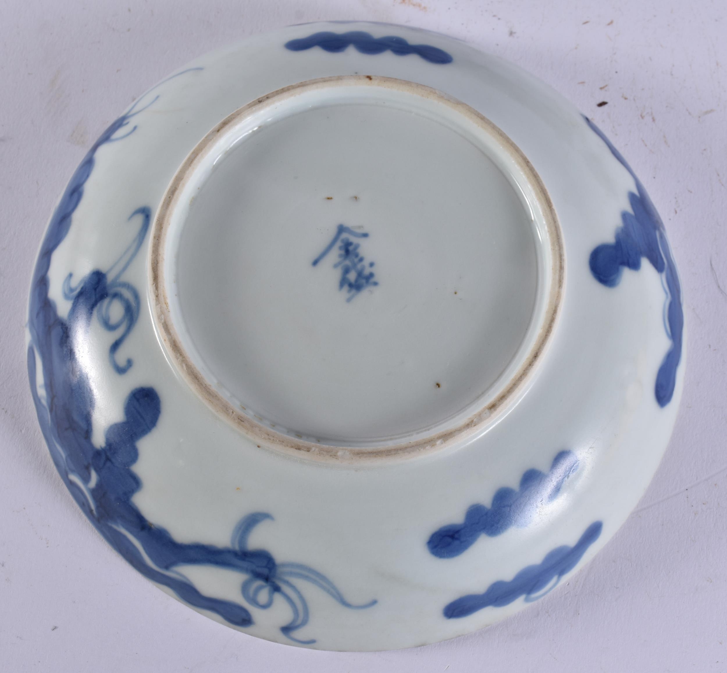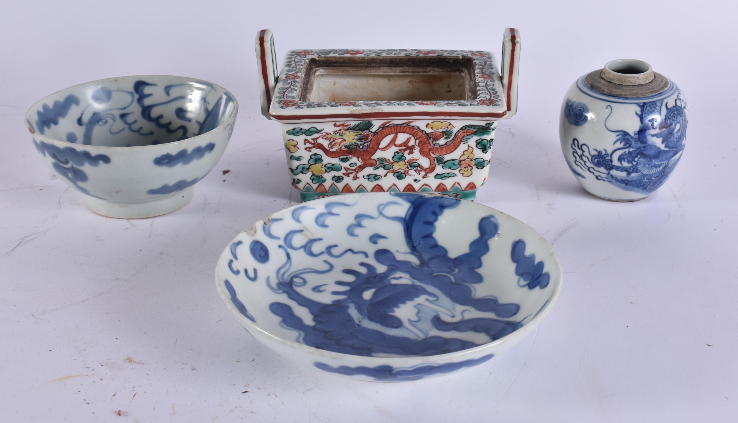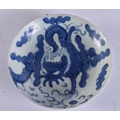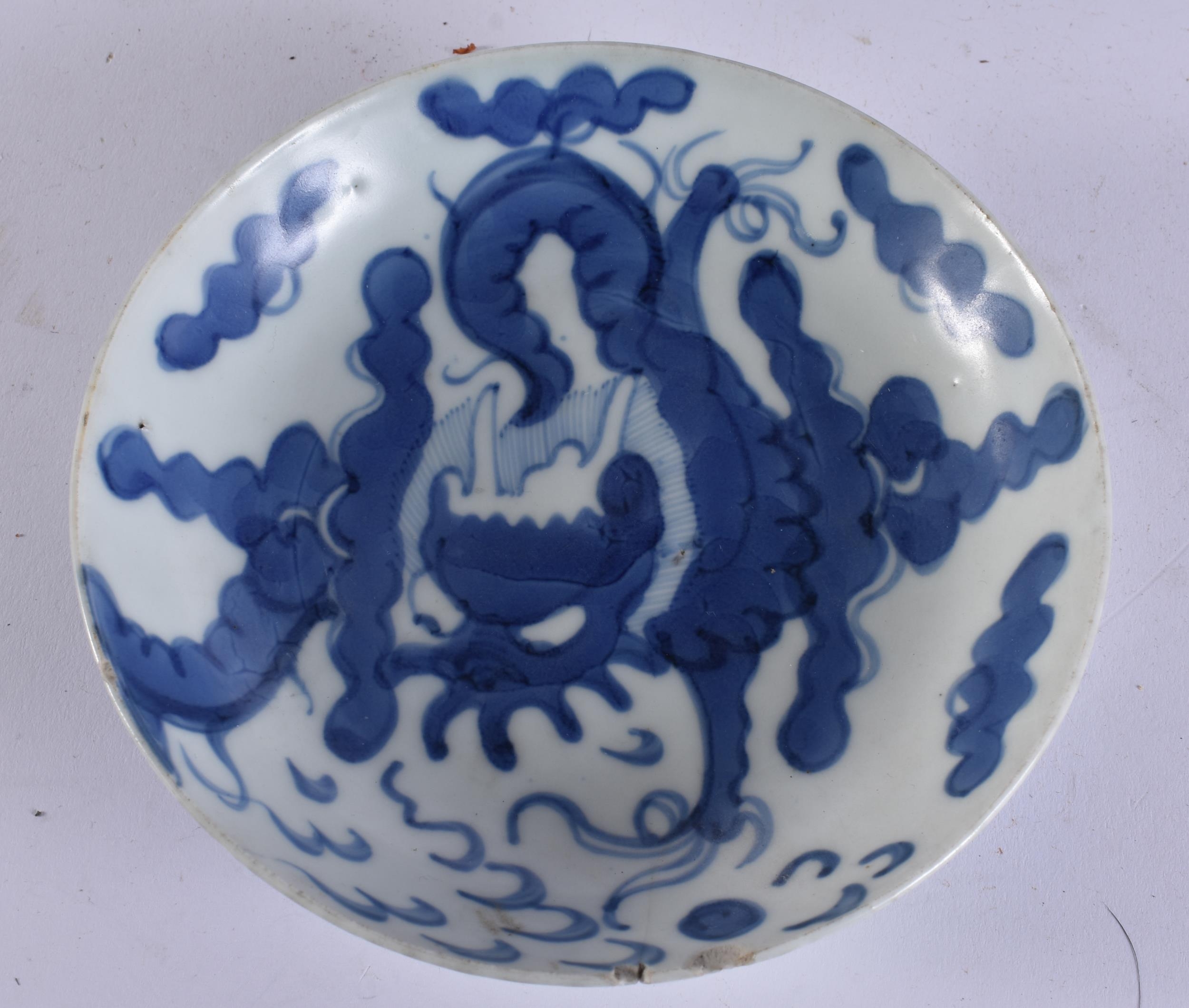 A CHINESE QING DYNASTY BLUE AND WHITE PORCELAIN DRAGON DISH together with other porcelain. Largest 15 cm wide. (4)