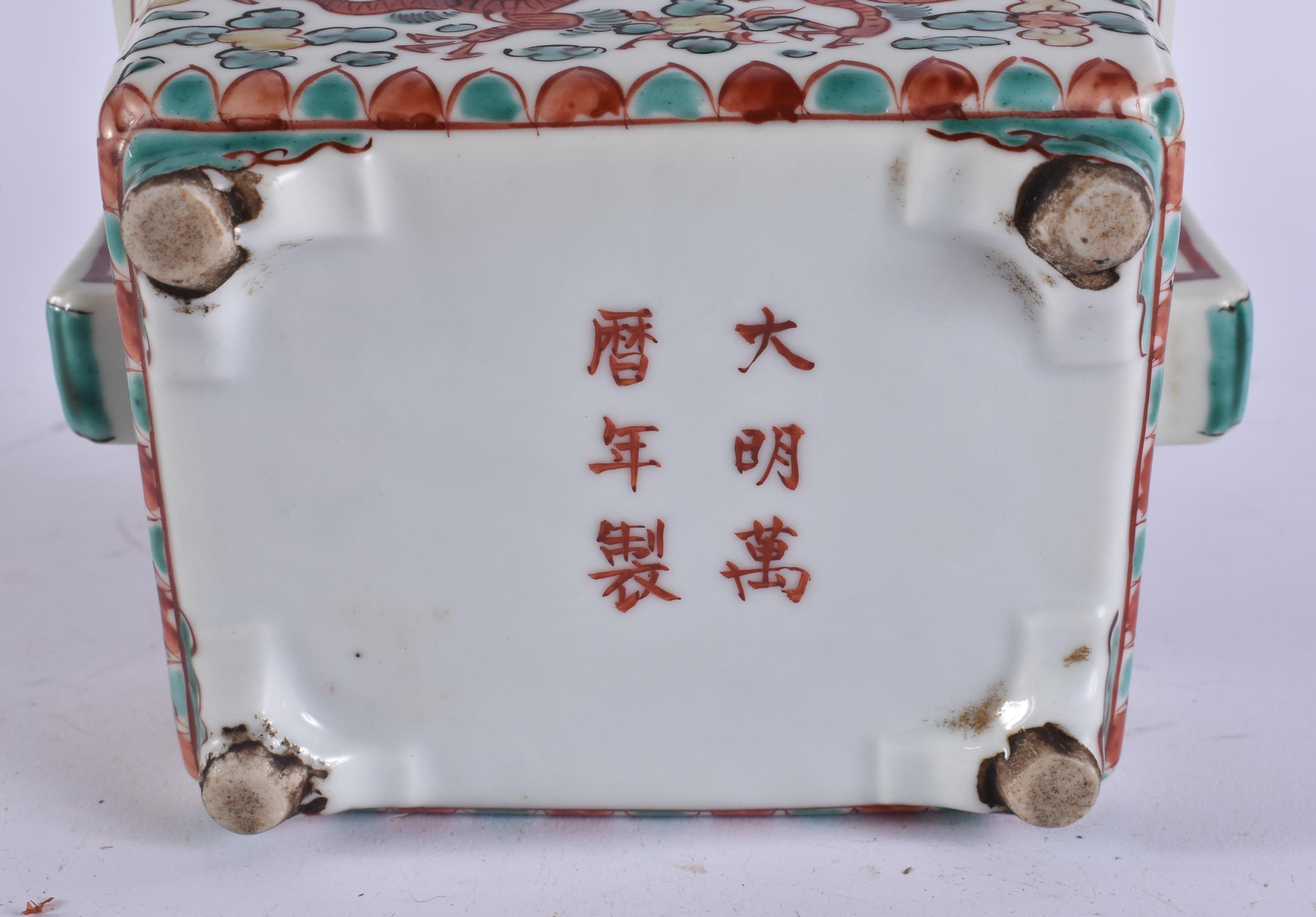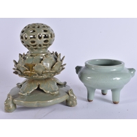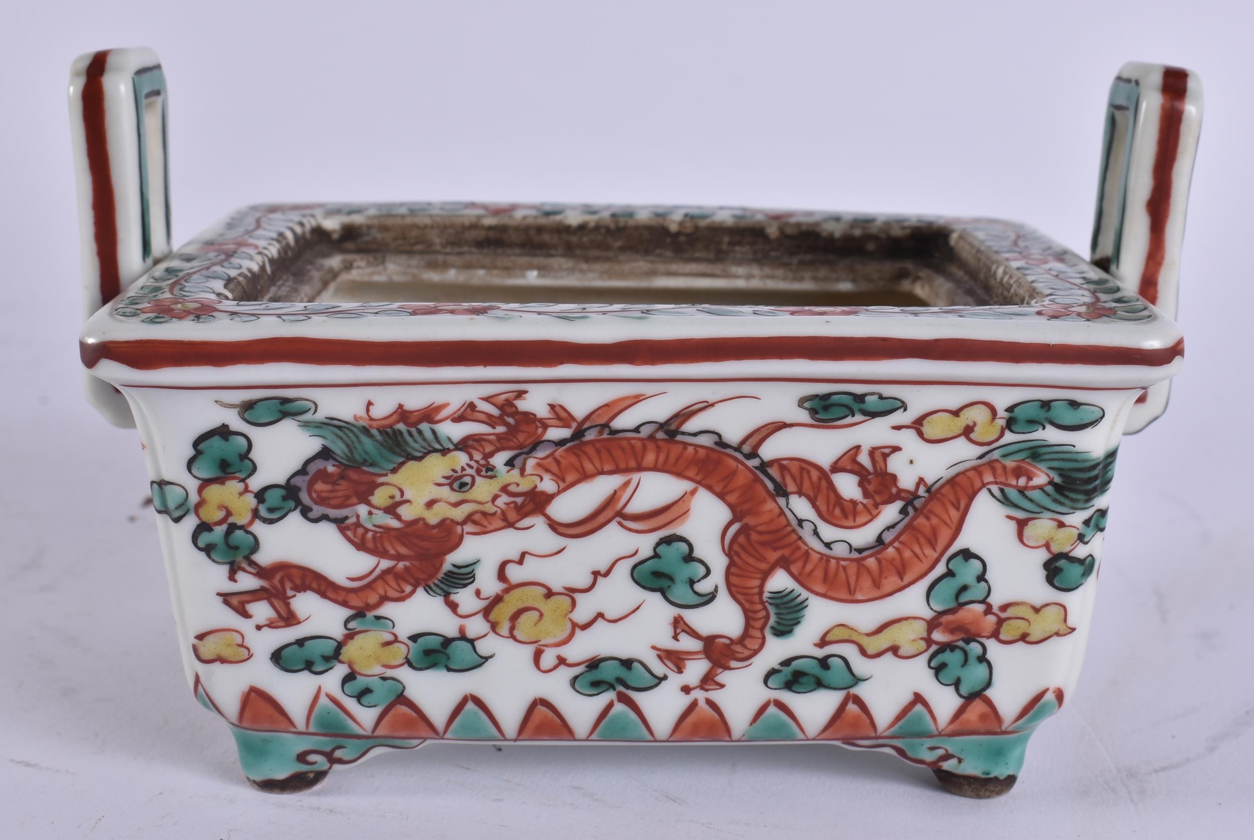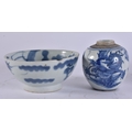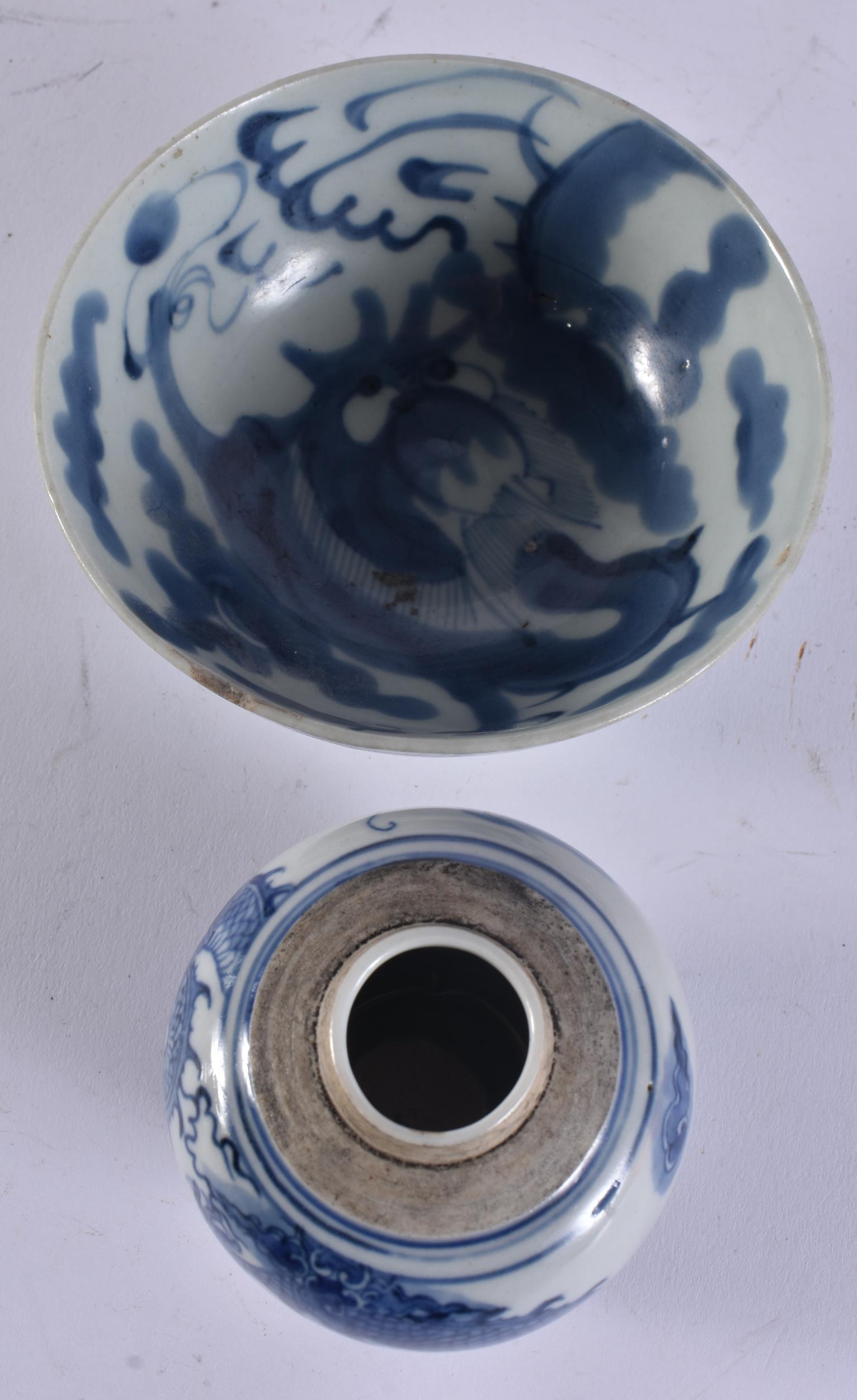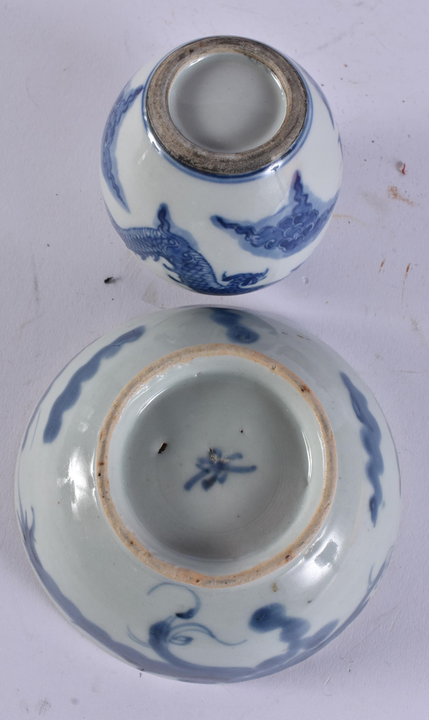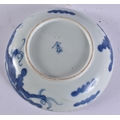 A CHINESE QING DYNASTY BLUE AND WHITE PORCELAIN DRAGON DISH together with other porcelain. Largest 15 cm wide. (4)