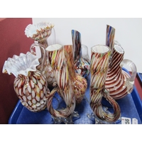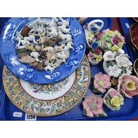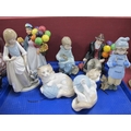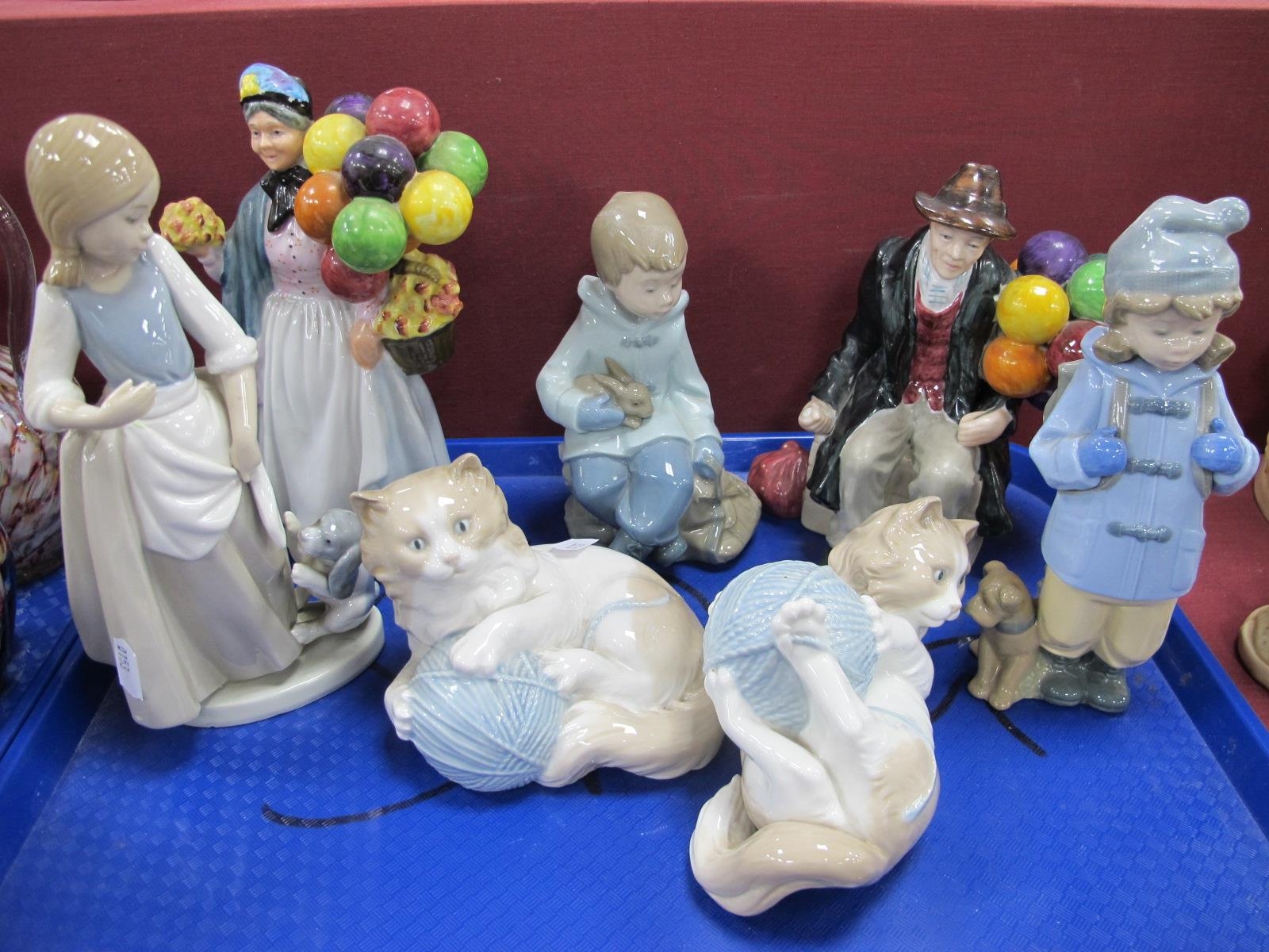 Nao Figures, a boy sat on rocks, girl with rucksack, playful kittens, two Leonardo figures of balloon sellers:- One Tray.