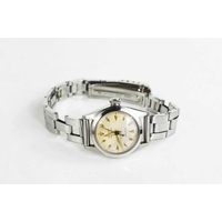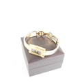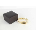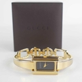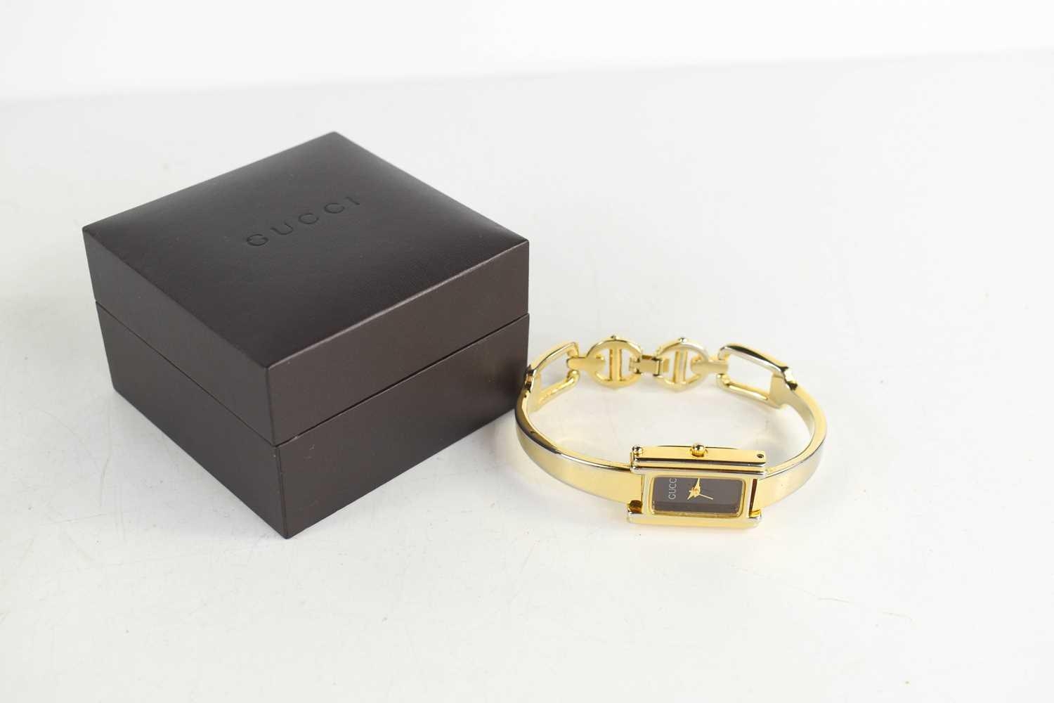 A vintage Gucci mood watch, the signed rectangular dial changes colour from black, through shell pink to green and finally indigo blue, quartz movement, with gold plated bracelet strap and snaffle link clasp, complete with original box and receipt for movement change and battery.