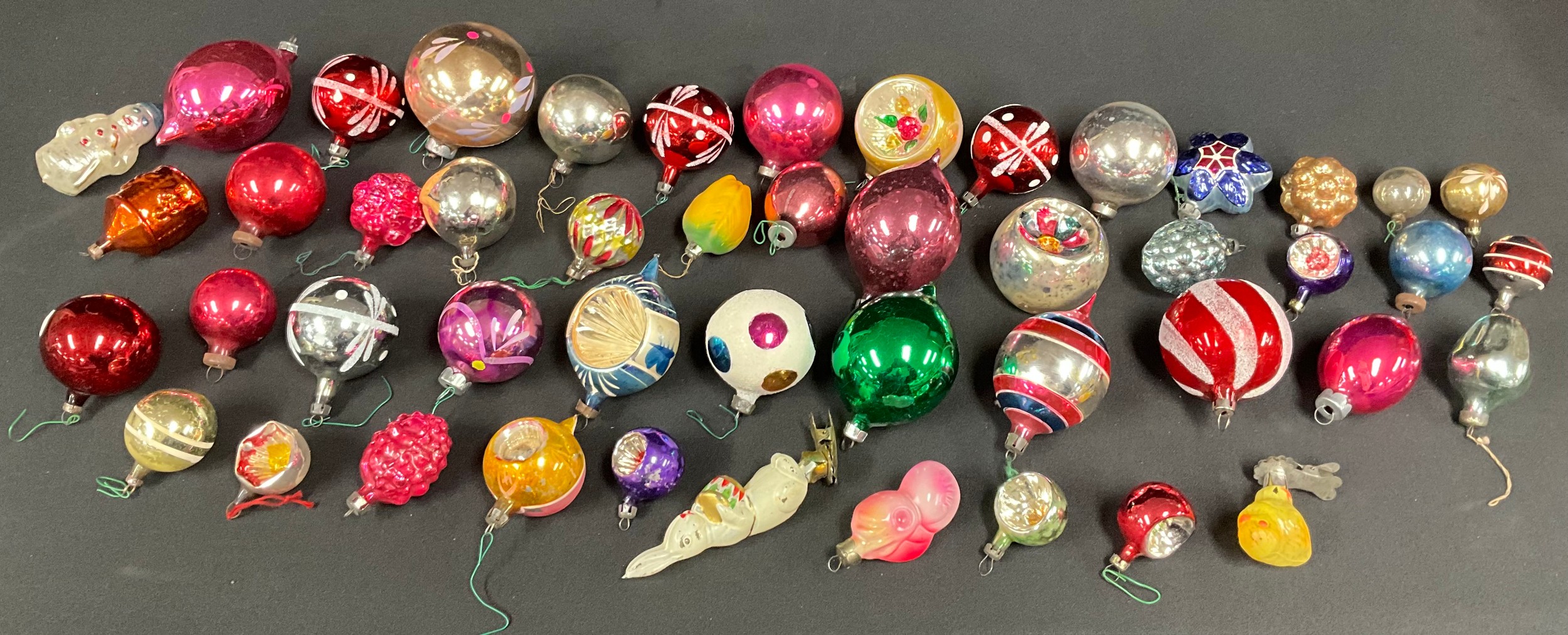 Interior Design - an assortment of mid-century mercury glass Christmas tree bauble decorations, various shapes including figural, concave, faceted, etc, approx. 50