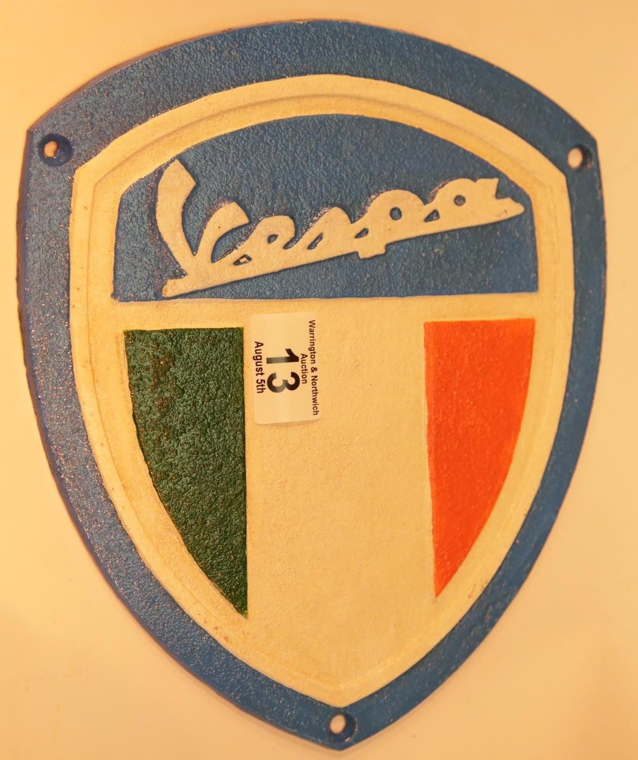 Cast iron Vespa shield, 26 x 22 cm. P&P Group 2 (£18+VAT for the first lot and £2+VAT for subsequent lots)