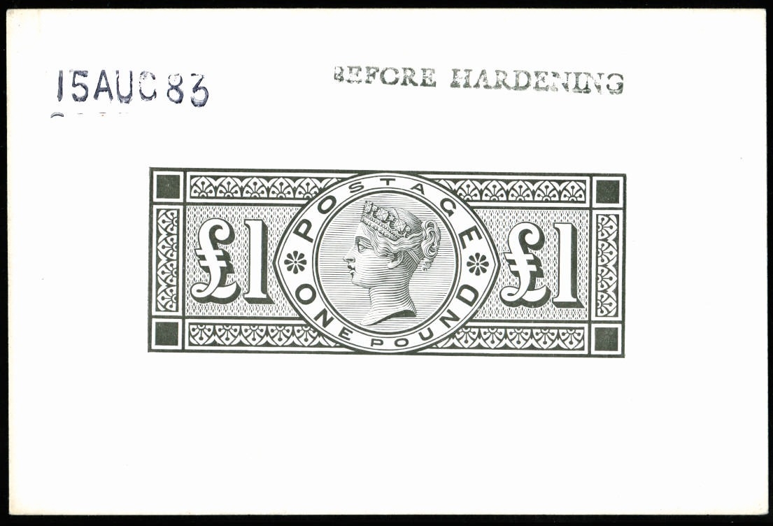 1883 £1 Die proof. Very fine example printed in black on white glazed card (92 x 61mm), endorsed"BEFORE HARDENING" and dated "15 AUG 83". Scarce.