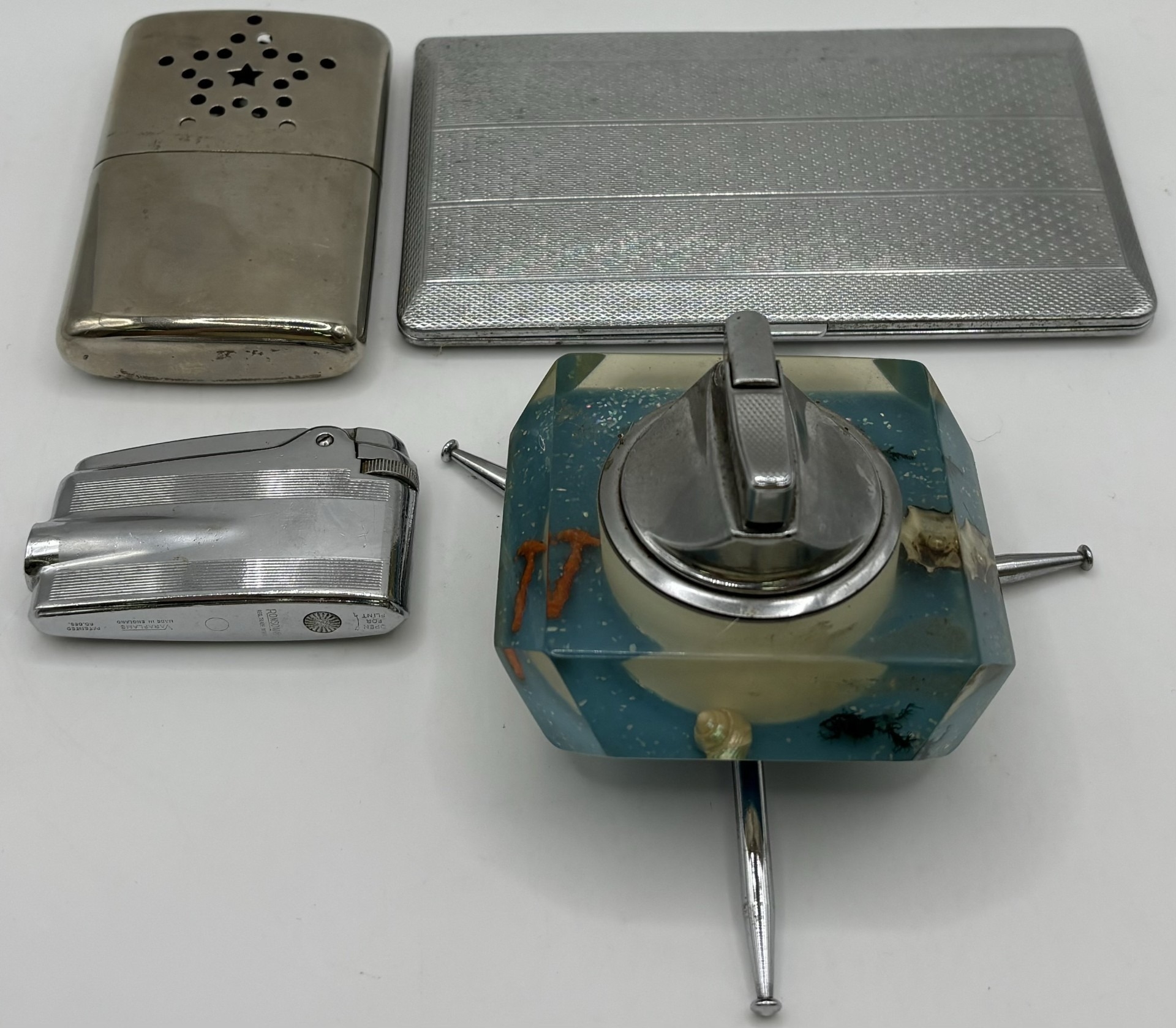 Collection of four vintage items. To include Ronson Varaflame lighter, table lighter, cigarette case & hand warmer.