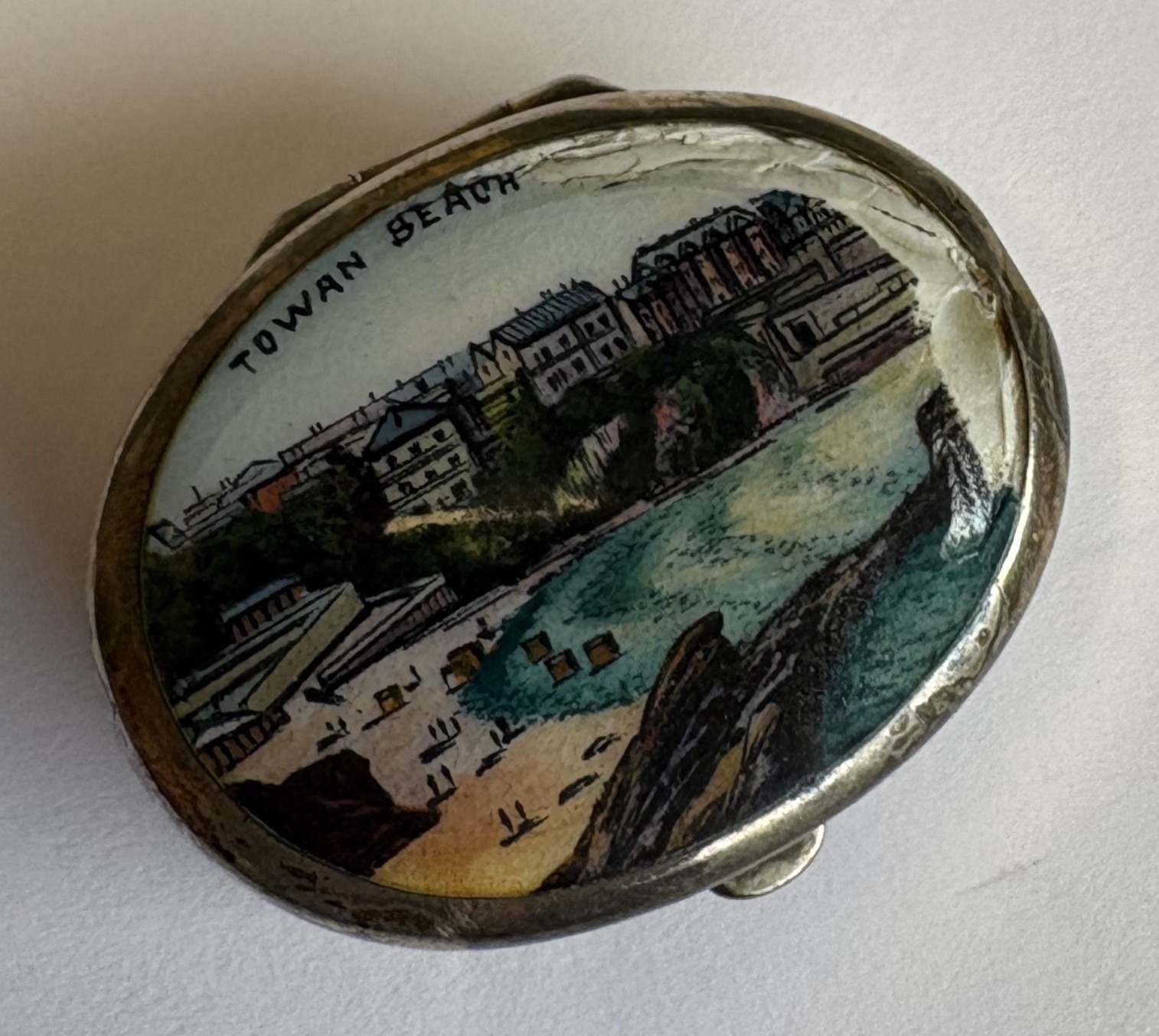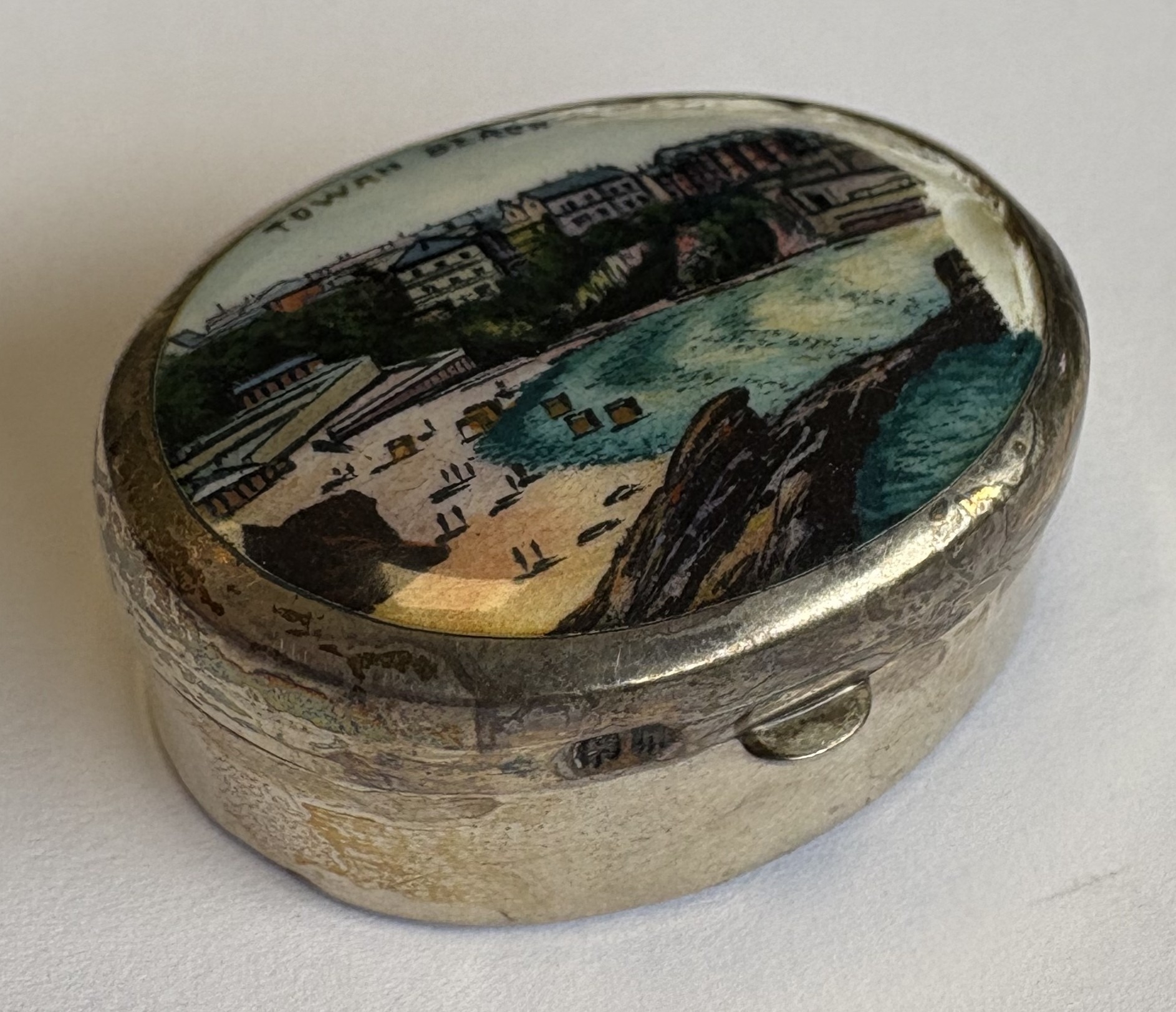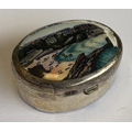 An oval silver and enamelled box with hinged cover. Approx. 11 grams. Est. £10 - £20.