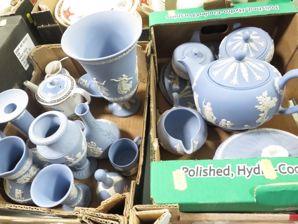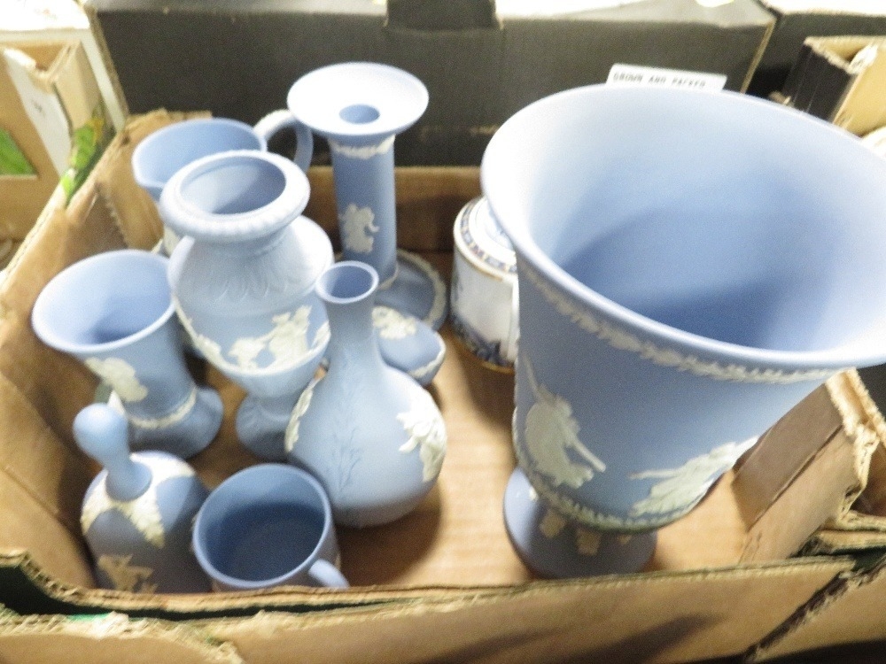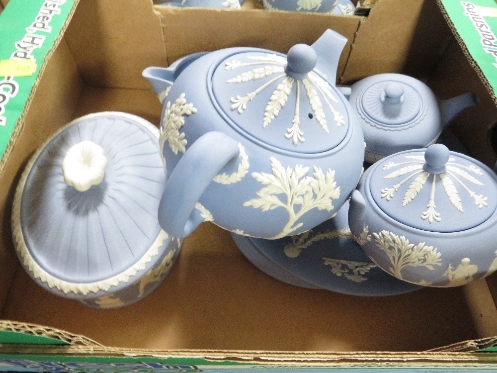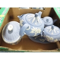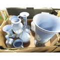 Two trays of assorted Wedgwood Jasperware to include a three piece tea service etc
