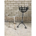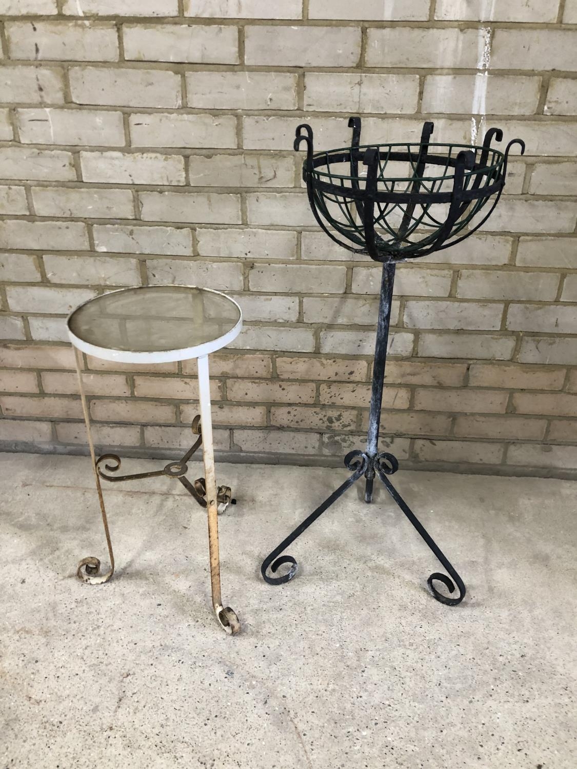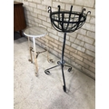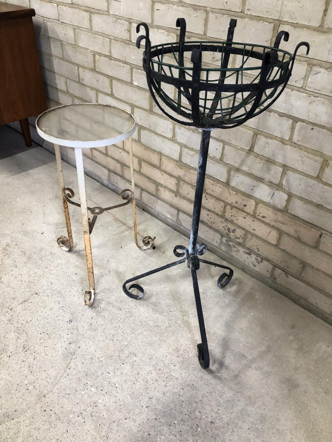 A wirework garden planter together with a white metal garden stand