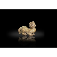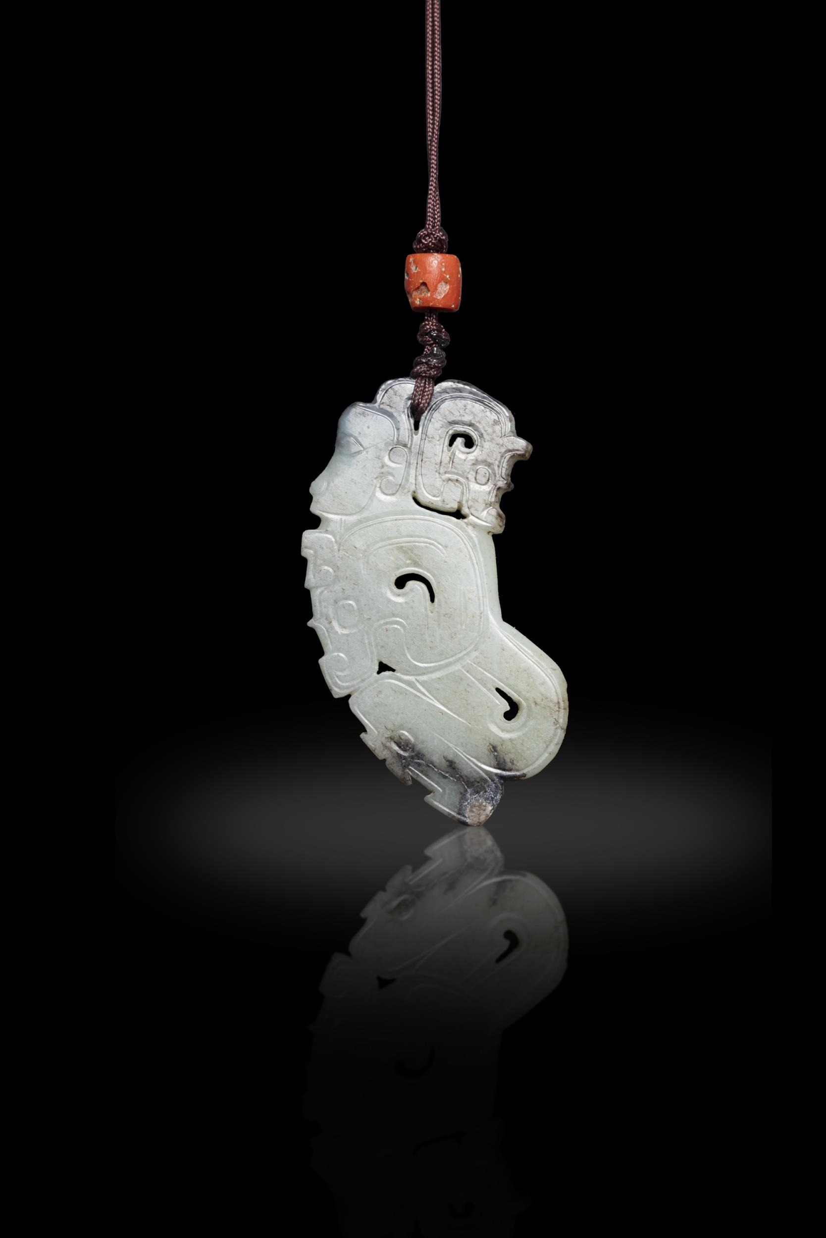 A BLACK AND WHITE FLAT JADE PENDANT DEPICTING 'MAN AND DRAGON' ???? ???? China, Zhou style H.6.4cm