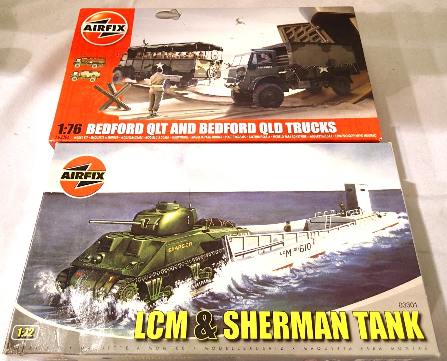 Two Airfix 1/72 scale military kits; LCM with Sherman tank, Bedford QLT and QLD trucks. Appears complete, unchecked. P&P Group 1 (£14+VAT for the first lot and £1+VAT for subsequent lots)