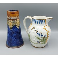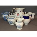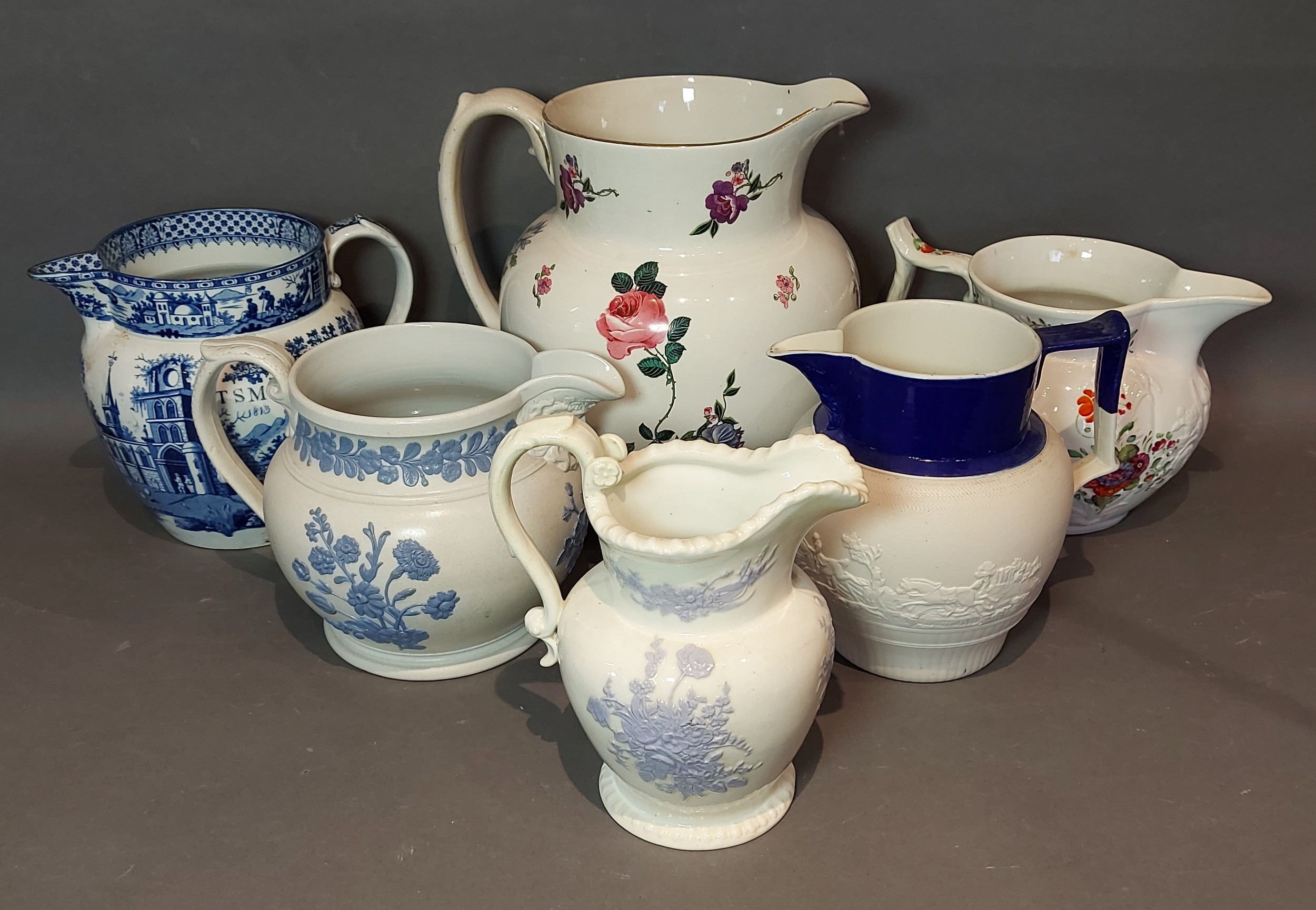 A Ridgway potter jug with relief decoration, 17cms tall, together with five other large jugs