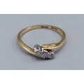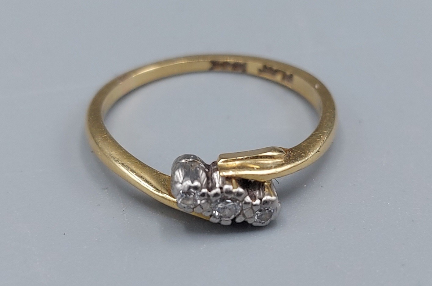An 18ct gold three stone Diamond ring of crossover form, 2.5gms, ring size K