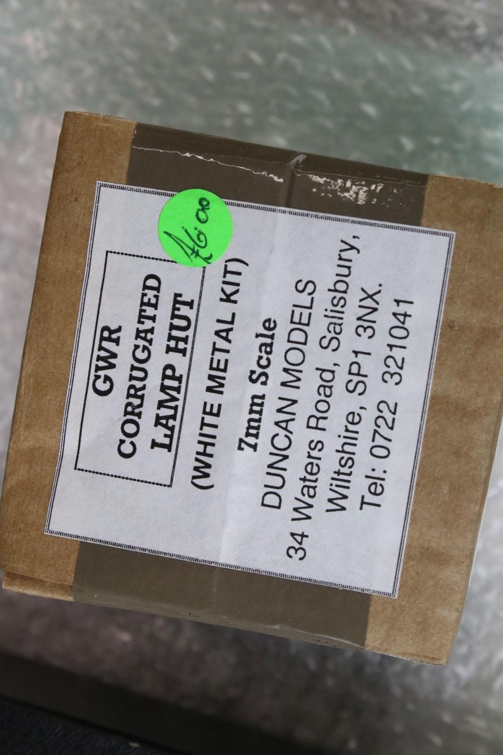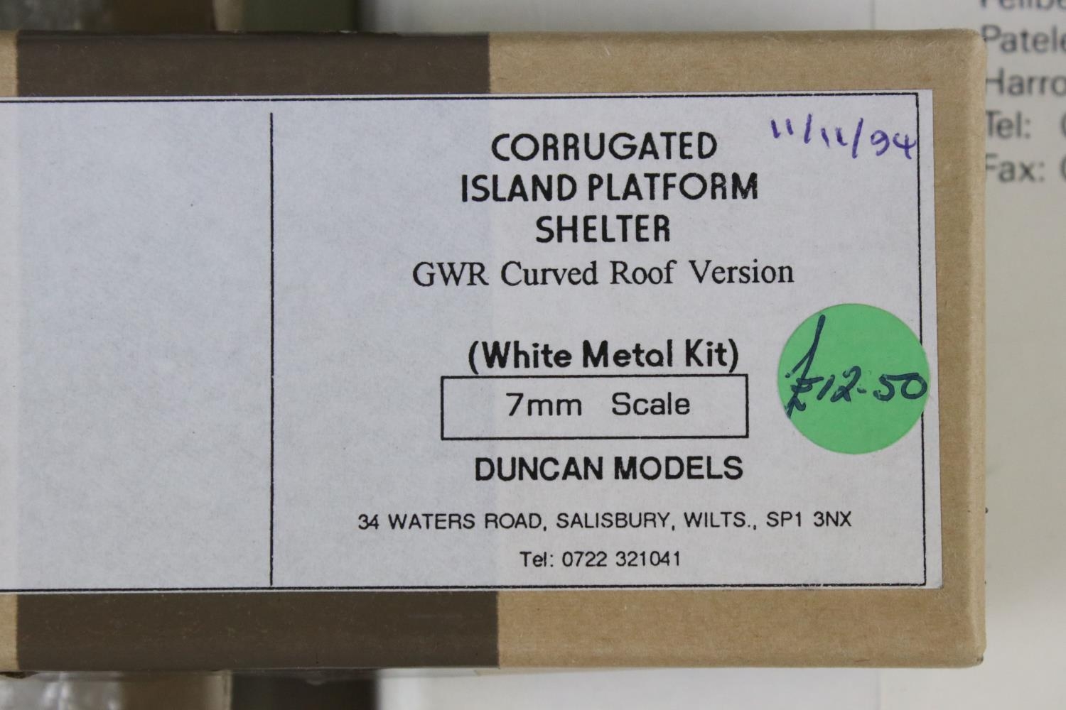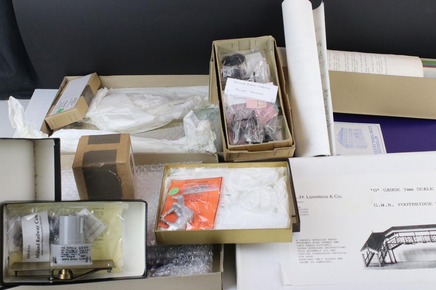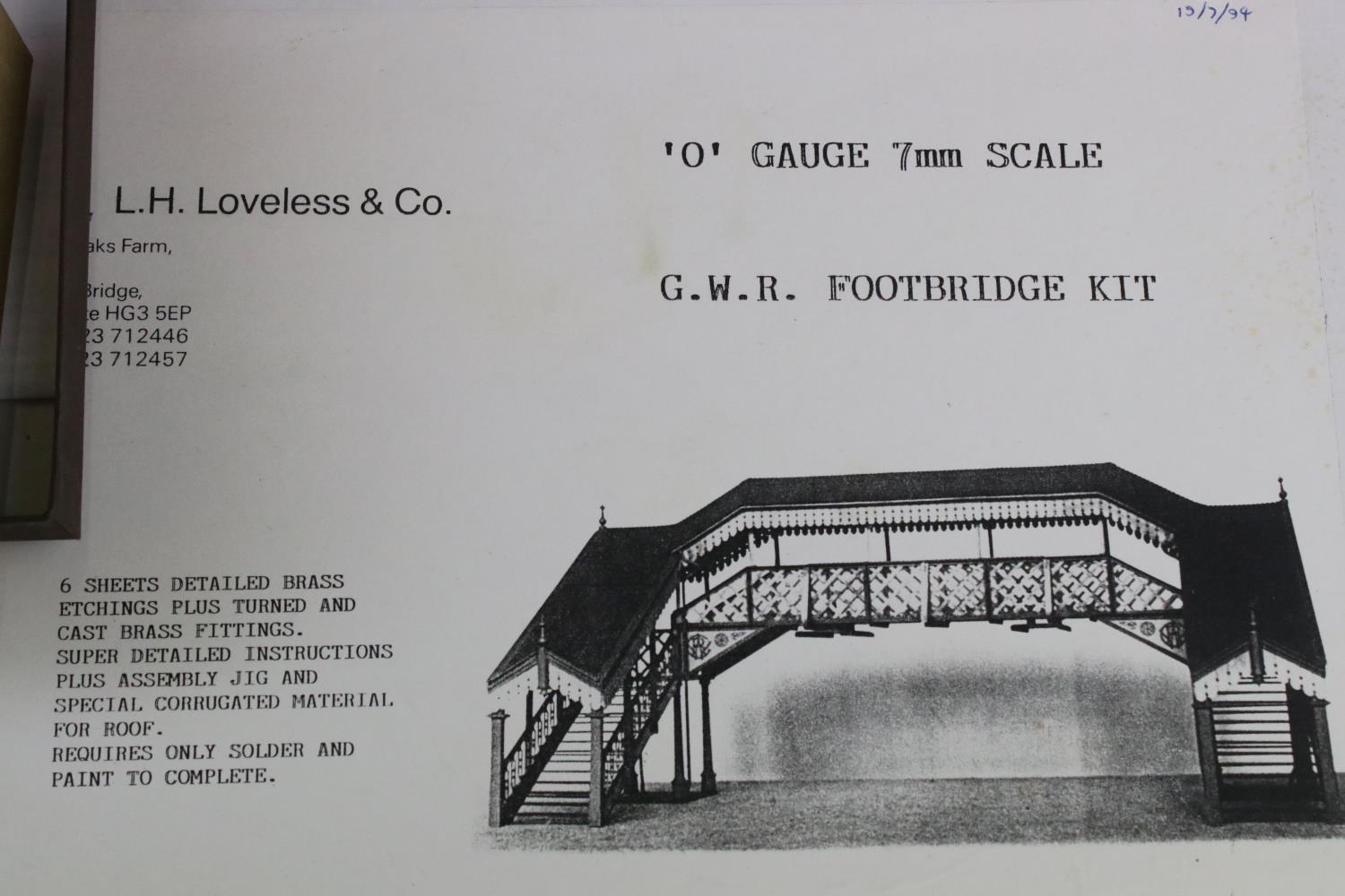 Quantity of O gauge / 7mm scale white metal and brass model railway accessories to include Duncan models Island Platform Shelter, DM Horse Drawn Delivery Van, LH Loveless & Co GWR Footbridge Kit, Modelex CM42 GWR Signal Box kit etc