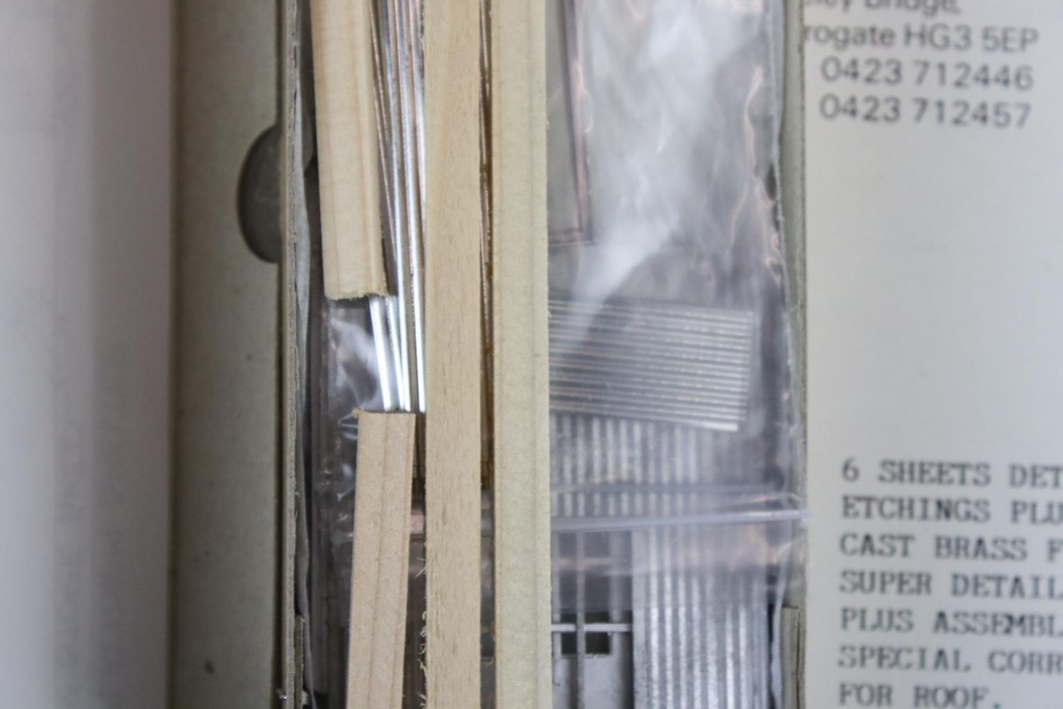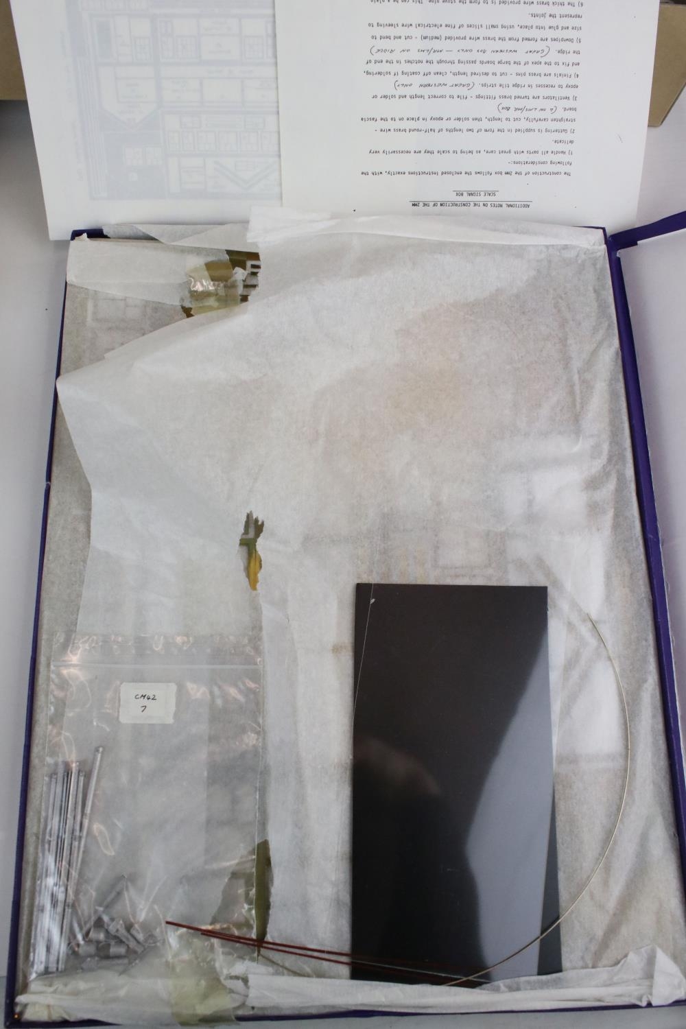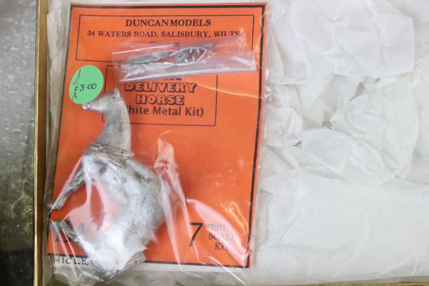 Quantity of O gauge / 7mm scale white metal and brass model railway accessories to include Duncan models Island Platform Shelter, DM Horse Drawn Delivery Van, LH Loveless & Co GWR Footbridge Kit, Modelex CM42 GWR Signal Box kit etc