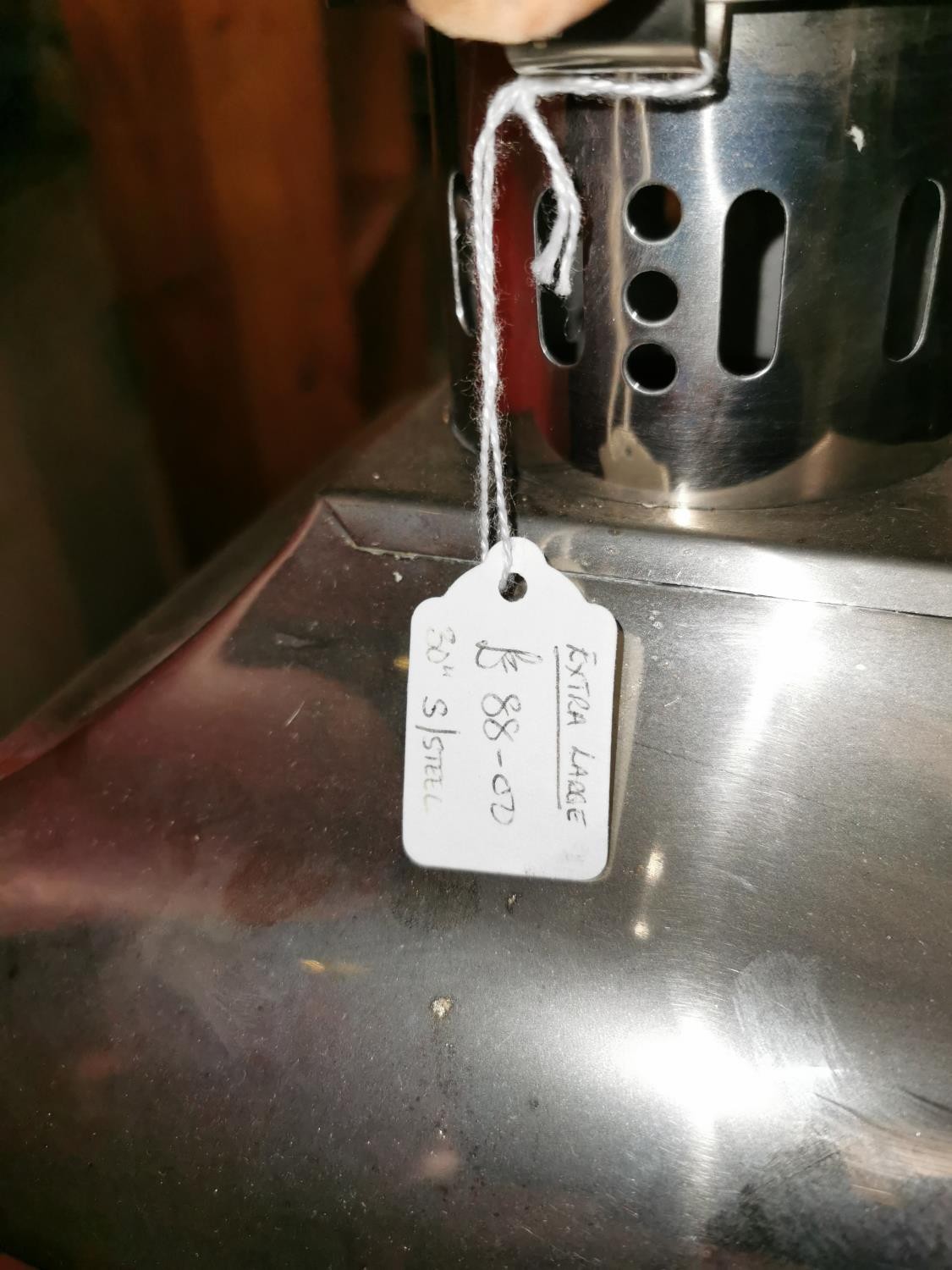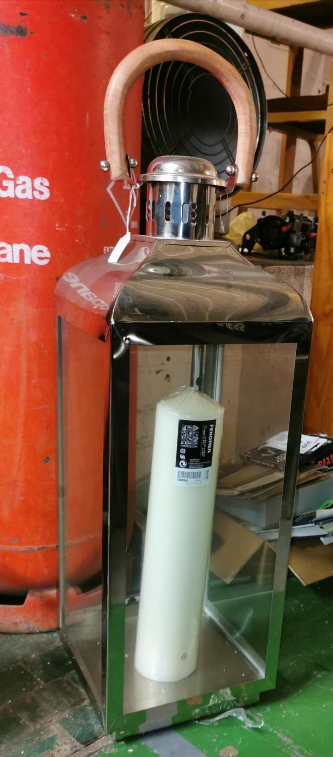 As new extra large 30" stainless steel with wooden handle candle lantern plus new Ikea Fenomen 45 cm tall candle