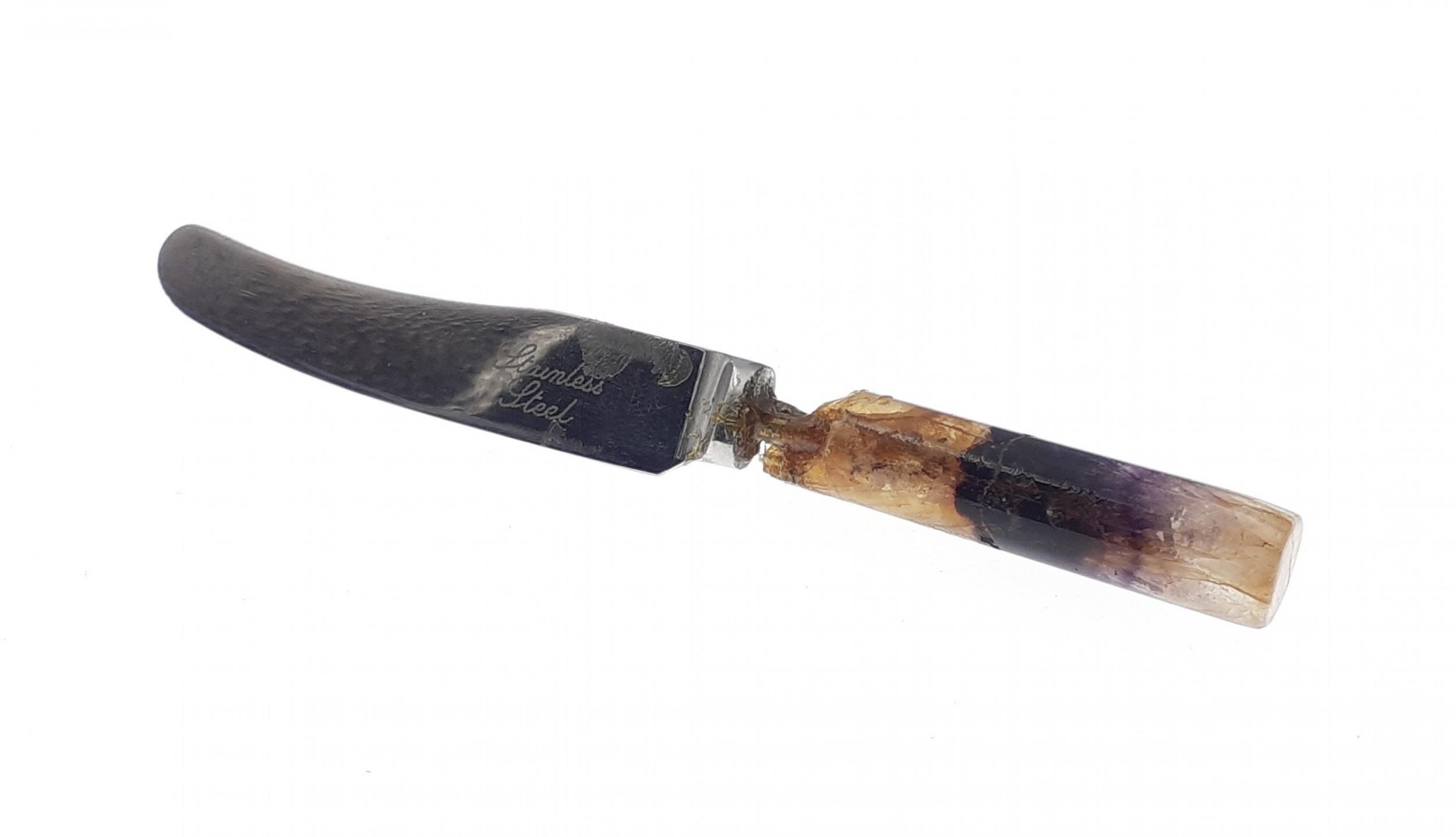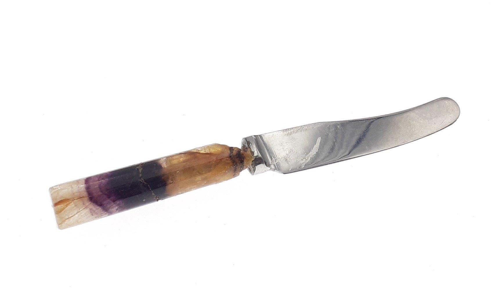 Small BLUE JOHN handled butter knife. Note damage to the handle and crack. Still a lovely piece of blue john which hopefully could be repurposed.
