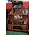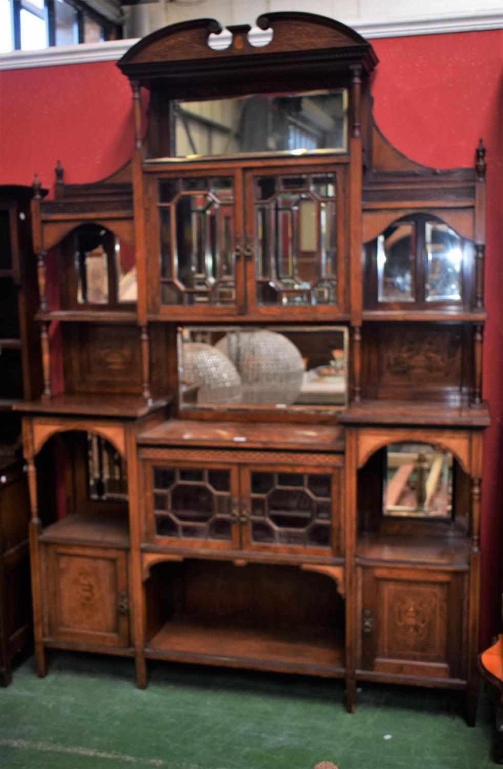 An Edwardian salon display cabinet, swan neck pediment above a dentil frieze and a rectangular bevelled mirror, the stepped superstructure with an arrangement of glazed doors, open shelves and a pair of panel doors inlaid with flowering urns, tapered square legs, 240cm high