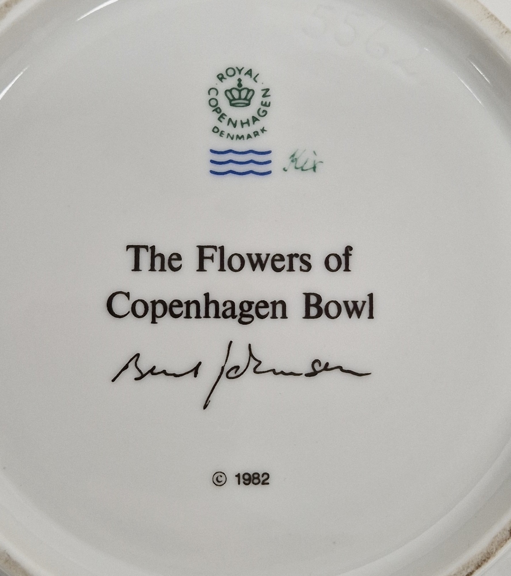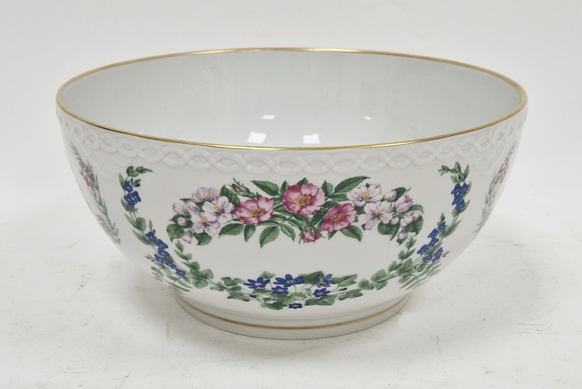 Royal Copenhagen commemorative 'The Flowers of Copenhagen' bowl, printed and painted marks, circa 1982, printed with floral swags and garlands, within gilt line rims, 24 cm diam.