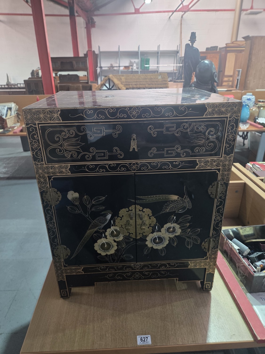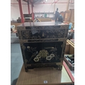 A black lacquered oriental style cabinet with single drawer above two doors