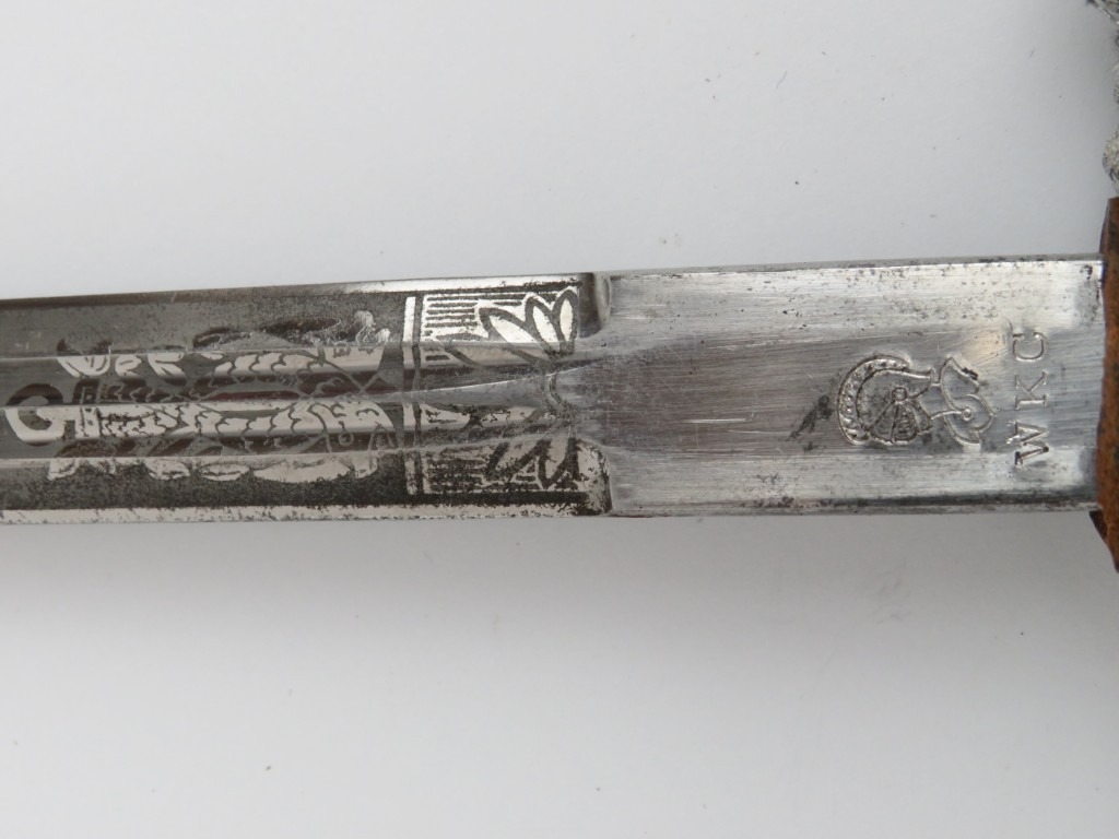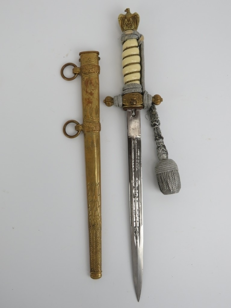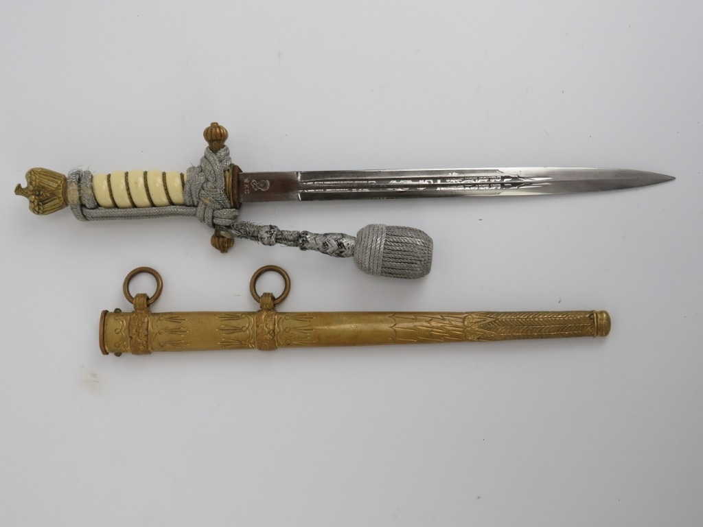 A WWII era German Third Reich Kriegsmarine naval officers dress dagger. With rope twist ivorine handle. Marked ‘W.K.C.’ to the ricasso. 42 cm total length.