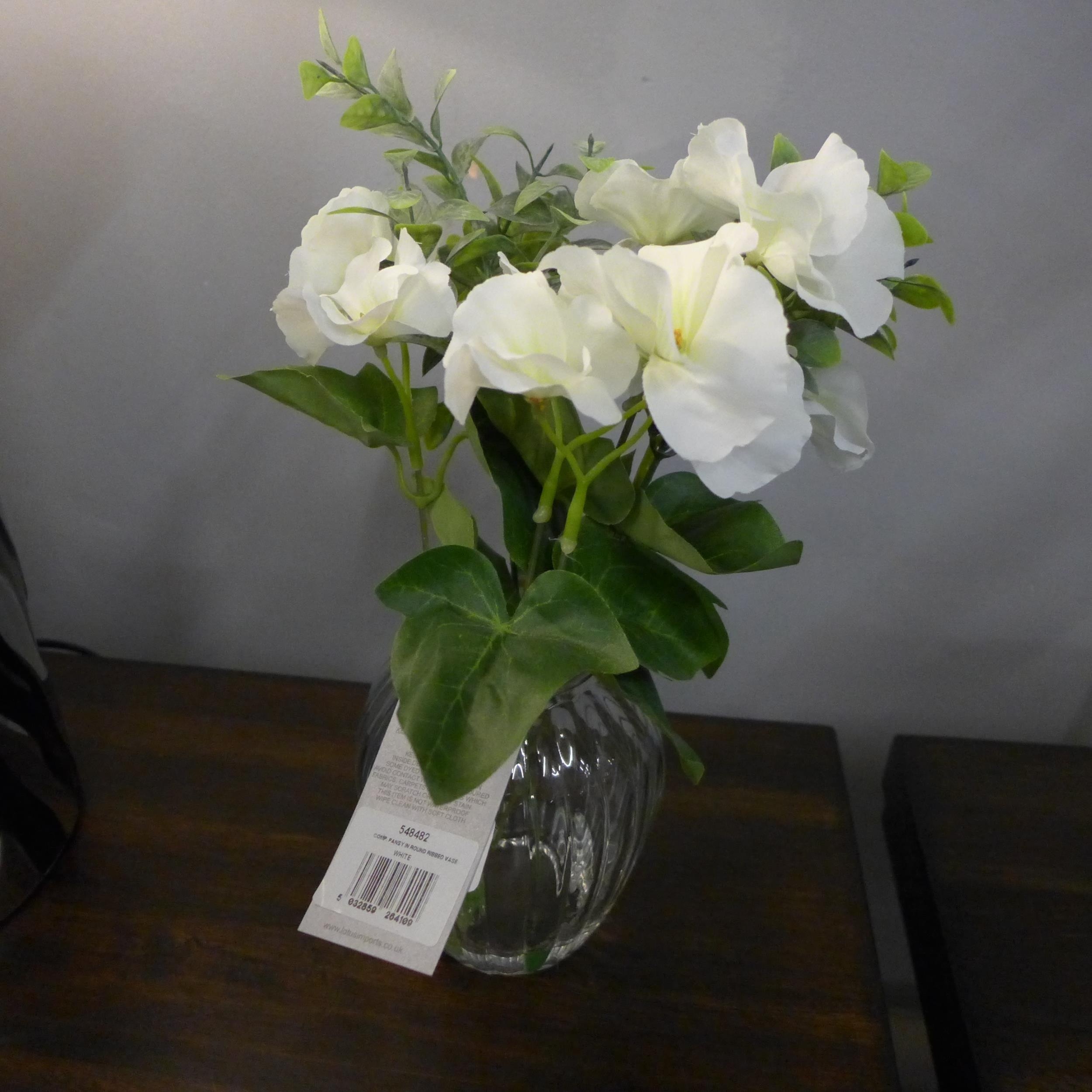 A spray of white pansies in a ribbed glass vase, H 30cms (54848204) #