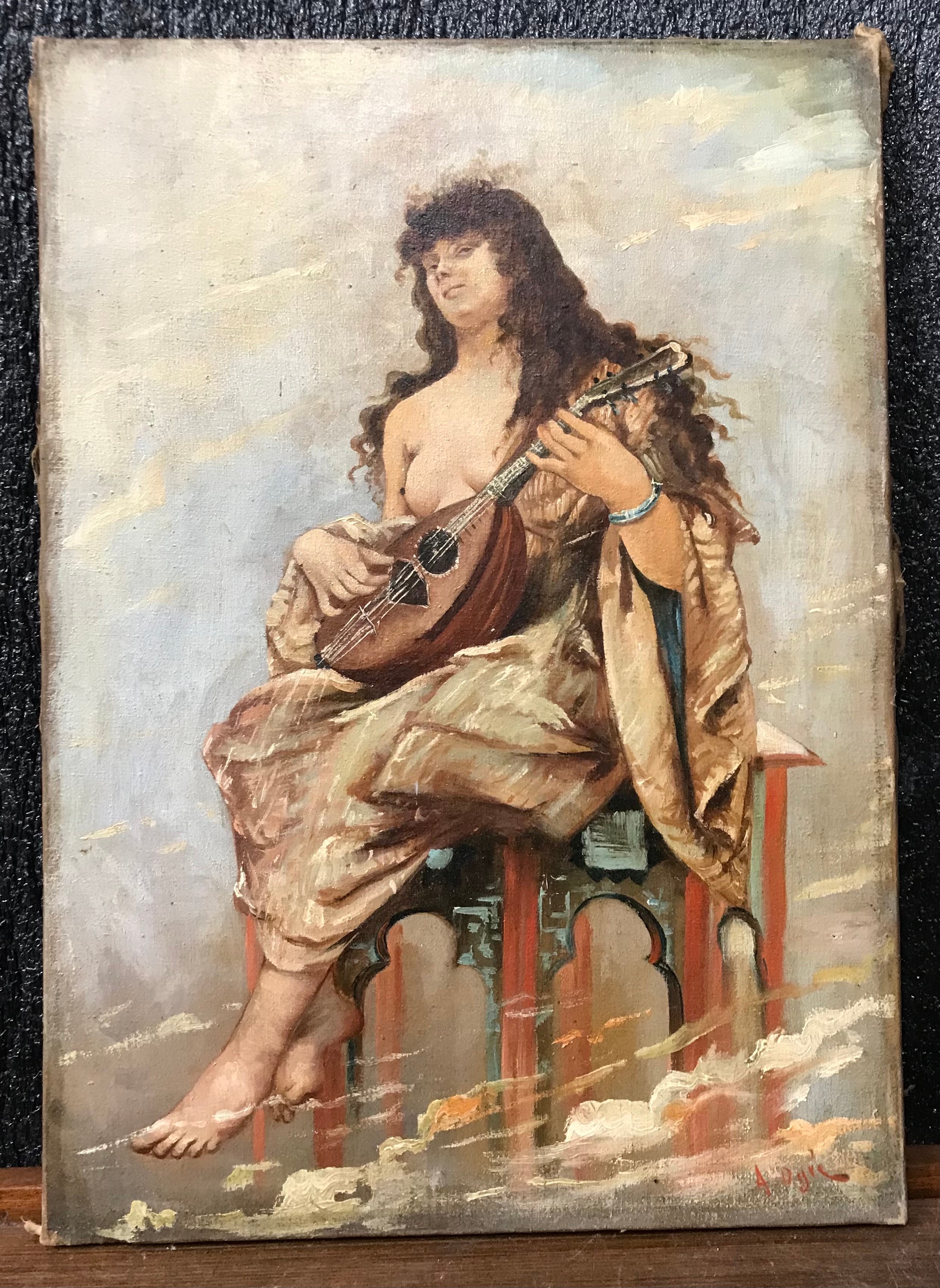 Italian School, portrait of a semi nude female playing a mandolin, oil on canvas, indistinctly signed, framed