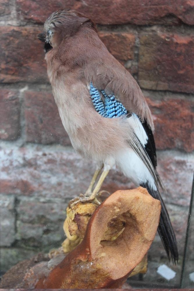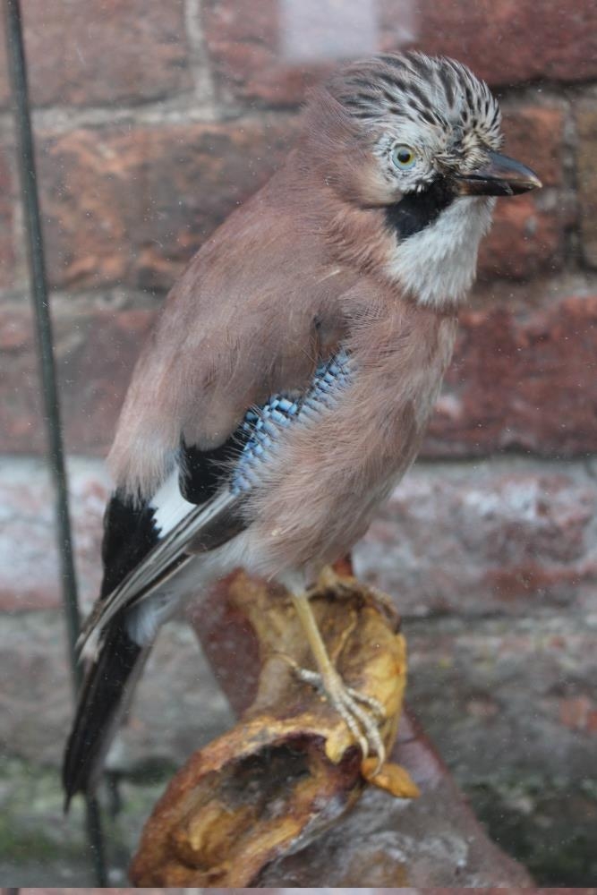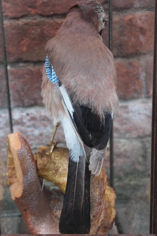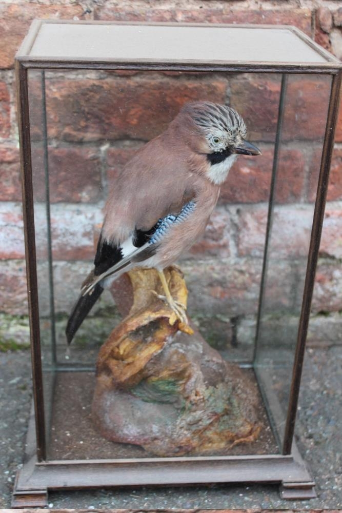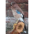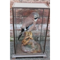TAXIDERMY - A CASED MID 20TH CENTURY STUDY OF A JAY, on a naturalistic base, H 44.5 cm, W 26.5 cm, D 23 cm