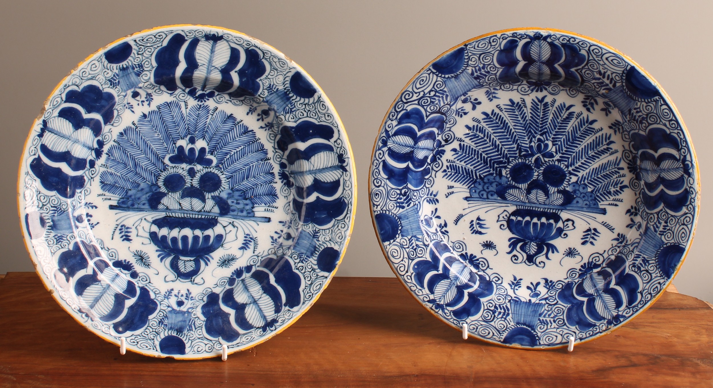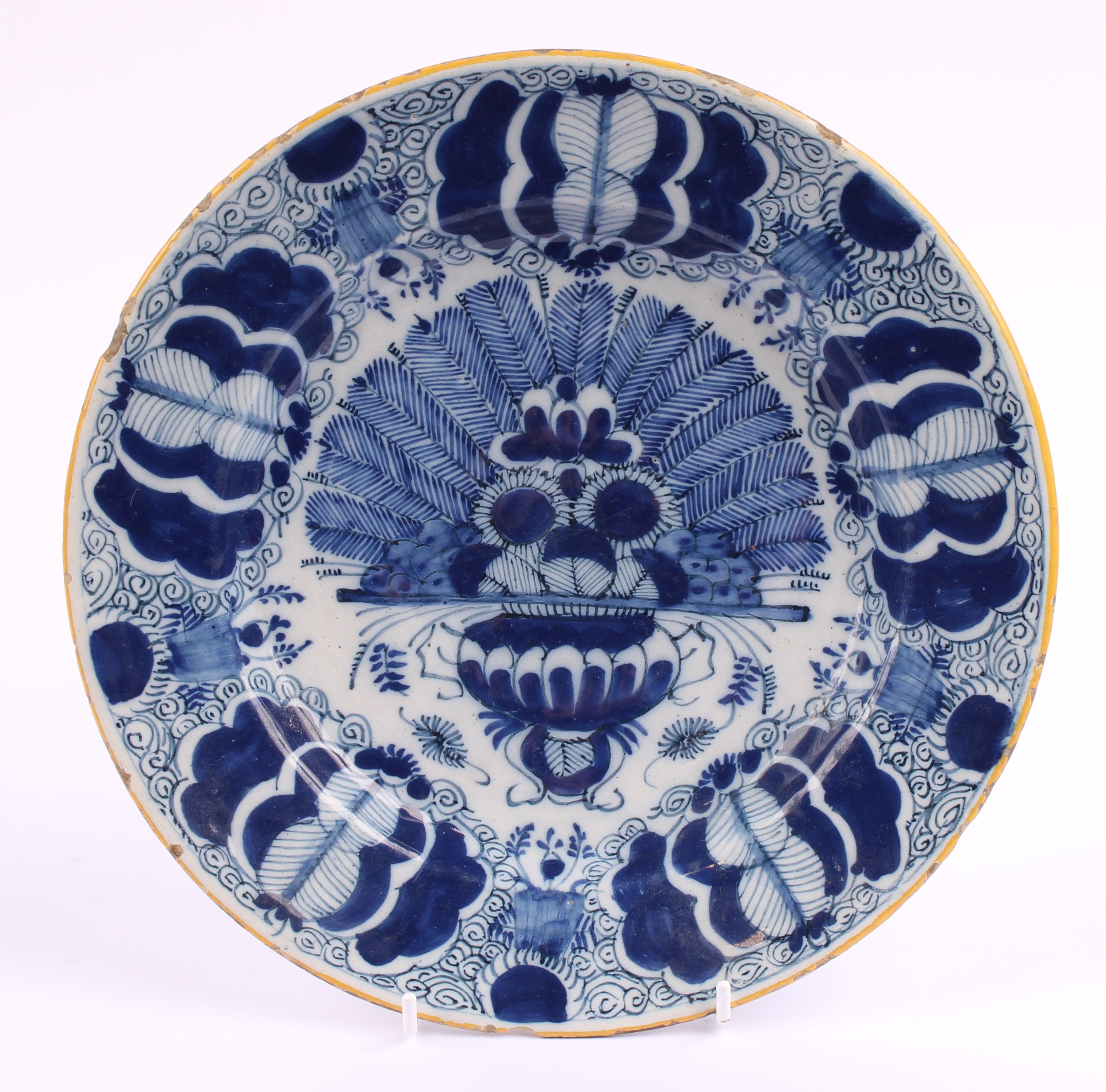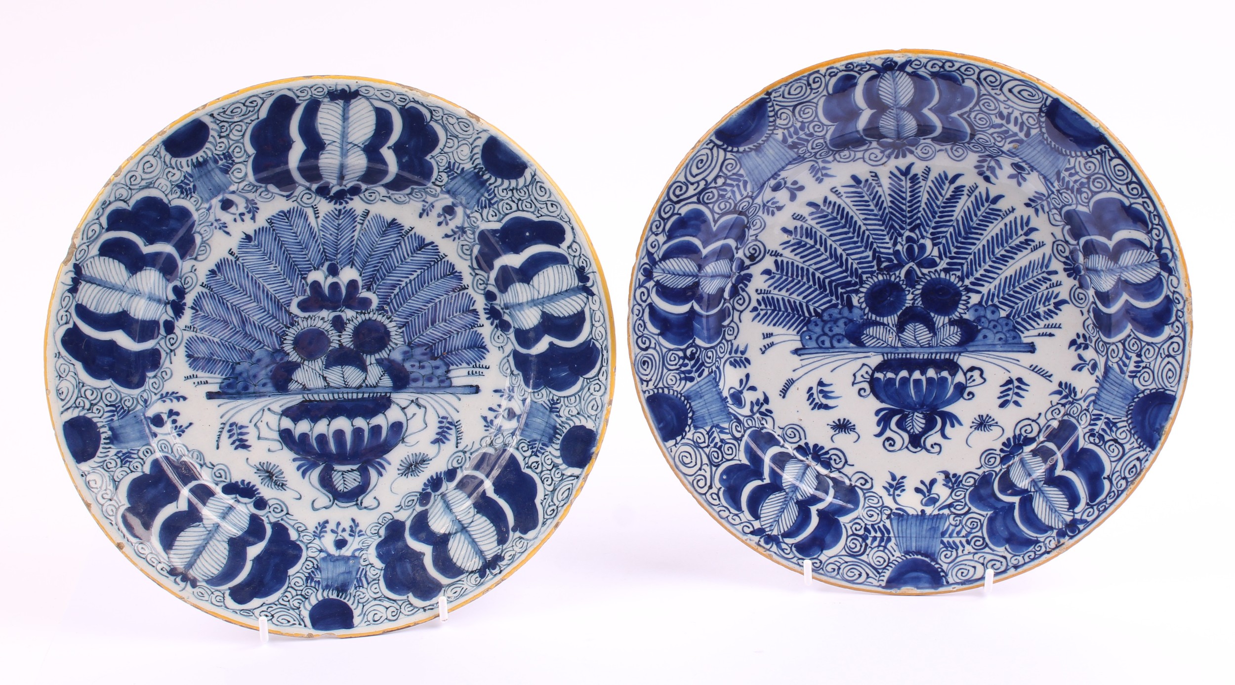 A pair of 18th century Dutch Delft circular plates, painted in tones of blue with vases of flowers and peacock flowers, yellow lines to rims, 27cm diam, Claw (De Klaaw) factory marks, c.1760