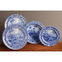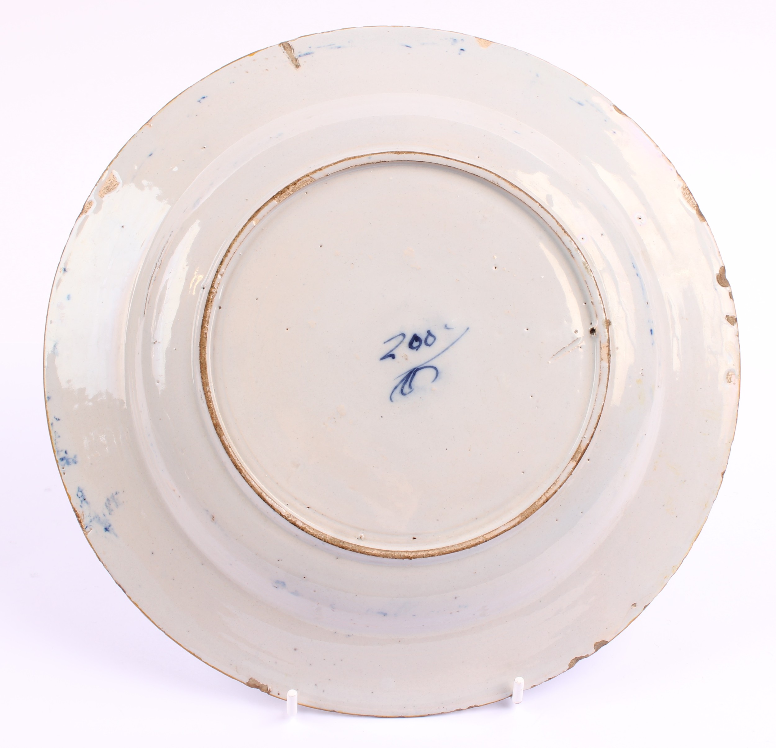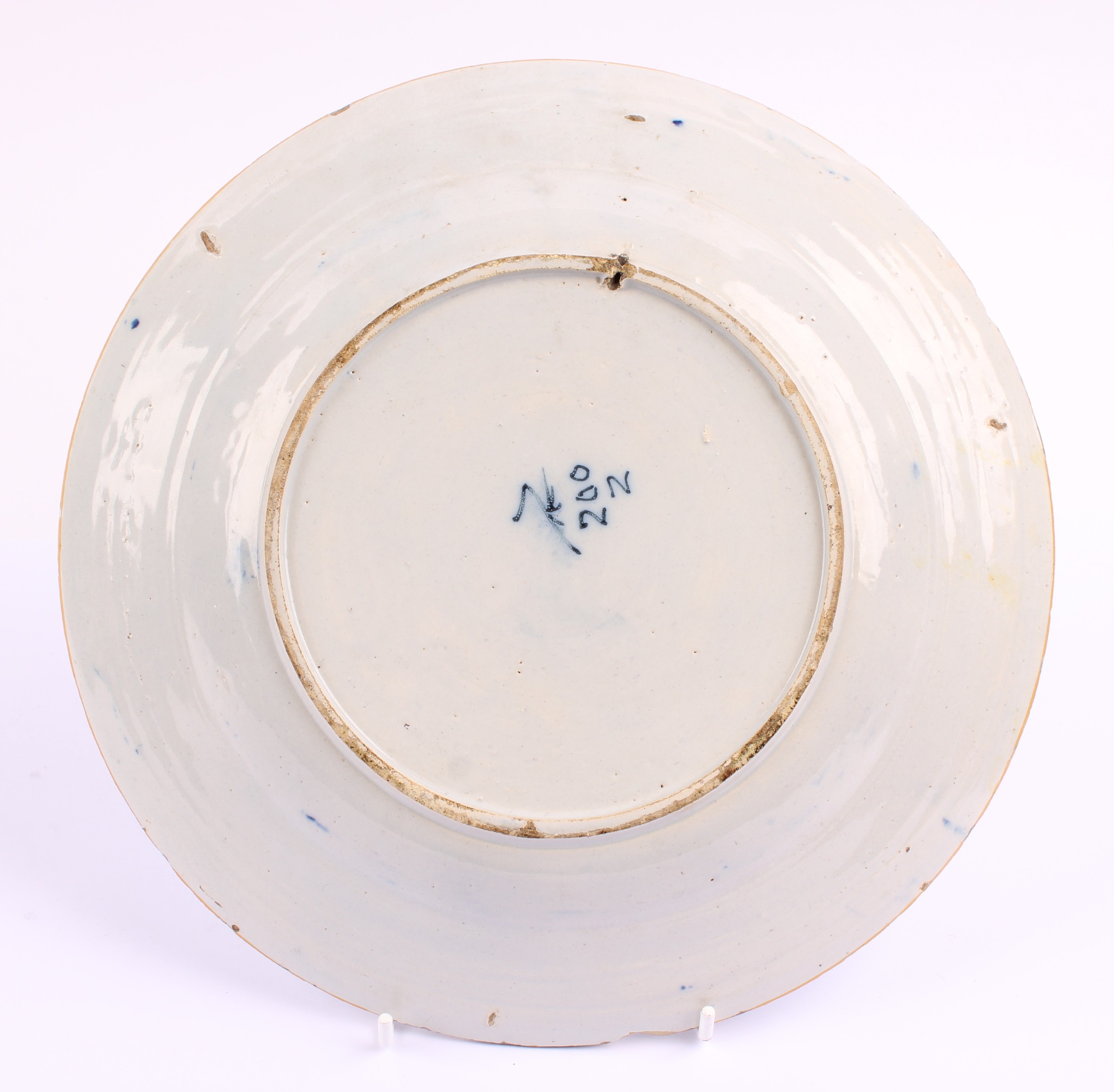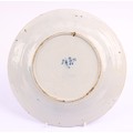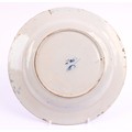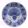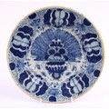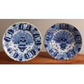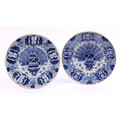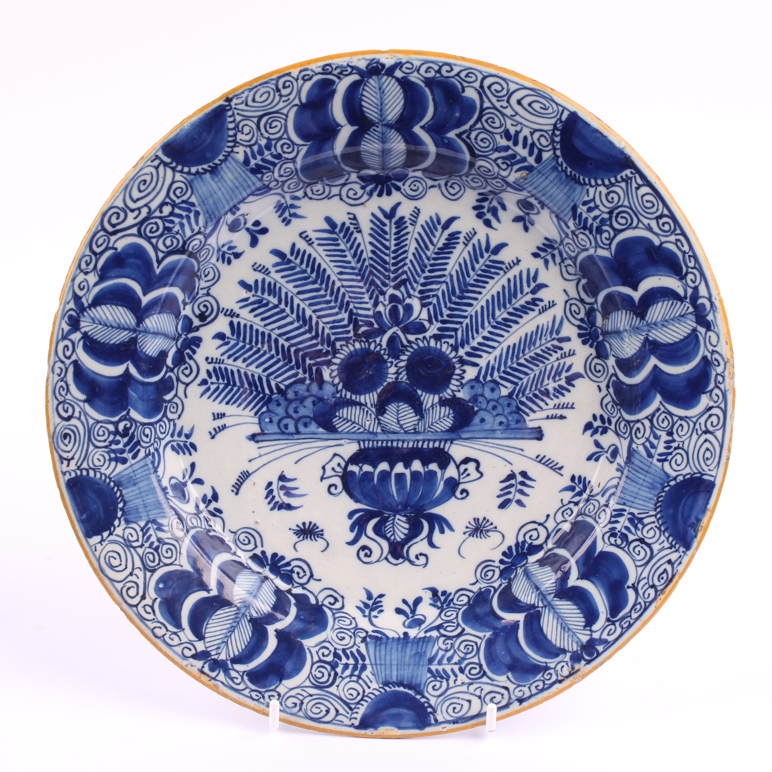A pair of 18th century Dutch Delft circular plates, painted in tones of blue with vases of flowers and peacock flowers, yellow lines to rims, 27cm diam, Claw (De Klaaw) factory marks, c.1760