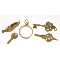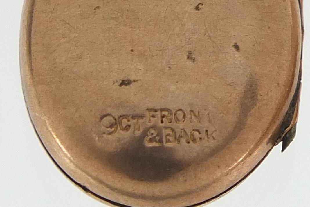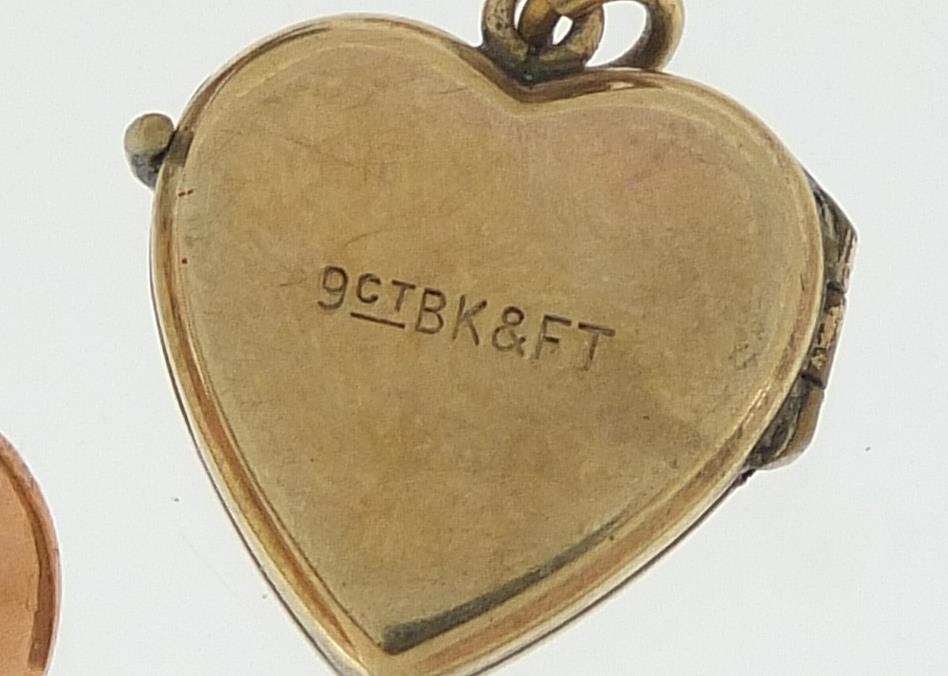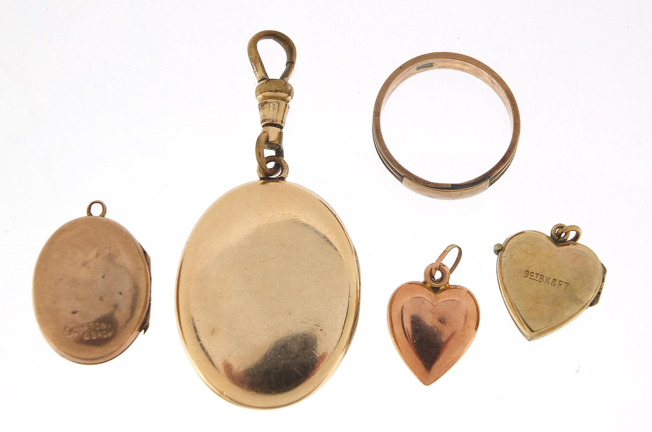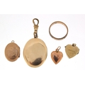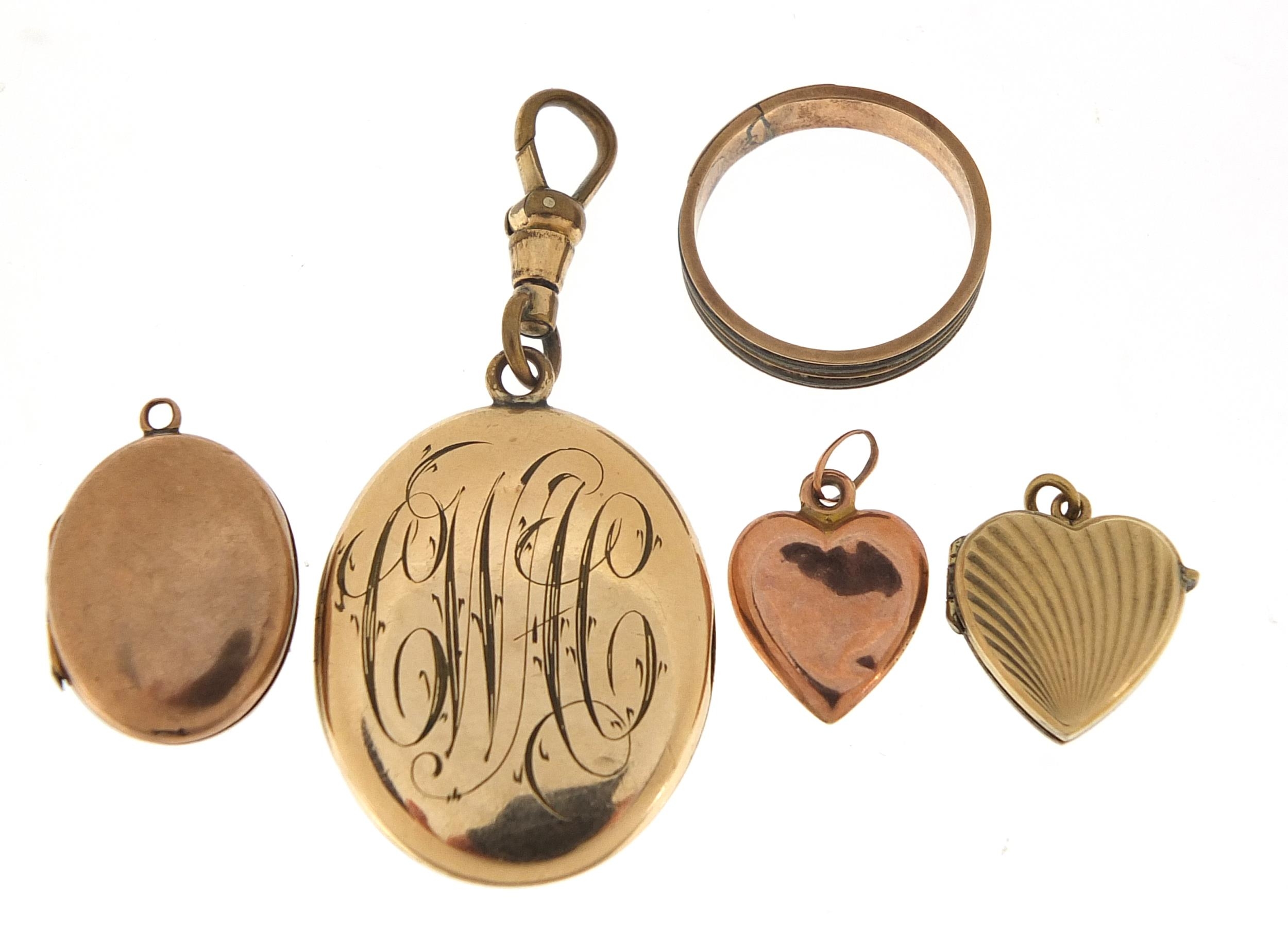 Four 9ct gold back and front lockets and a 9ct gold elephant hair ring, total 14.8g