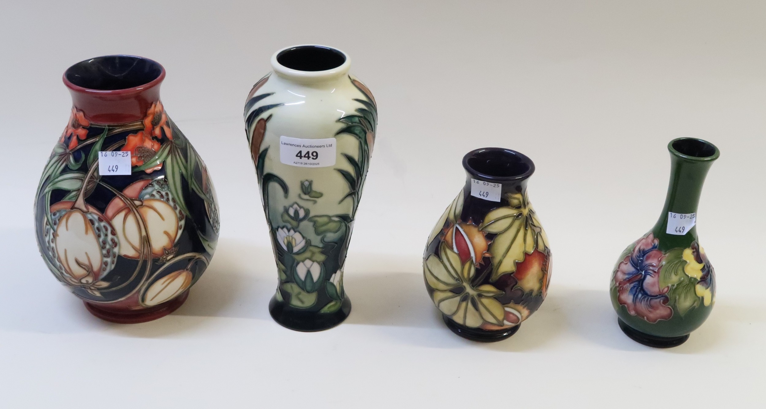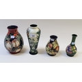 Group of three various Moorcroft floral decorated pottery vases, the tallest 20.5cm high, together with another Moorcroft vase (with restoration to rim)