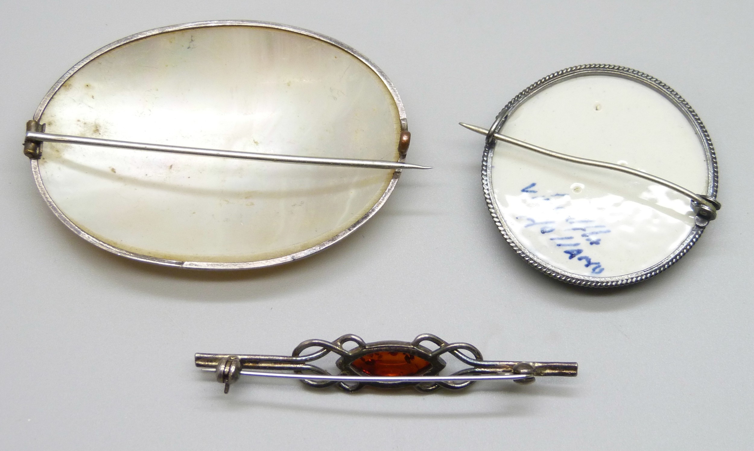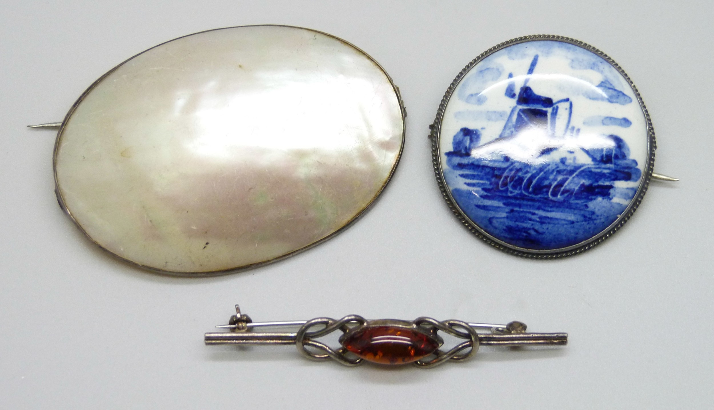 A large early 20th Century white metal and mother of pearl brooch, a white metal framed Dutch delft brooch, tests as silver, and a silver and amber style brooch, 5.5cm